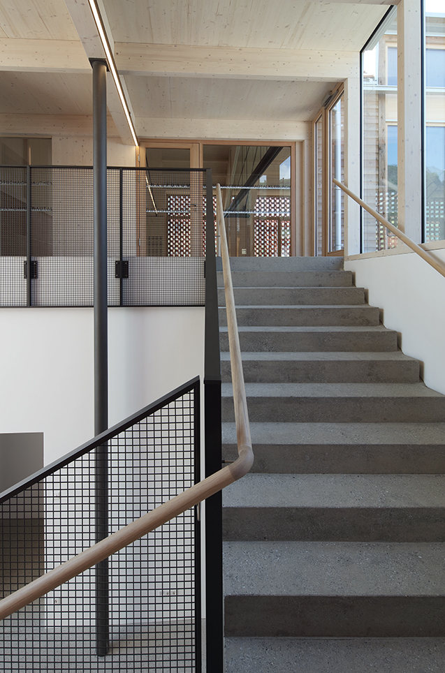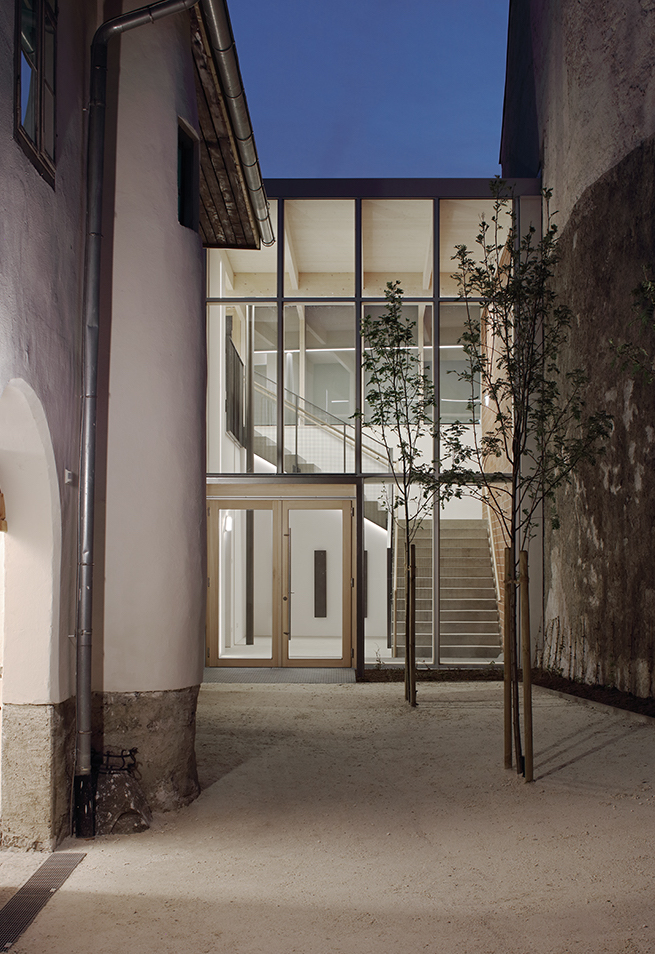 Durch den stimmungsvollen Durchgang des unter den wachsamen Augen des BDA mustergültig renovierten Umfahrer-Hauses betritt man einen offenen ruhigen Innenhof mit vier Vogelbeerbäumen. Von hier gelangt man zum lichtdurchfluteten Foyer und Stiegenhaus, das durch großzügige Verglasungen die Lienzer Dolomiten und den Hausberg Hochstadel gleichsam in den Raum einlädt. Das ist keine Notlösung, sondern eine sensible Inszenierung des Ankommens, die Drinnen und Draußen, Alt und Neu entspannt verknüpft und eben ein weiteres Gebäude sinnvoll integriert.