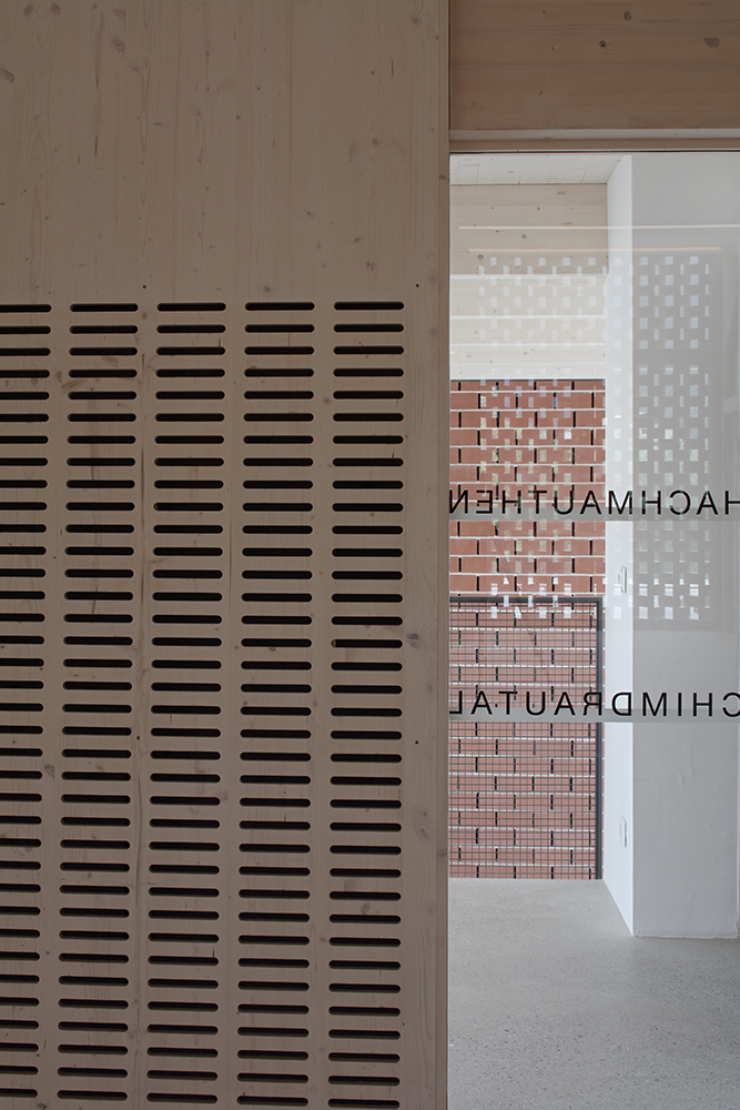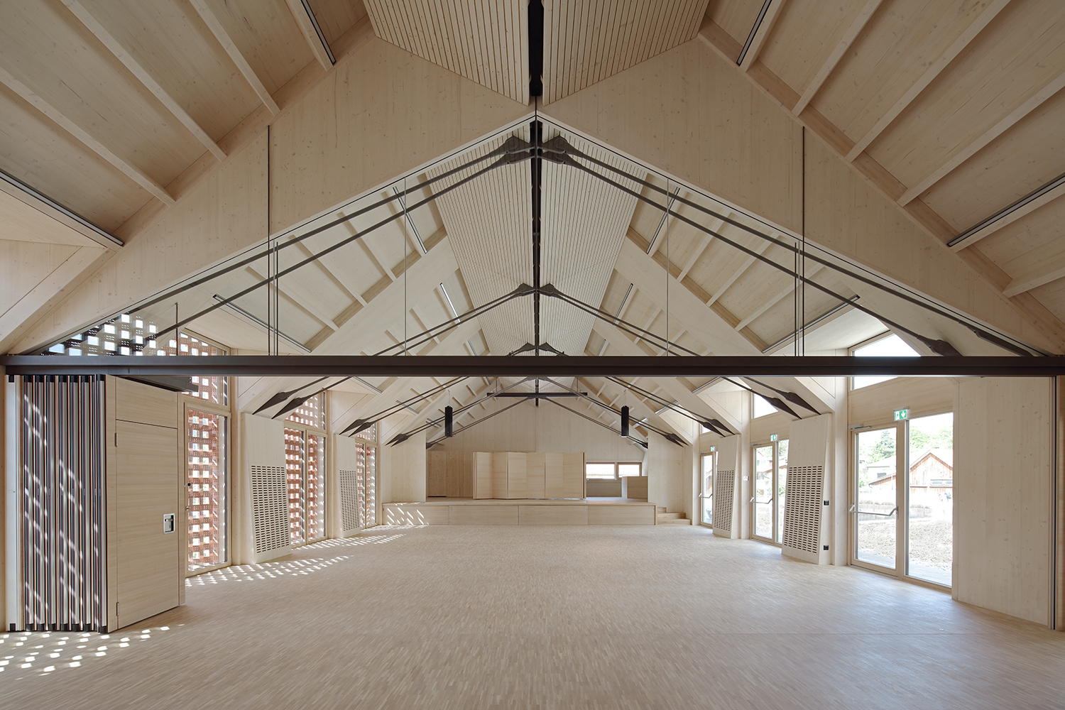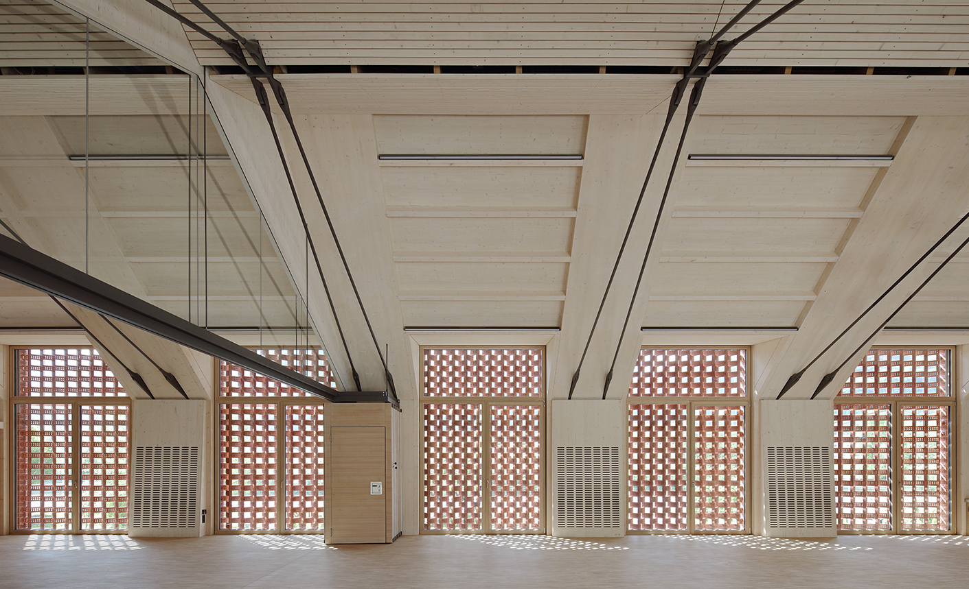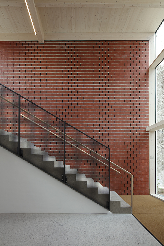 Der Innenraum des Kultursaales im Obergeschoß ist kraftvoll, dennoch bleibt die Architektursprache fein. Die fünf großen, auffallenden Ziegelgitter-Fenster an der Hauptfront zur Straße verbinden das Bauwerk symbolisch mit dem historischen Ortskern, wo noch einige Gebäude diese traditionelle Fenster- bzw. Lüftungsgestaltung aufweisen. Im Inneren spielen sie mit der Südsonne und erzeugen zarte Lichtspiele. Die dazwischenliegenden, jeweils paarweise angeordneten Stahlseile bilden auffallende Akzente. Die imposante Struktur dieses offenen Daches bot gemeinsam mit dem Aufbau des Saals über dem Nahversorger bzw. über dem Erdgeschoß des Nachbarhauses und der Unterbringung der Lüftungstechnik im Dachboden des Umfahrer-Hauses auch statisch einige Herausforderungen.