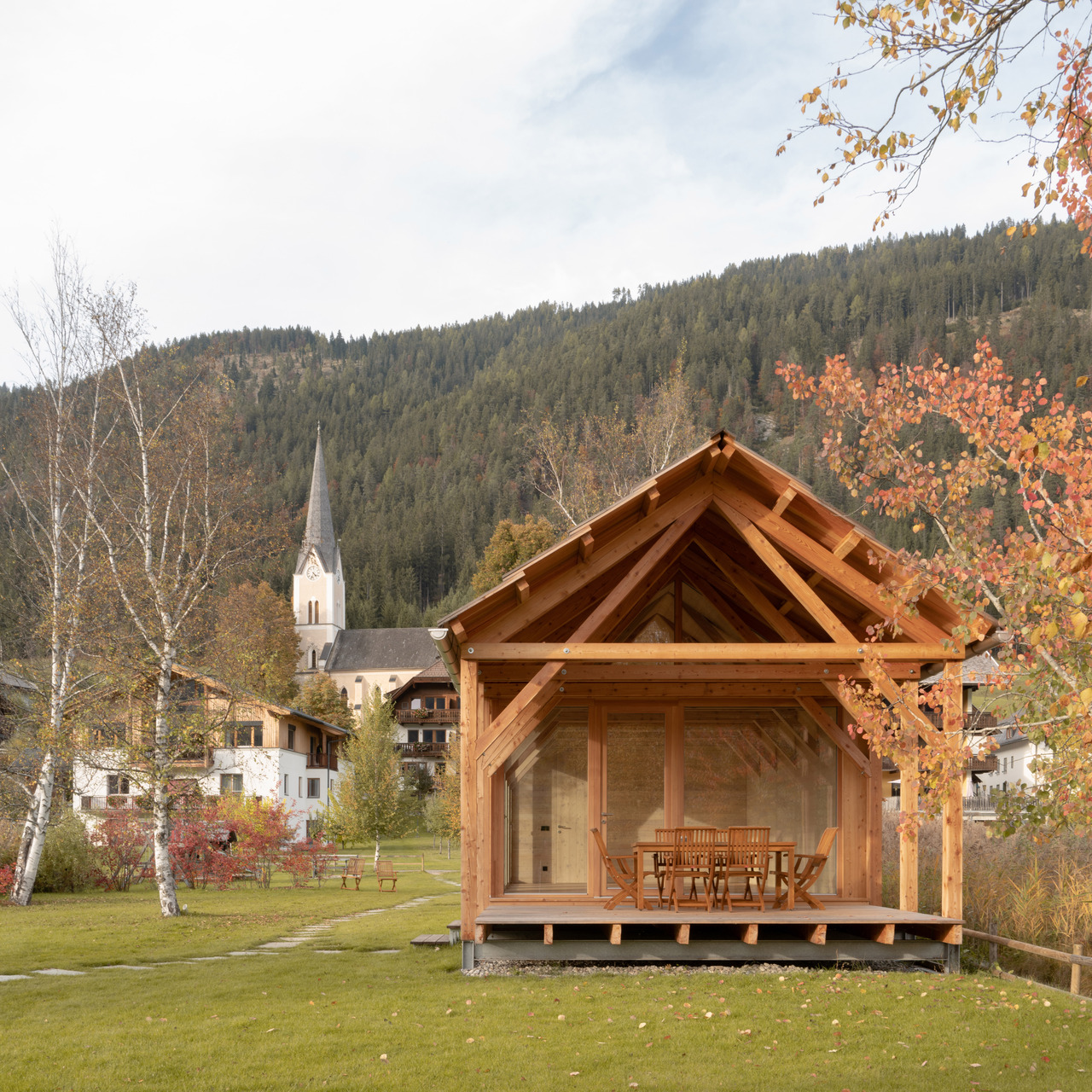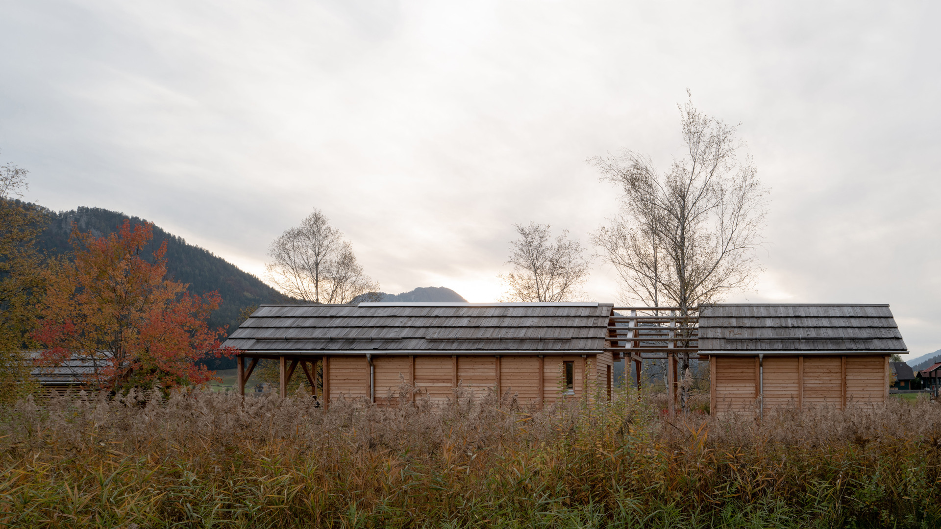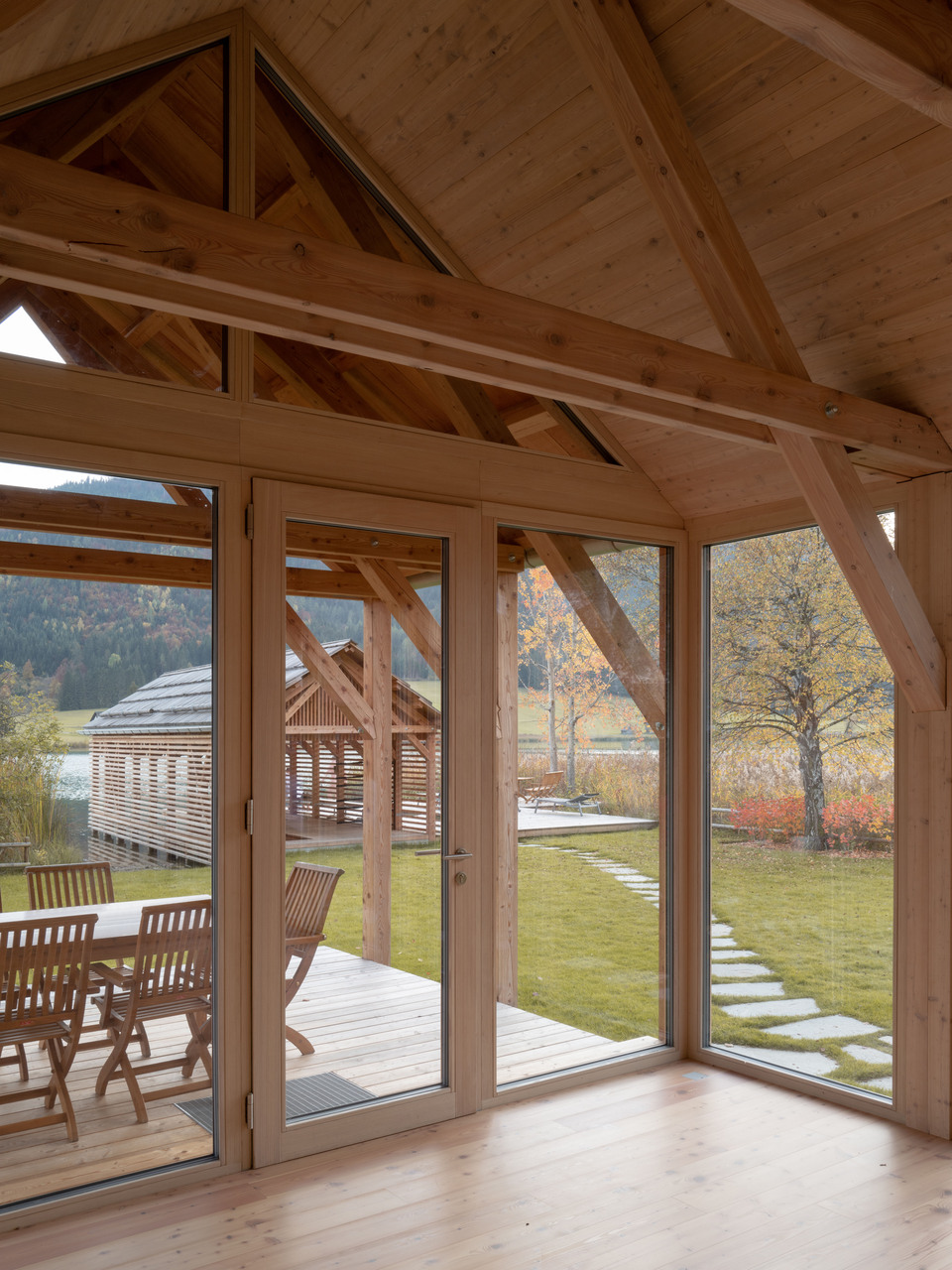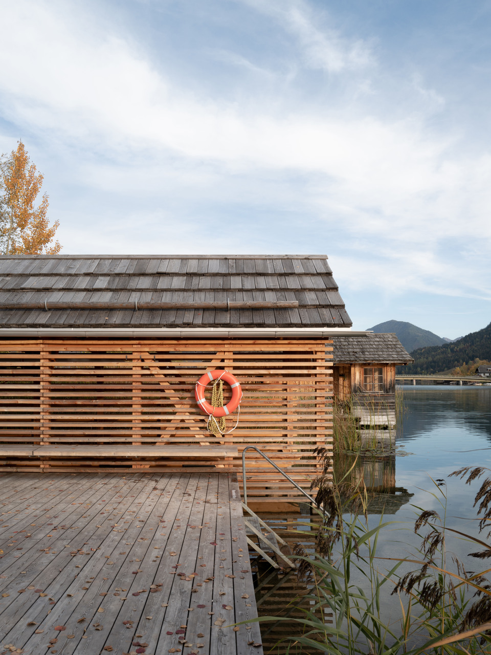 Inspiriert durch die um den Weißensee immer wieder vorzufindenden Holzkonstruktionen zur Trocknung des Heus (Harpfen) - wurden die zwei Häuser am Wasser als einfache Holzstrukturen entwickelt.