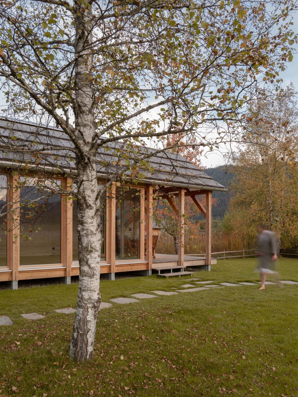 Das etwas vom Ufer abgerückte zweite Haus bildet im Osten des Grundstücks einen Abschluss und vermittelt zwischen den Hütten an der Uferkante und den Häusern im Dorf. Der langgestreckte Baukörper gliedert sich in zwei Nutzungseinheiten und lässt die bestehende Birke im Zwischenraum weiterwachsen.
