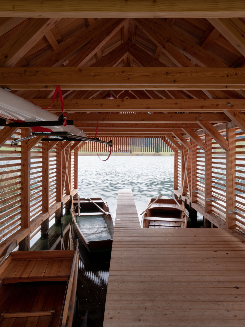 Das Bootshaus direkt am Ufer nimmt die Proportion der Nachbarbebauung auf und bietet durch die offen gestaltete horizontale Fassadenlattung Durchblicke zum See.