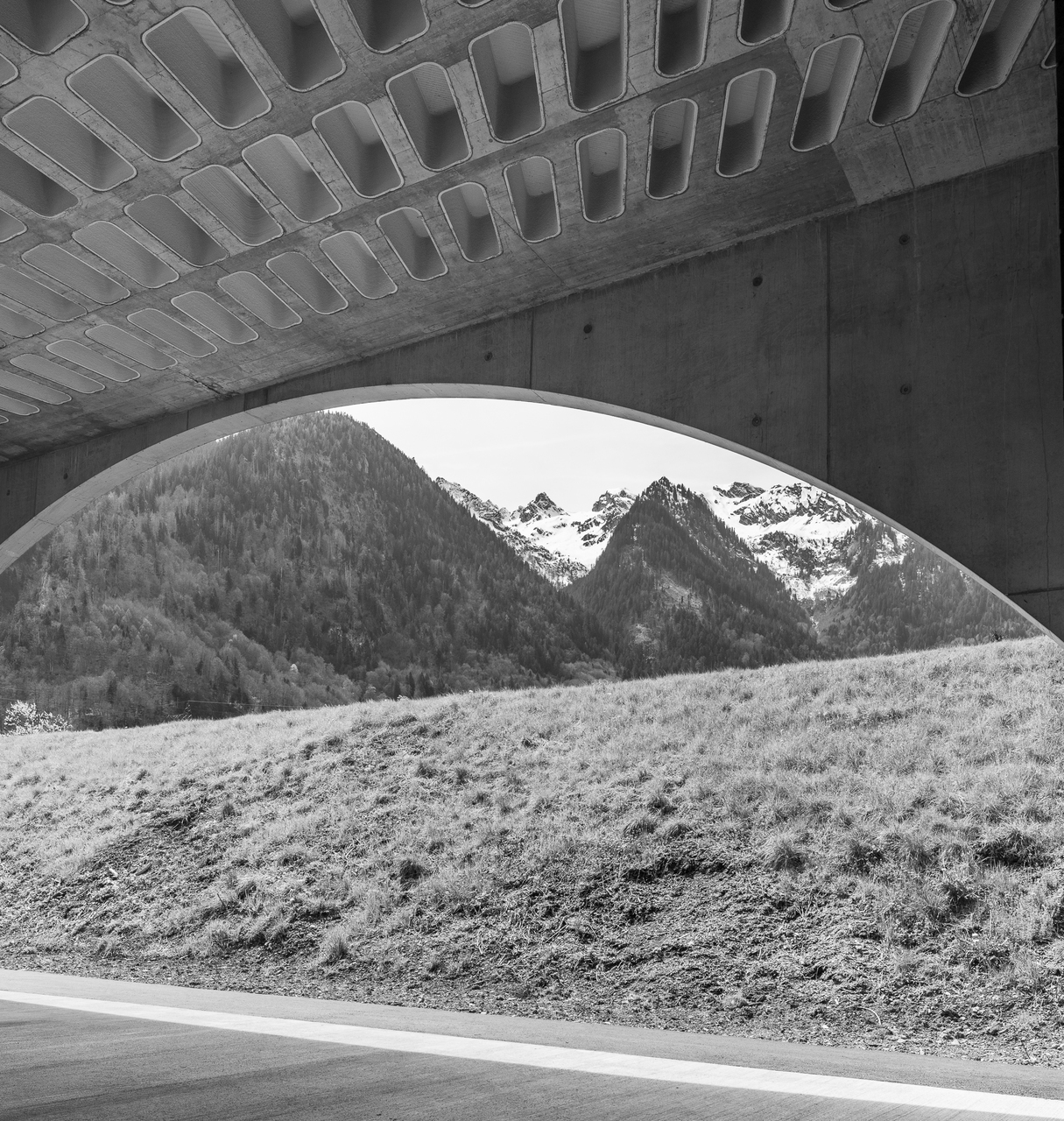 Auf den beiden 46 m langen Stützbögen liegt die ca. 720 m² große Ortbetonkassettendecke. Diese grundsätzlich seit den 1960er Jahren bekannte Konstruktionsweise wird in Zeiten von Ressourcenknappheit und CO2-Besteuerung zunehmend attraktiv: Die Materialeinsparung rechtfertigt den erhöhten Schalungsaufwand gegenüber konventionellen Flachdecken. Am Institut für Tragwerksentwurf der TU Graz wurde eine wirtschaftliche Konstruktionsweise für filigrane Rippendecken entwickelt. In Zusammenarbeit mit dem Ingenieurbüro gbd aus Dornbirn kam diese innovative Methode des Betonleichtbaus zur Umsetzung: 3D-gedruckte Schalungskörper aus Beton werden dabei als verlorene Schalung mit konventionellen Betoniermethoden ergänzt. Die Schalung wird den statischen Anforderungen entsprechend angeordnet und macht so den Kräfteverlauf sichtbar. Zwischen den Aussparungskörpern werden vorgebogene Bewehrungseisen platziert. Mit dieser Methode kann gegenüber einer konventionellen Flachdecke ca. 39% an Material und Energie eingespart werden. Die Decke ist zum Zeitpunkt der Fertigstellung die weltweit größte Konstruktion dieser Art. (Text: Architekten, bearbeitet)