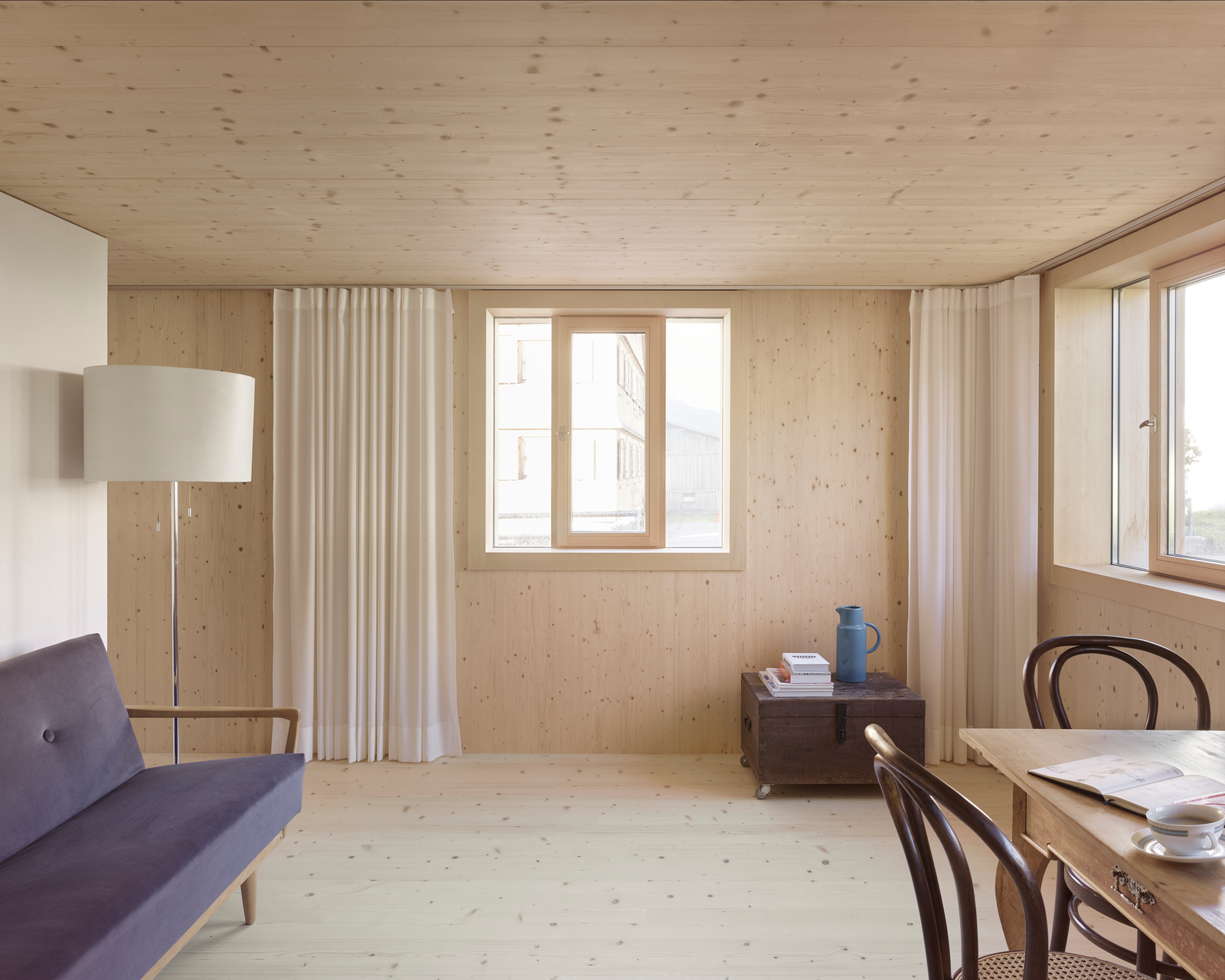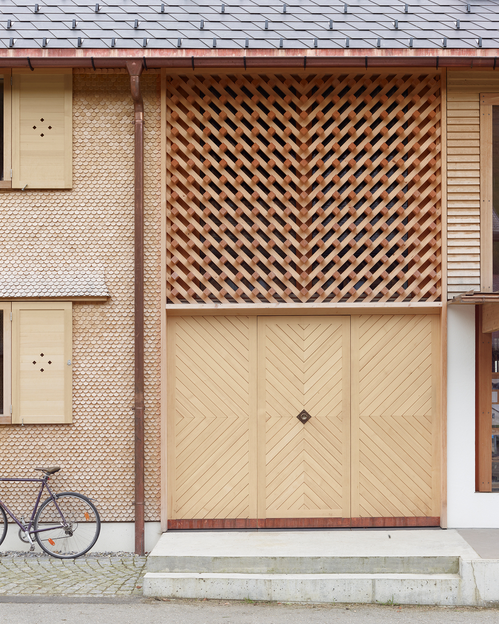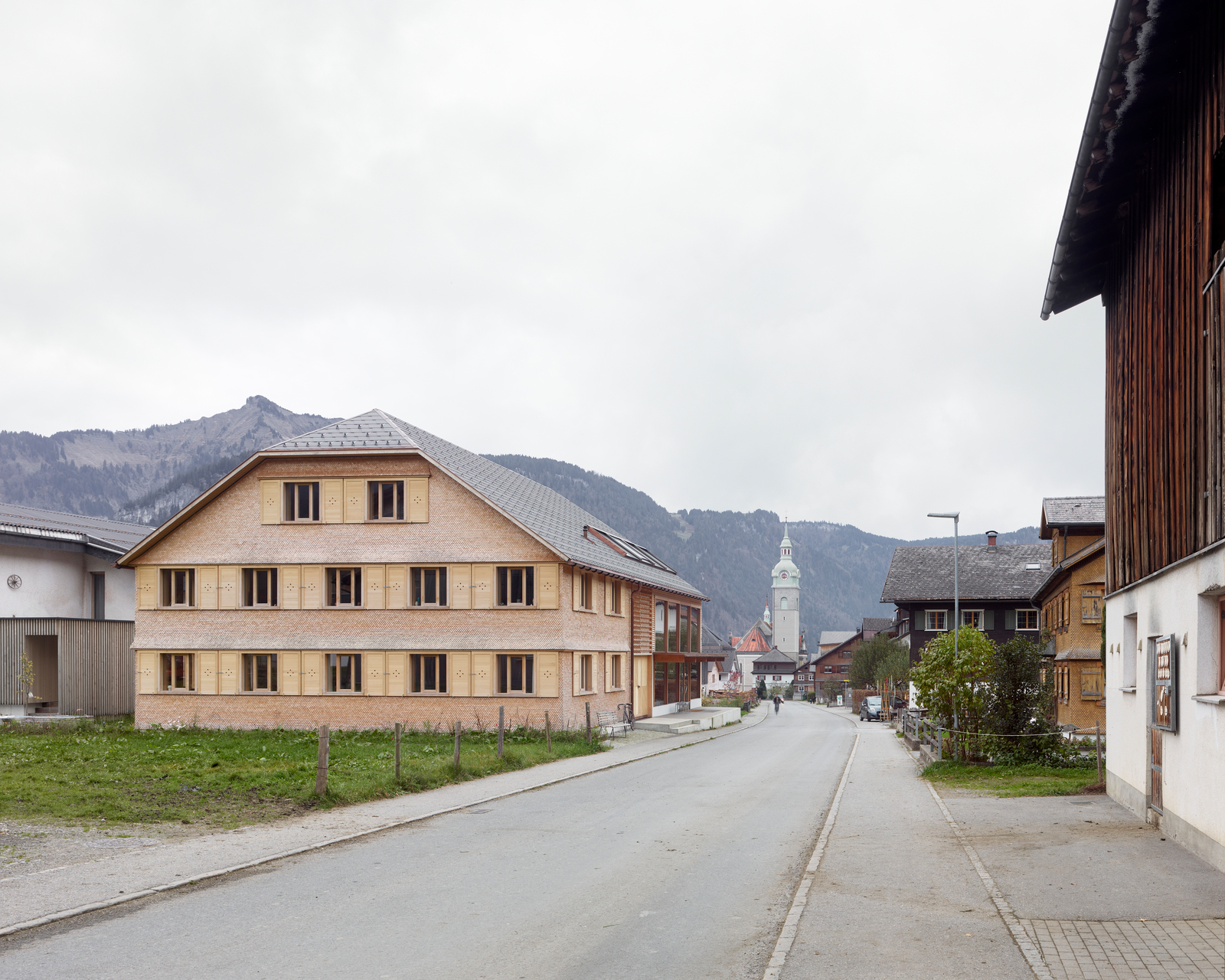 Der Erhalt des Fotostudios stand an erster Stelle. Das typische Bregenzerwälder Vorderhaus war aufgrund seines schlechten Zustandes nicht mehr zu sanieren. So ist entstand um das bauhistorische Juwel des Fotostudios ein neues Haus, das die Formensprache des Bestandes übernimmt, ohne sich anzubiedern. Die ursprüngliche Gliederung des Bregenzerwälderhauses in Vorderhaus, Tenne und Hinterhaus prägt auch die heutige Gebäudestruktur. Der Neubau übernimmt die Typologie und interpretiert sie neu. Unter einem gemeinsamen Dach finden nun drei Wohnungen und Architekturbüro Platz, das sich über drei Geschosse erstreckt. Hier wird wieder gelebt und gewohnt. Obwohl alles neu erscheint, blieb der ursprüngliche Geist des Besonderen erhalten. Über das große Schaufenster strahlt er in das Dorf hinaus. (Text: Architekten, bearbeitet)