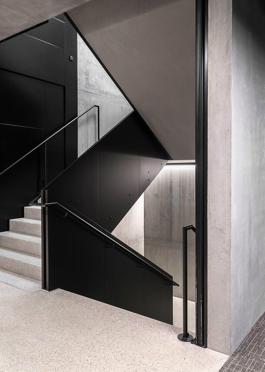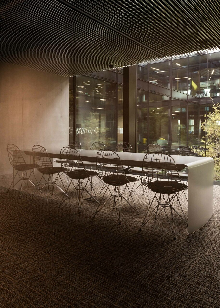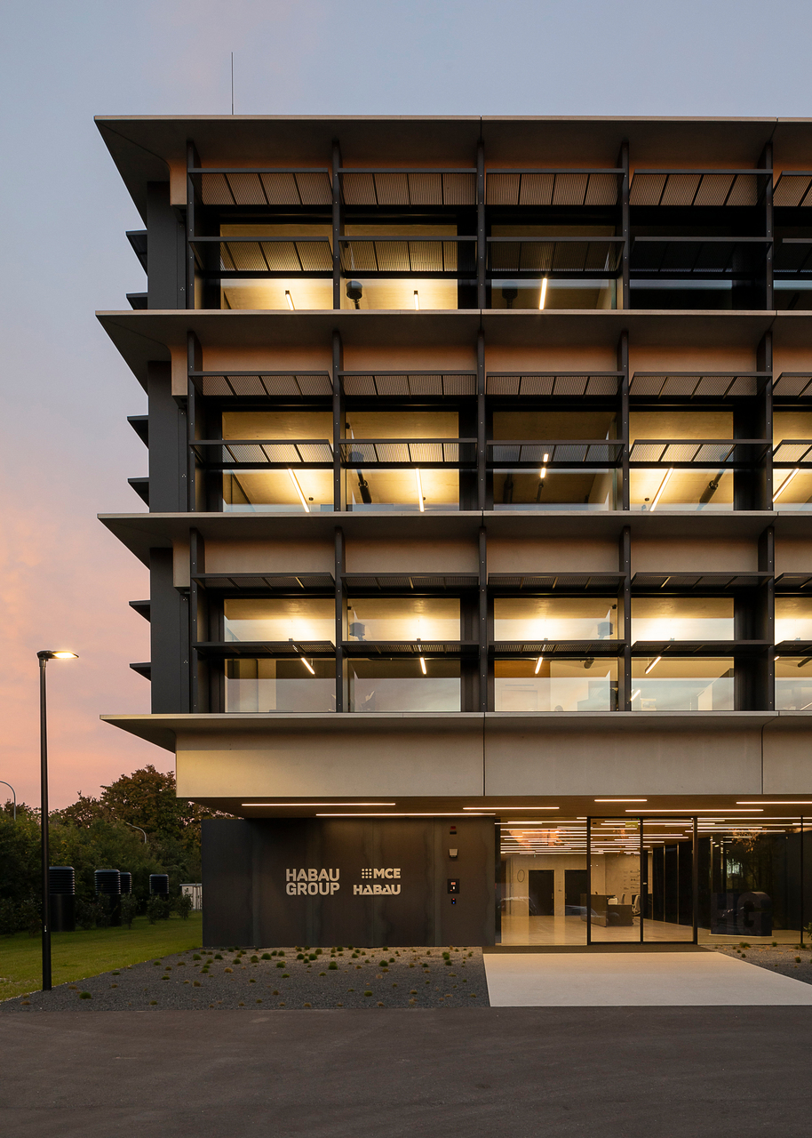 Den nötigen Sonnenschutz gewährleisten sonnenstandgesteuerte, mit Streckmetall belegte Klapplamellen. Das Gebäude ist vollständig mechanisch be- und entlüftet. Alle Büros sind über Betonkernaktivierung gekühlt und beheizt, ergänzend zur Fußbodenheizung. Nicht nur der Beton wurde sichtig belassen, auch die Gebäudetechnik wird nicht versteckt. Sämtliche Leitungsführungen sind – in einheitlicher Farbe beschichtet – sichtbar an der Decke geführt, auf abgehängte Decken konnte weitgehend verzichtet werden. Die Besprechungsräume wurden jeweils materialspezifisch gestaltet. So wurden etwa im Besprechungsraum „Beton“ die Schaltafeln, die bei den Sichtbetondecken verwendet wurden, als Akustik-Lamellendecke wiederverwendet. (Text: Architekten, bearbeitet)