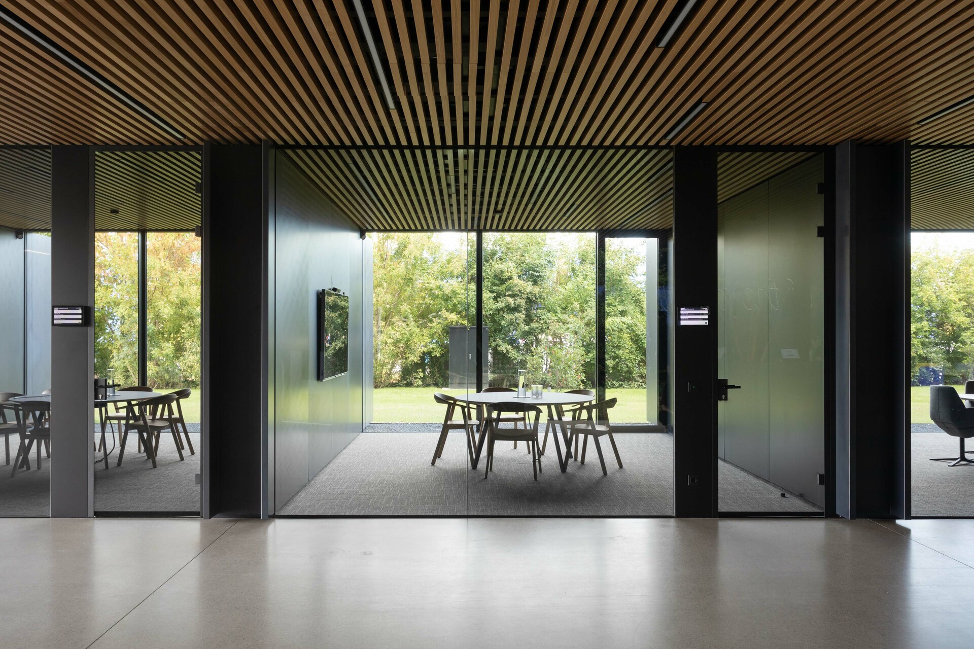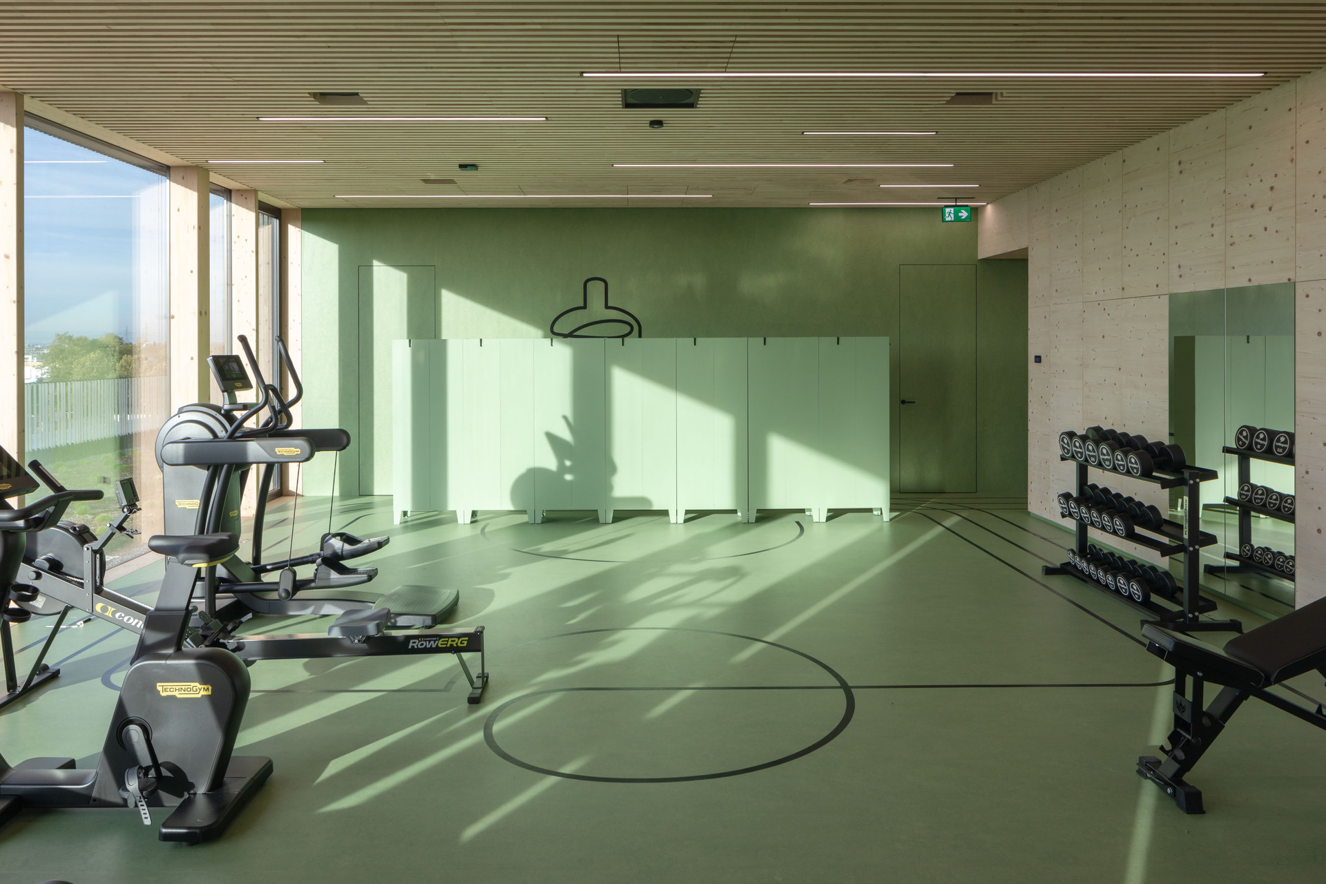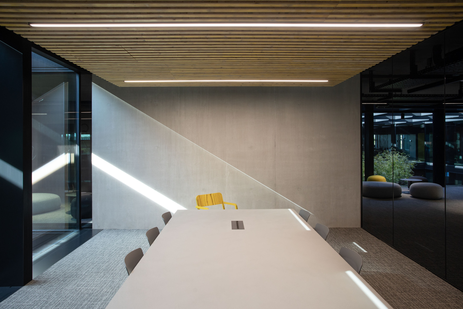 Den nötigen Sonnenschutz gewährleisten sonnenstandgesteuerte, mit Streckmetall belegte Klapplamellen. Das Gebäude ist vollständig mechanisch be- und entlüftet. Alle Büros sind über Betonkernaktivierung gekühlt und beheizt, ergänzend zur Fußbodenheizung. Nicht nur der Beton wurde sichtig belassen, auch die Gebäudetechnik wird nicht versteckt. Sämtliche Leitungsführungen sind – in einheitlicher Farbe beschichtet – sichtbar an der Decke geführt, auf abgehängte Decken konnte weitgehend verzichtet werden. Die Besprechungsräume wurden jeweils materialspezifisch gestaltet. So wurden etwa im Besprechungsraum „Beton“ die Schaltafeln, die bei den Sichtbetondecken verwendet wurden, als Akustik-Lamellendecke wiederverwendet. (Text: Architekten, bearbeitet)