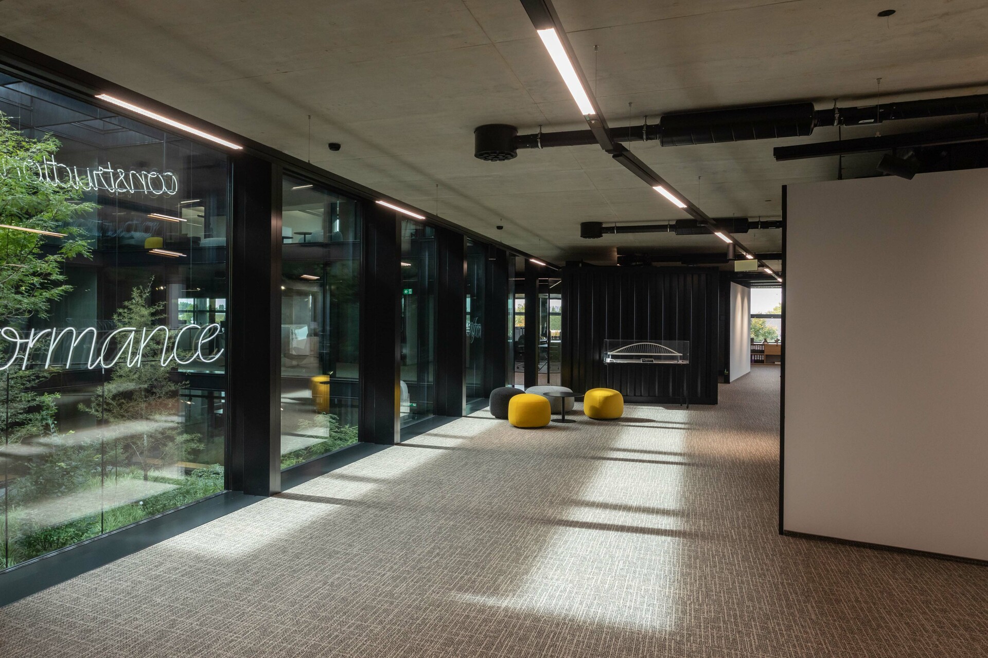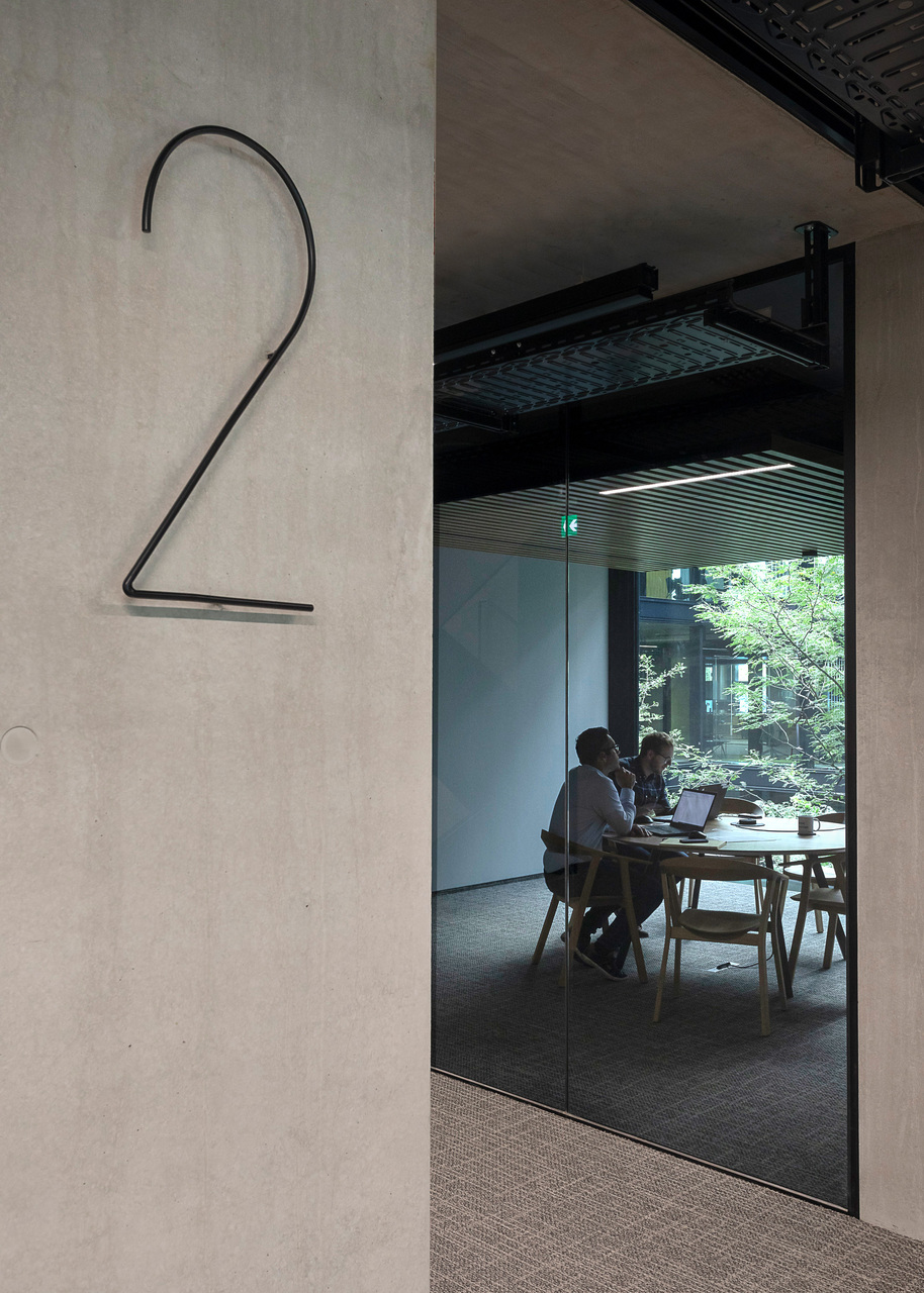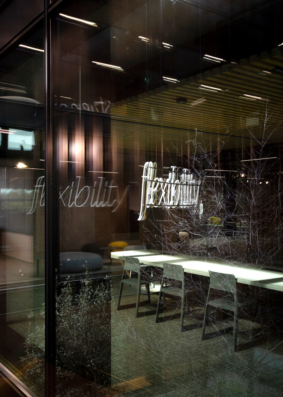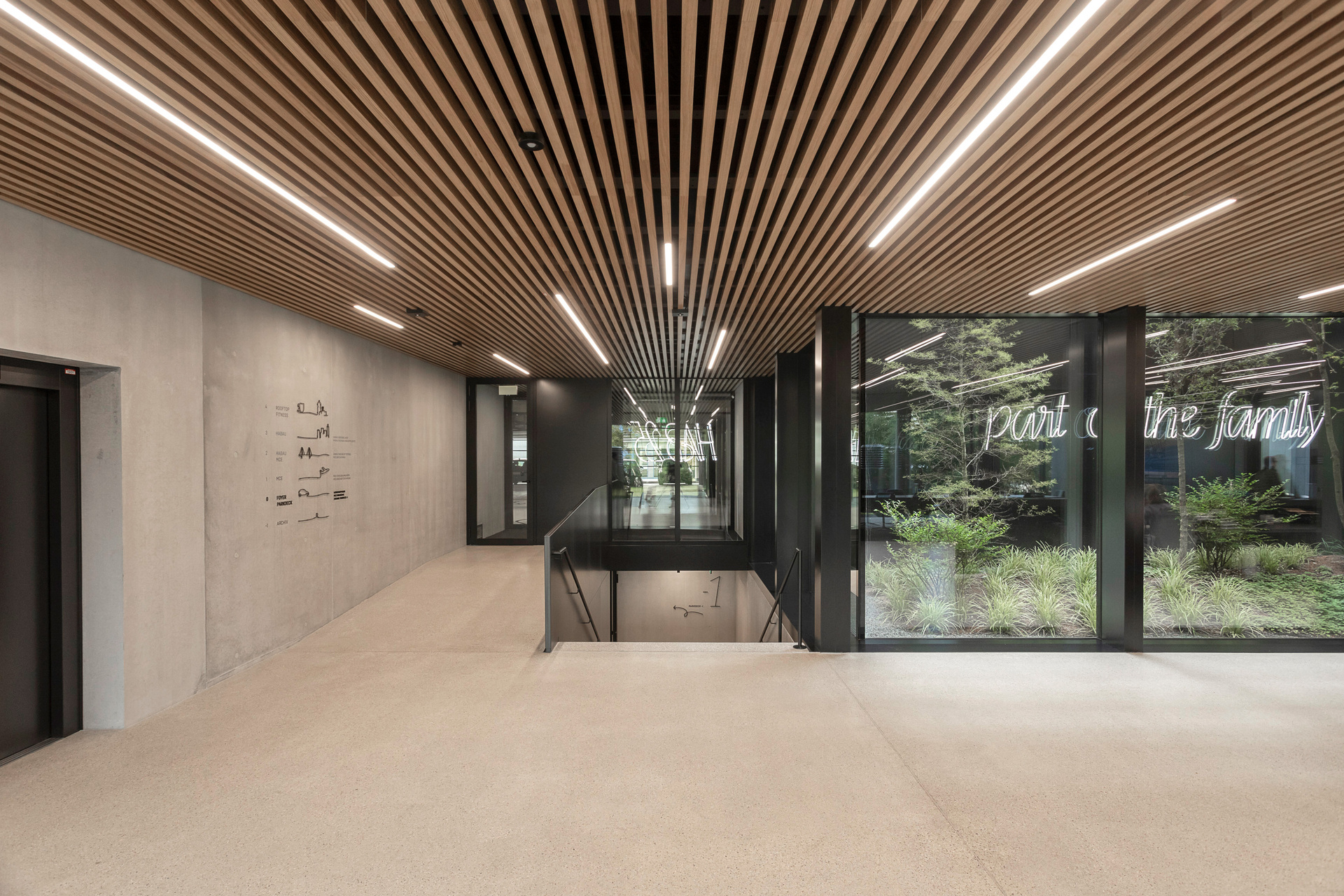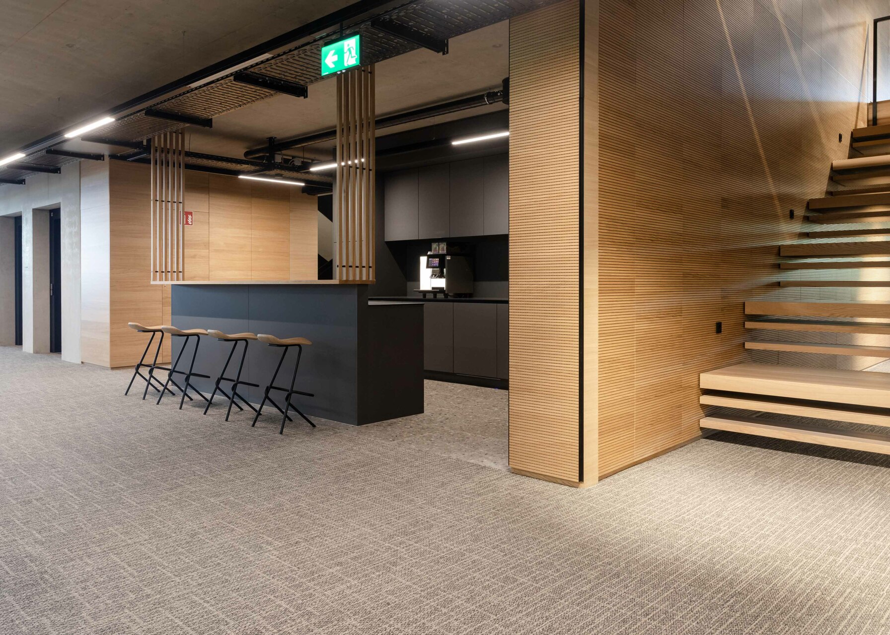 Das Interior-Konzept folgt den Standards des „new work“. Die flexible Arbeitsplatzgestaltung erlaubt es allen Mitarbeiter:innen der Habau Group, den Standort in Linz zu nutzen – sei es auf Durchreise für ein Meeting, zum Arbeiten oder zum Austausch. Die Gebäudestruktur macht interne Veränderungen einfach realisierbar, die Arbeitsplätze sind von den Mitarbeiter:innen frei wählbar gestaltet. Ausreichend Rückzugsbereiche ermöglichen konzentriertes Arbeiten innerhalb dieser offenen Bürolandschaft. Für persönlichen Austausch eignen sich Bereiche wie die Teeküche neben der internen Treppe. Letztere dient auch als Tribüne oder Präsentationsbereich. Die große, begrünte Terrasse vor den zurückgesetzten Dachaufbauten in Holzbauweise ist ebenfalls beliebter Treffpunkt und Rückzugsort. Am Dach befindet sich auch die unternehmenseigene Kantine. Ein Fitnessstudio steht den Mitarbeiter:innen rund um die Uhr kostenfrei zur Verfügung.
