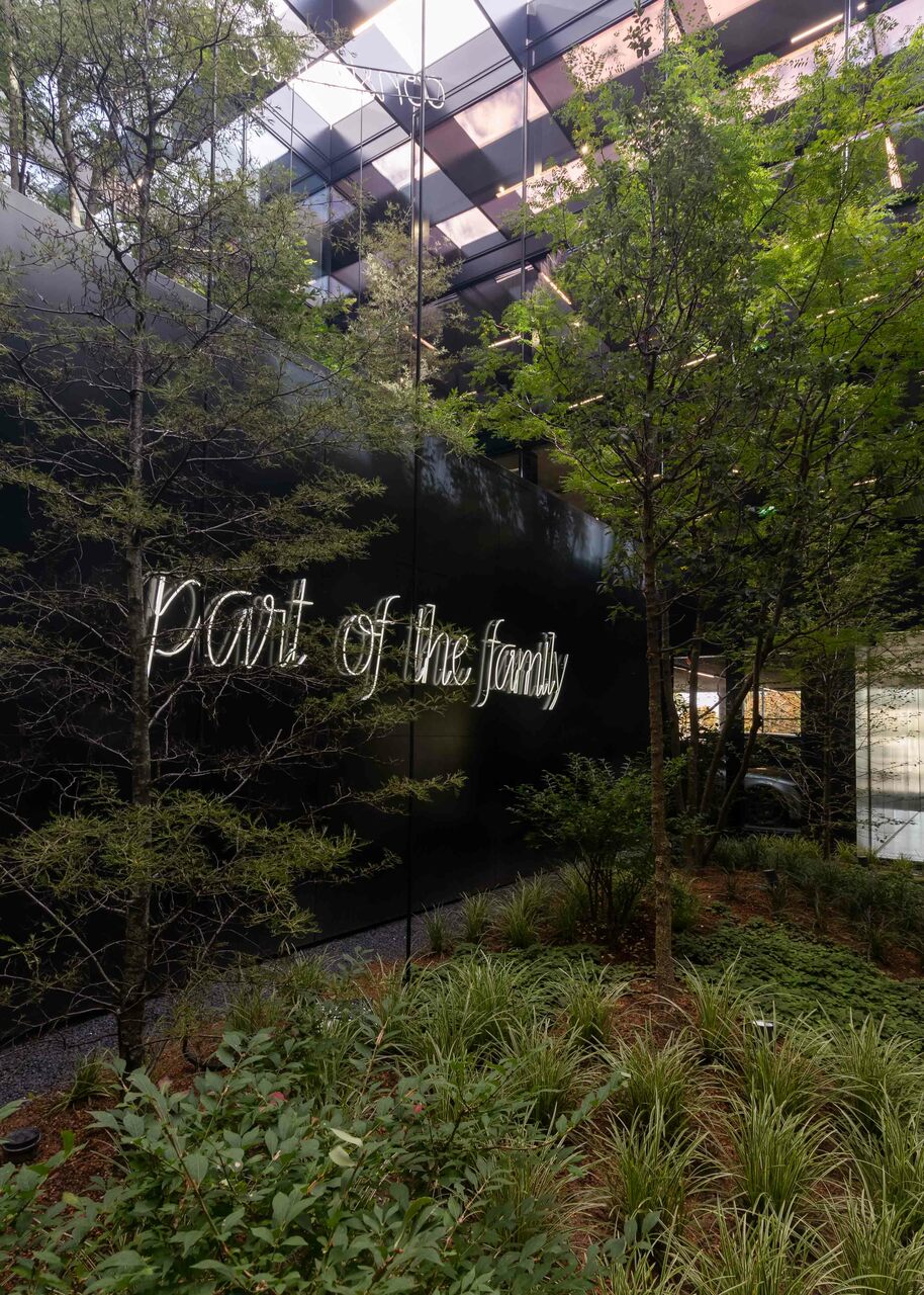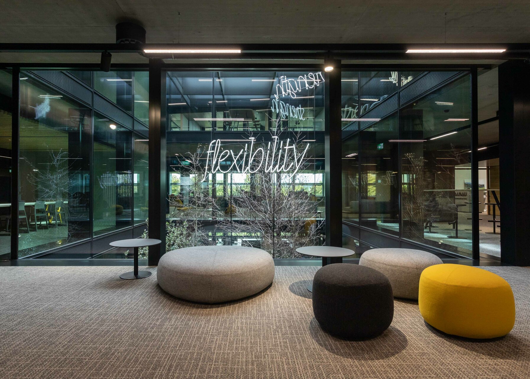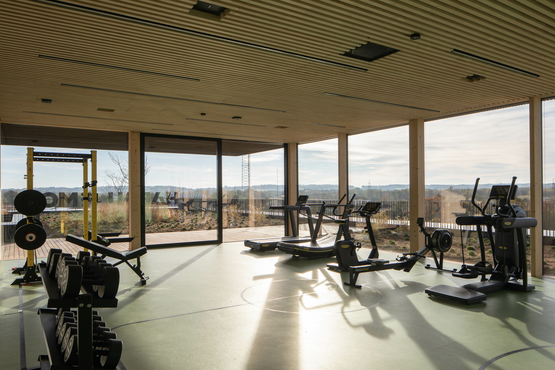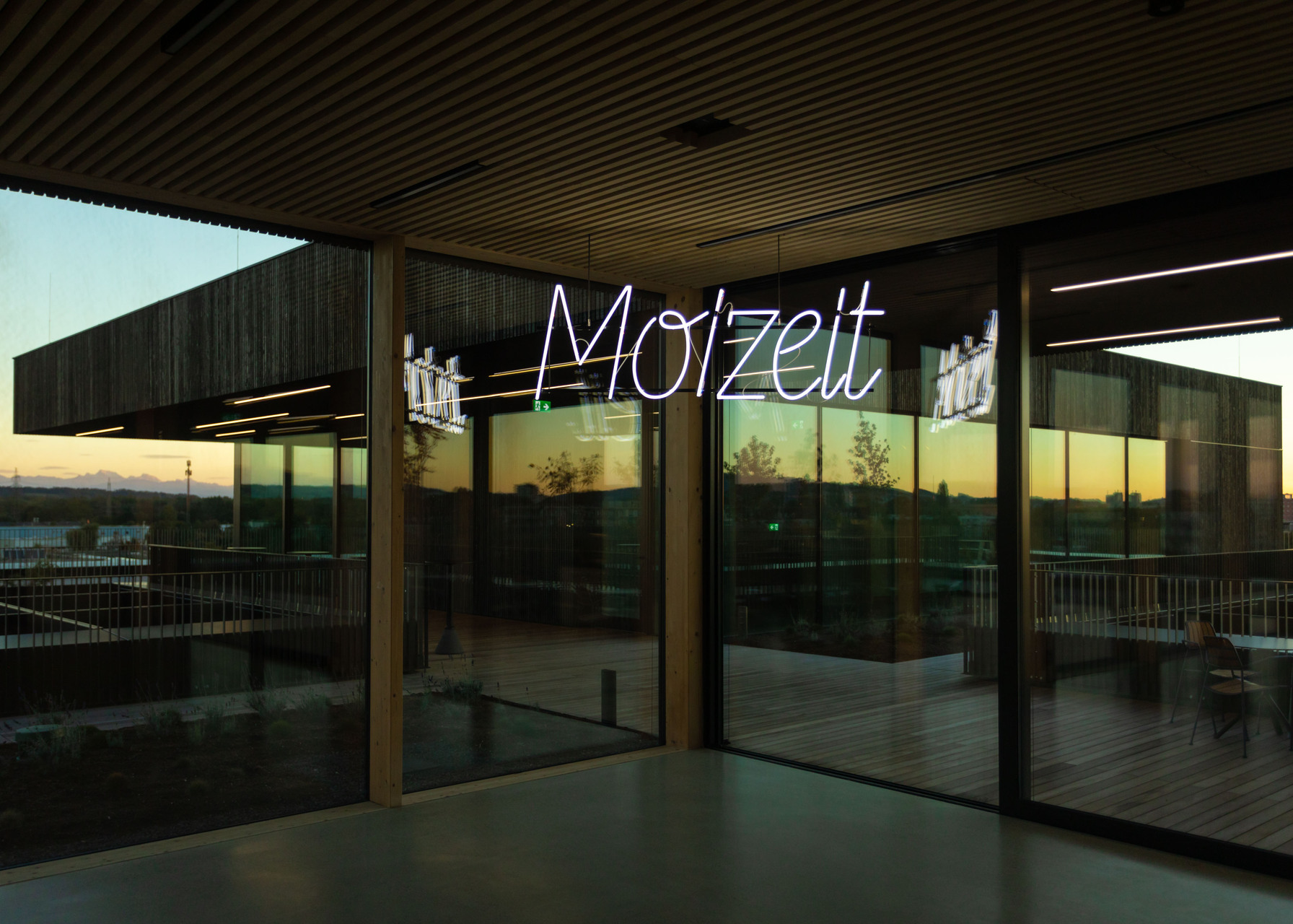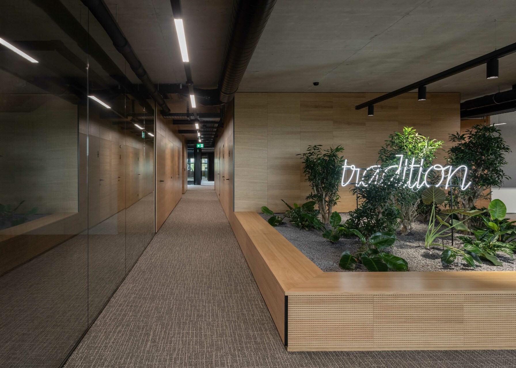 Das Interior-Konzept folgt den Standards des „new work“. Die flexible Arbeitsplatzgestaltung erlaubt es allen Mitarbeiter:innen der Habau Group, den Standort in Linz zu nutzen – sei es auf Durchreise für ein Meeting, zum Arbeiten oder zum Austausch. Die Gebäudestruktur macht interne Veränderungen einfach realisierbar, die Arbeitsplätze sind von den Mitarbeiter:innen frei wählbar gestaltet. Ausreichend Rückzugsbereiche ermöglichen konzentriertes Arbeiten innerhalb dieser offenen Bürolandschaft. Für persönlichen Austausch eignen sich Bereiche wie die Teeküche neben der internen Treppe. Letztere dient auch als Tribüne oder Präsentationsbereich. Die große, begrünte Terrasse vor den zurückgesetzten Dachaufbauten in Holzbauweise ist ebenfalls beliebter Treffpunkt und Rückzugsort. Am Dach befindet sich auch die unternehmenseigene Kantine. Ein Fitnessstudio steht den Mitarbeiter:innen rund um die Uhr kostenfrei zur Verfügung.