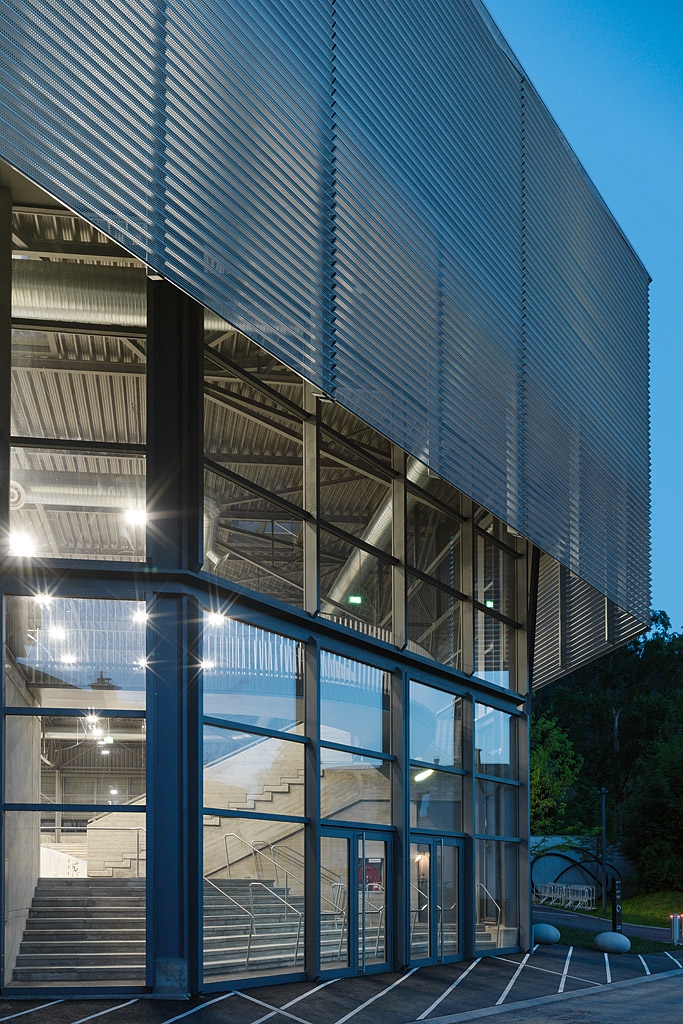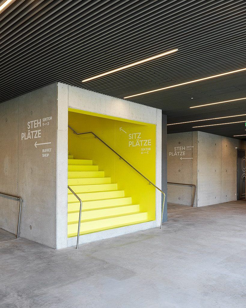 Die Verlegung der Publikumsgarderoben aus dem unbelichteten Innenbereich der Halle an die Westseite, bedeutet für das große Gebäudevolumen die Öffnung einer zusätzlichen Fassade zum Straßenraum, mit direktem Zugang für das Publikum und natürlicher Belichtung der Garderoben.