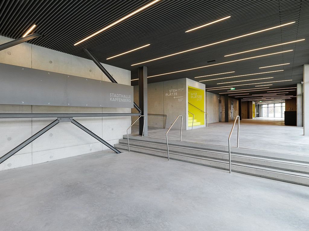Der Gesamteindruck räumlicher Großzügigkeit, Tageslicht und Rundgang waren für die Gemeinde sicher wesentliche Aspekte den Vorschlag von .tmp architekten aufzunehmen, die Eis- und Mehrzweckhalle nach dem Umbau als Stadthalle zu bezeichnen.