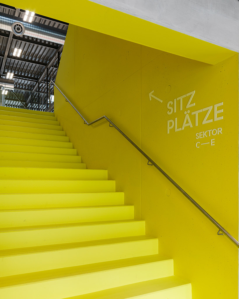 Dieser Aspekt der Mehrfachnutzung als Tageslichthalle war 2015 auch einer der Gründe, sich für das Wettbewerbsprojekt von .tmp architekten zu entscheiden. Ein Projekt, das die Qualität der bestehenden großzügigen Fensterflächen und damit die Belichtung durch Tageslicht beibehält und durch ein neues Beschattungssystem sogar verstärkt. Dazu ermöglicht der an den Fensterflächen liegende Umgang einen barrierefreien Rundgang durch die gesamte Halle. Deutlich über das Niveau der Eisfläche angehoben, erschließt er auch das Buffet und die große Terrasse im Süden.