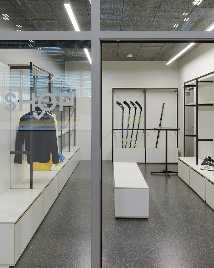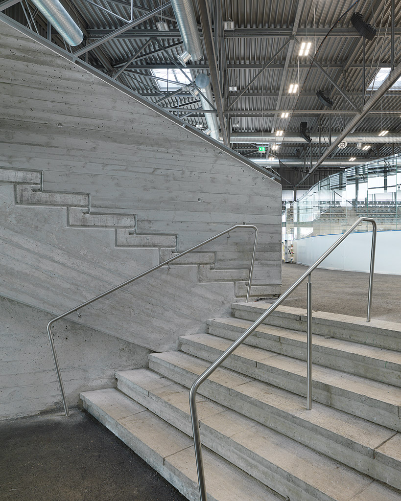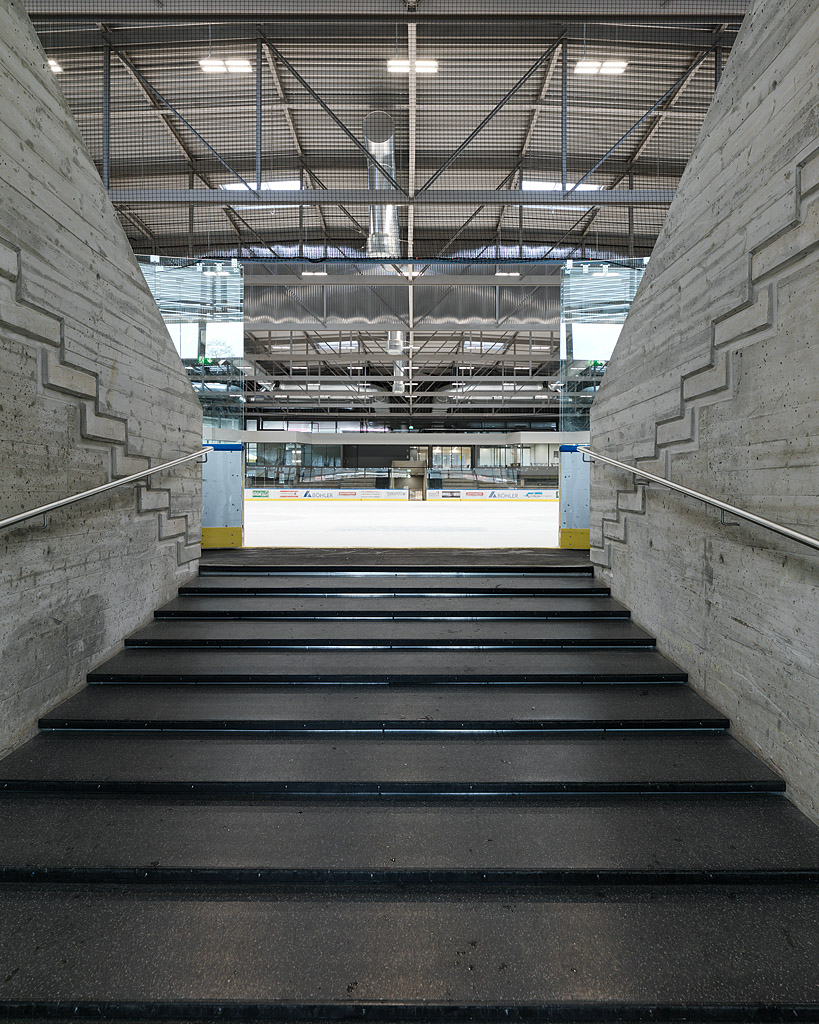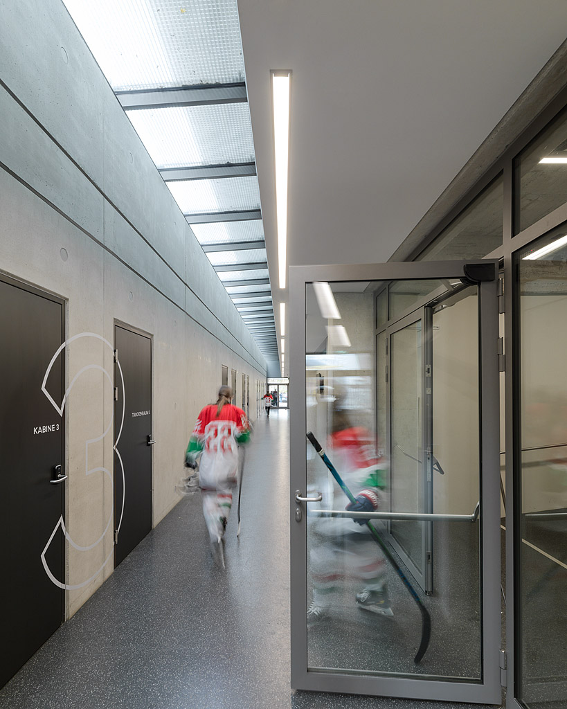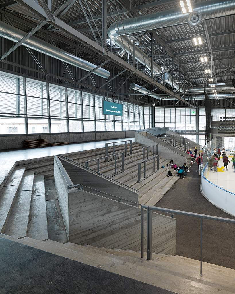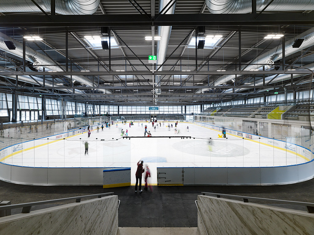 Die wesentliche Ergänzung des vorhandenen Raumangebots bilden der Foyertrakt an der Nordseite und der Garderobentrakt an der Südseite der Halle. Während mit dem Foyer der Höhenunterschied zwischen Umgebungsgelände – in diesem Fall dem Vorplatz – und Eisfläche von rund einem Meter durch Rampen überwunden wird, nutzt der Garderobentrakt diese Höhendifferenz um niveaugleich an die bestehenden Garderoben anzuschließen.