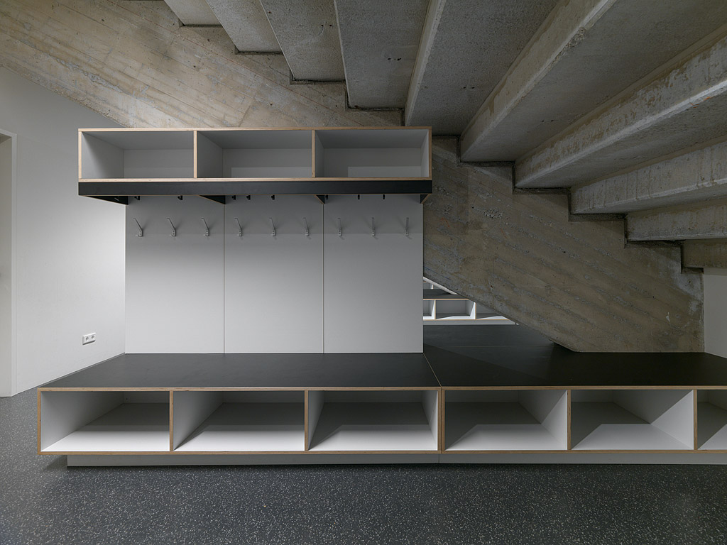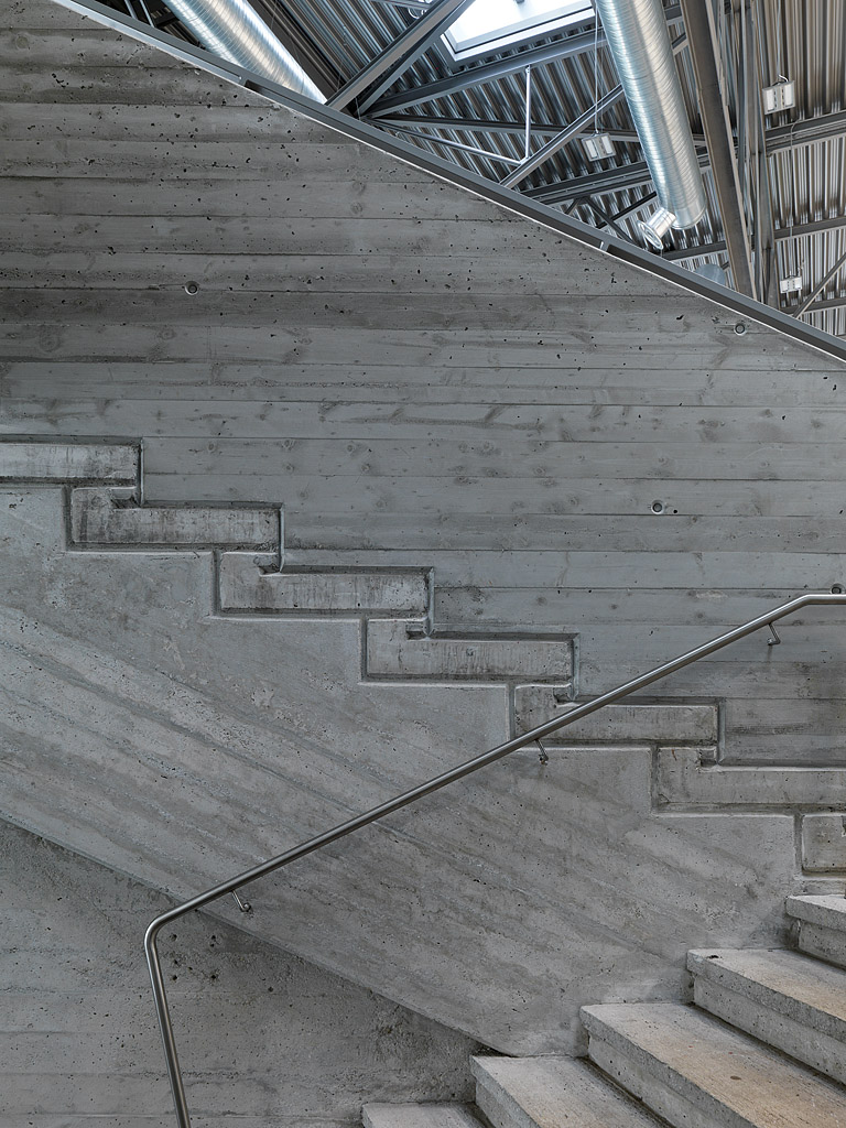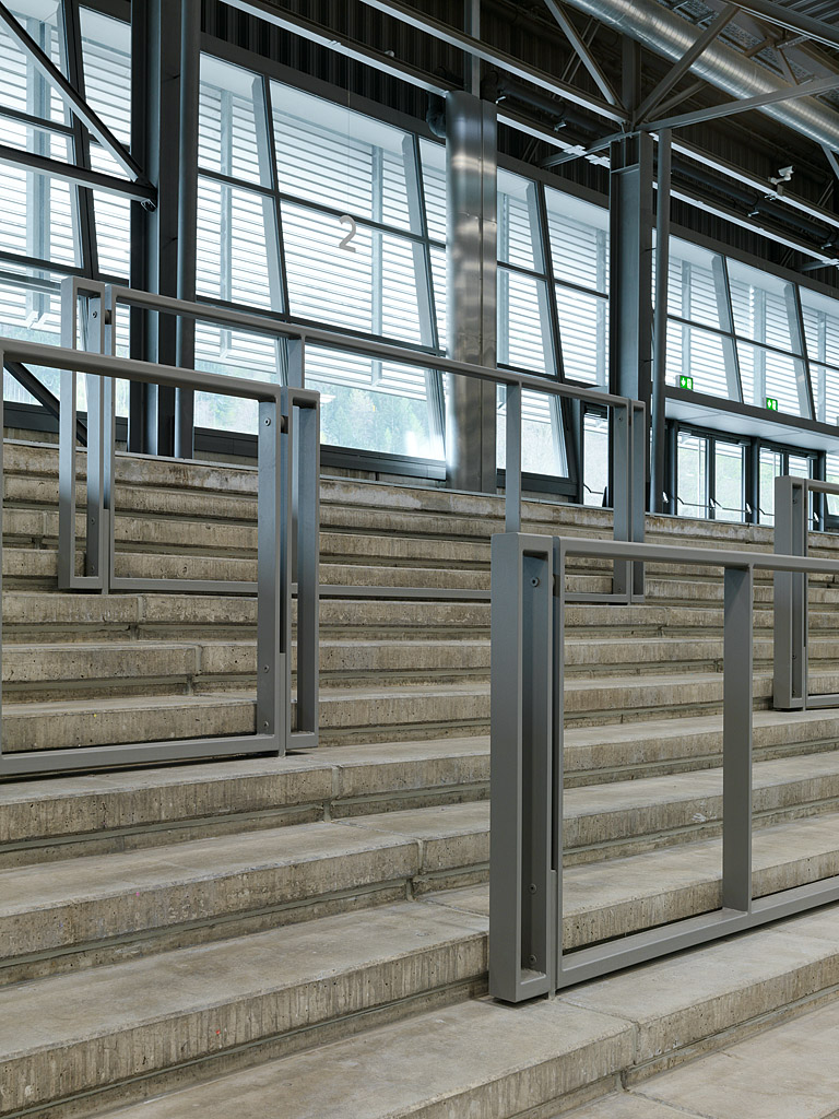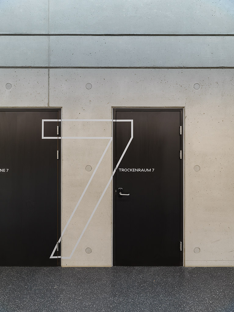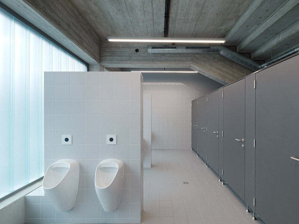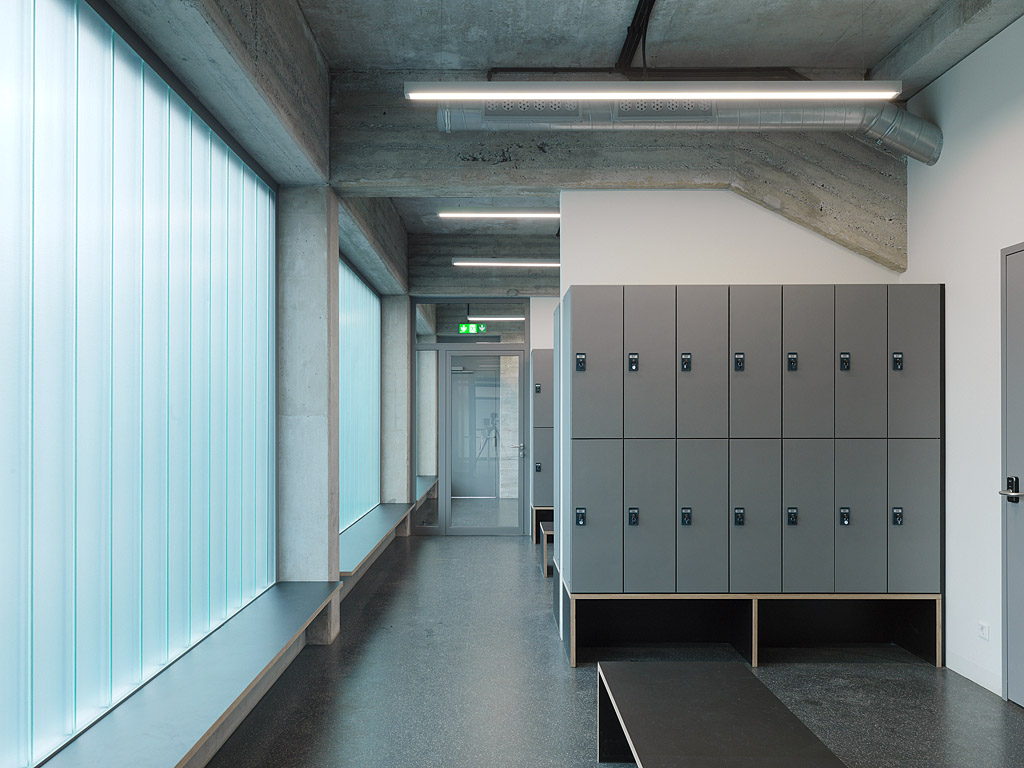Die neuen Kabinen können an ihrer Südseite über transluzente Glasflächen natürlich belichtet werden. Durch den Schlittschuhschleifraum, das Büro des KSV und den Erste-Hilfe-Raum wird der Kabinentrakt räumlich ergänzt. Sie alle liegen an einer Schnittstelle zum Badebereich, aus dem eine breite Freitreppe auf eine Liegeterrasse hochführt, die auch als Fluchtweg aus dem Hallenobergeschoss genutzt werden kann, in erster Linie aber den Entfall der Rasen- und Liegeflächen kompensieren soll.