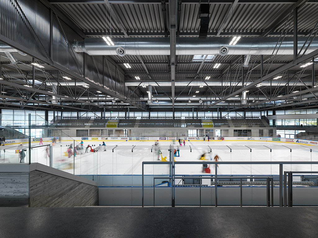 Die Eishalle, zuerst als nicht überdecke Eisfläche errichtet, wird im Laufe der 1970er Jahre in mehreren Schritten durch Tribünen erweitert, schließlich überdeckt und in Teilbereichen, wie dem Buffet, auch mit dem Hallenbad verbunden. Nachdem aber weder eine funktionierende thermische Hülle, noch eine entsprechende Haustechnik zur Lüftung oder Heizung vorhanden war, wurde die Sanierung der Anlage zum Thema. Eine große Herausforderung für die Stadt, die die Eishalle nicht nur für den Profi- und Publikumssport, sondern auch als Mehrzweckhalle zu nutzen wusste.