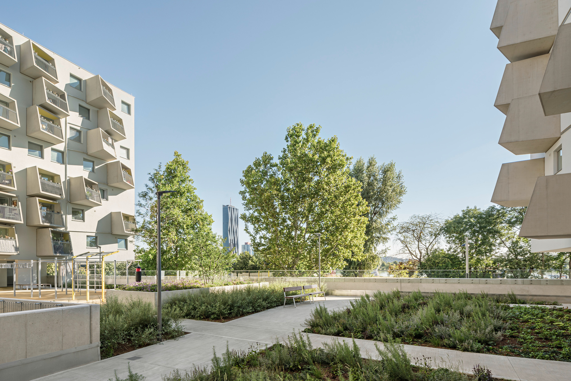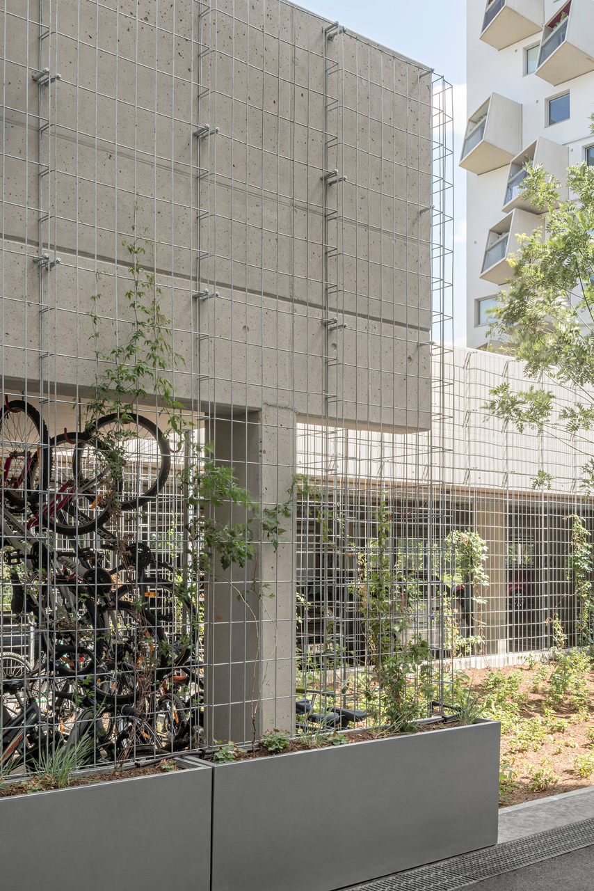 An den Fassadenflächen zu beiden Straßenzügen hin können Rankpflanzen wachsen, auch die Dachflächen der Wohntürme sind bepflanzt, sodass insgesamt 71 Prozent des Bauplatzes begrünt sind.