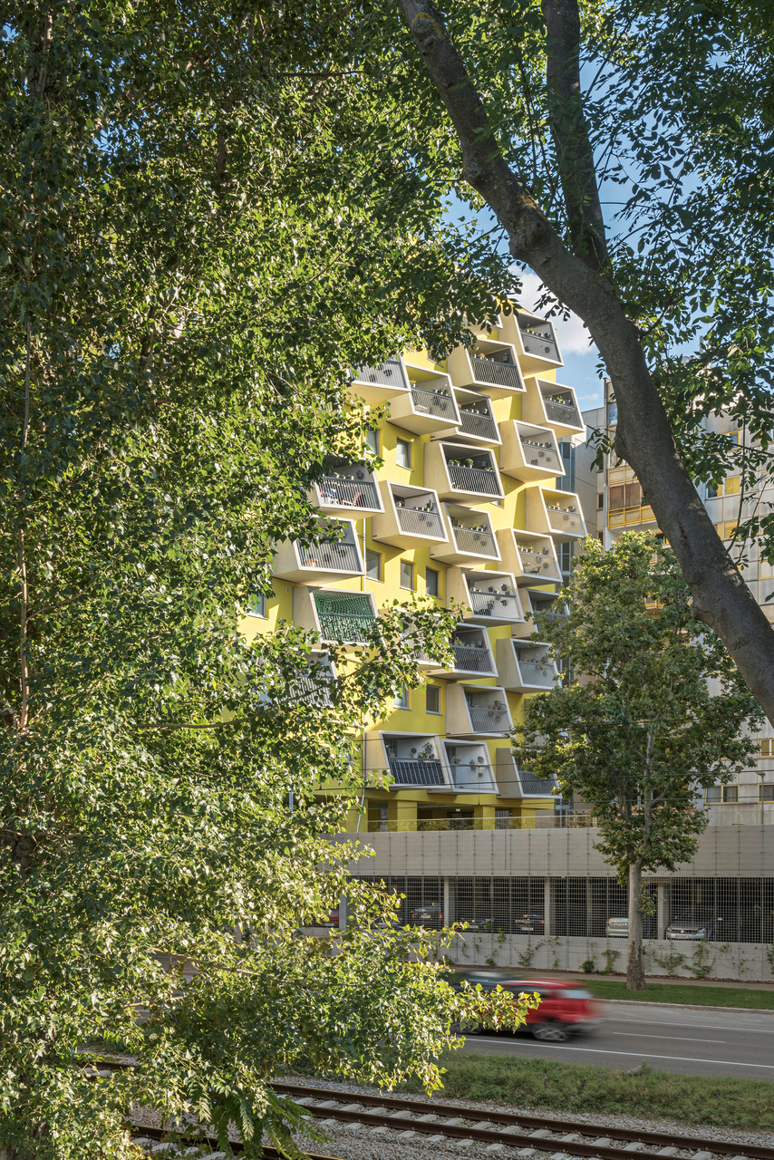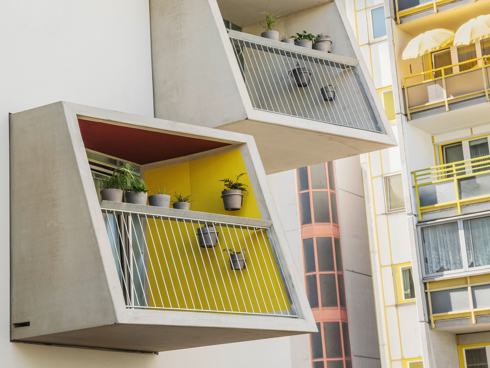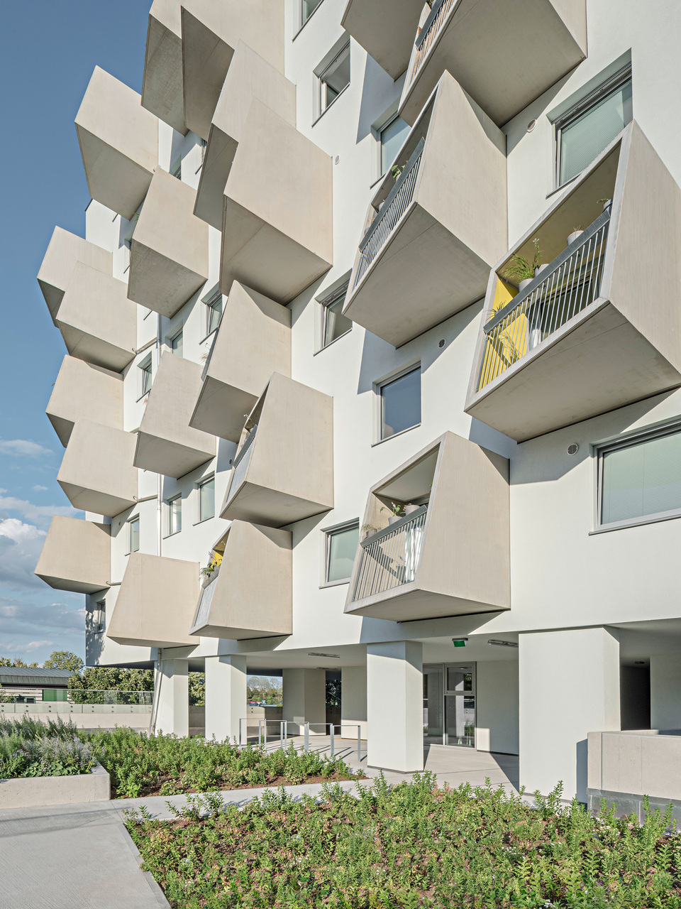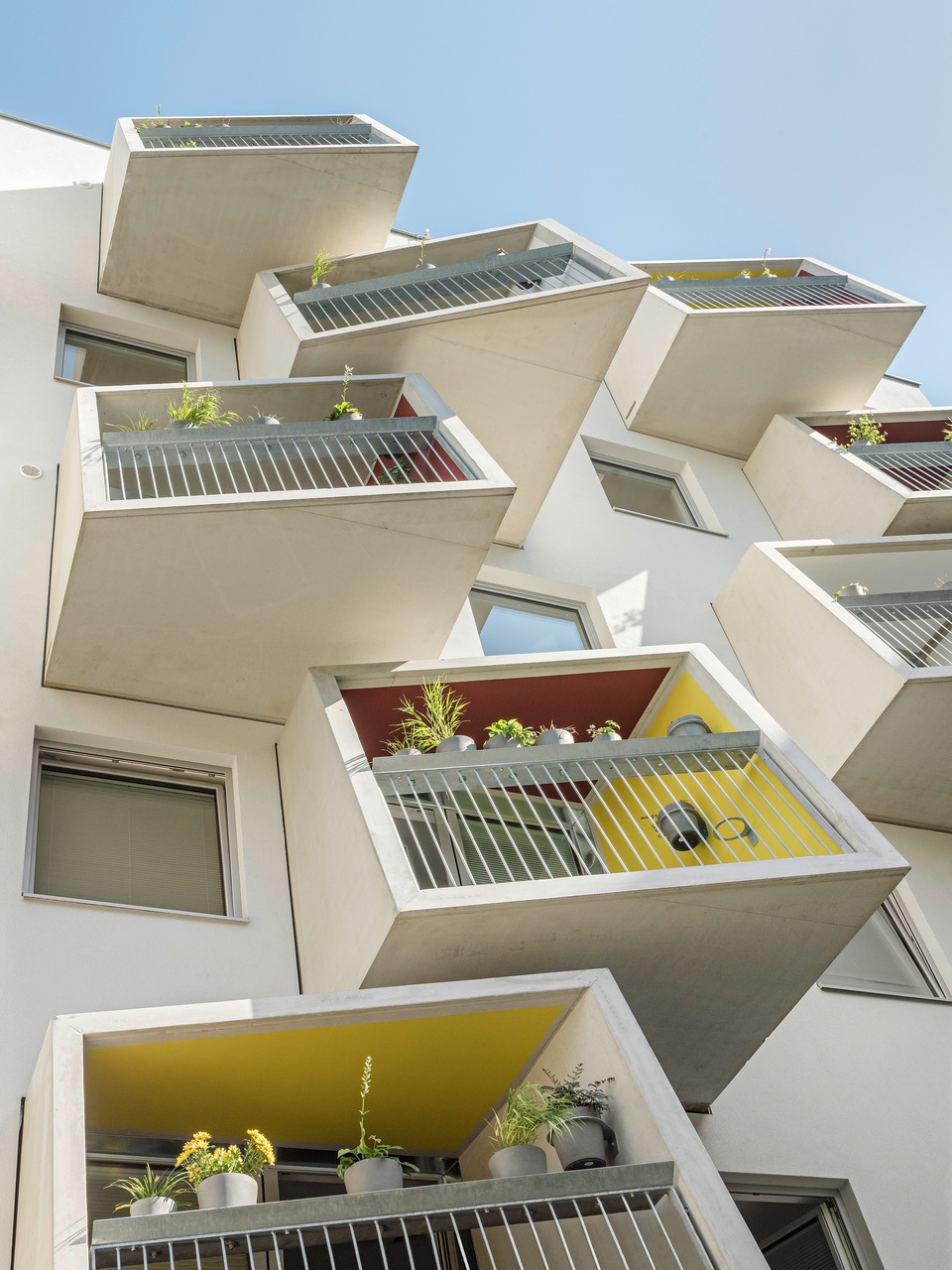 Die markant auskragenden Loggien wurden jeweils in einem Stück im Betonwerk fabriziert und vor Ort an nur vier Auflagerpunkten eingehängt. Durch ihre Drehung lenken sie den Blick in Richtung Donau, das Bestandgebäude bleibt gegen Einblicke geschützt.