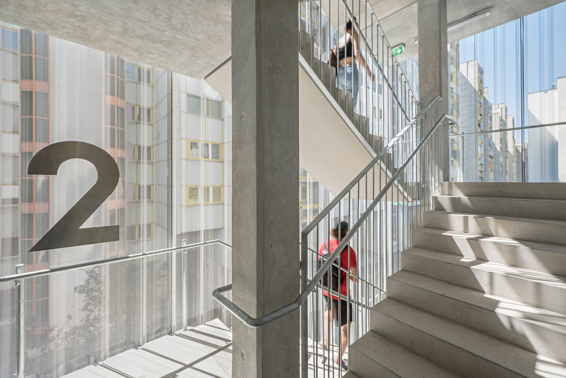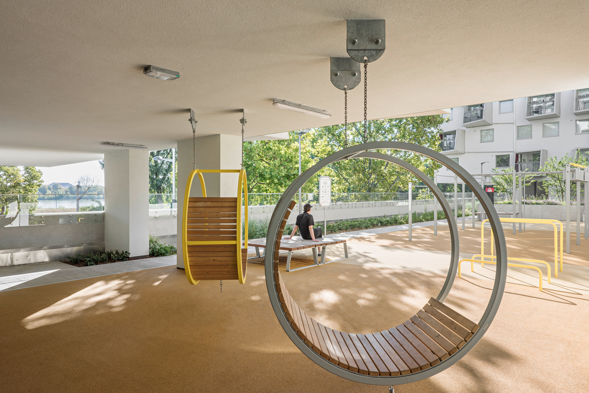 Der auf den Garagendächern hinzugewonnene gemeinsame Freiraum funktioniert als fünfte Fassade und lädt neue wie bisherige Nutzer:innen zum Verweilen, Gärtnern und Trainieren ein. Die Gemeinschaftsräume auf derselben Ebene (Waschküche, Kinderspielraum, Räume ohne vordefinierte Nutzung) lassen sich über großzügige Verglasungen zum Gartendeck hin öffnen. Mit Außentreppen sind sie an die aufgewertete Wohngasse zwischen Bestands- und Neubau angebunden und bieten eine Reihe von kommunikativen Aufenthaltszonen für alle Bewohner:innen.