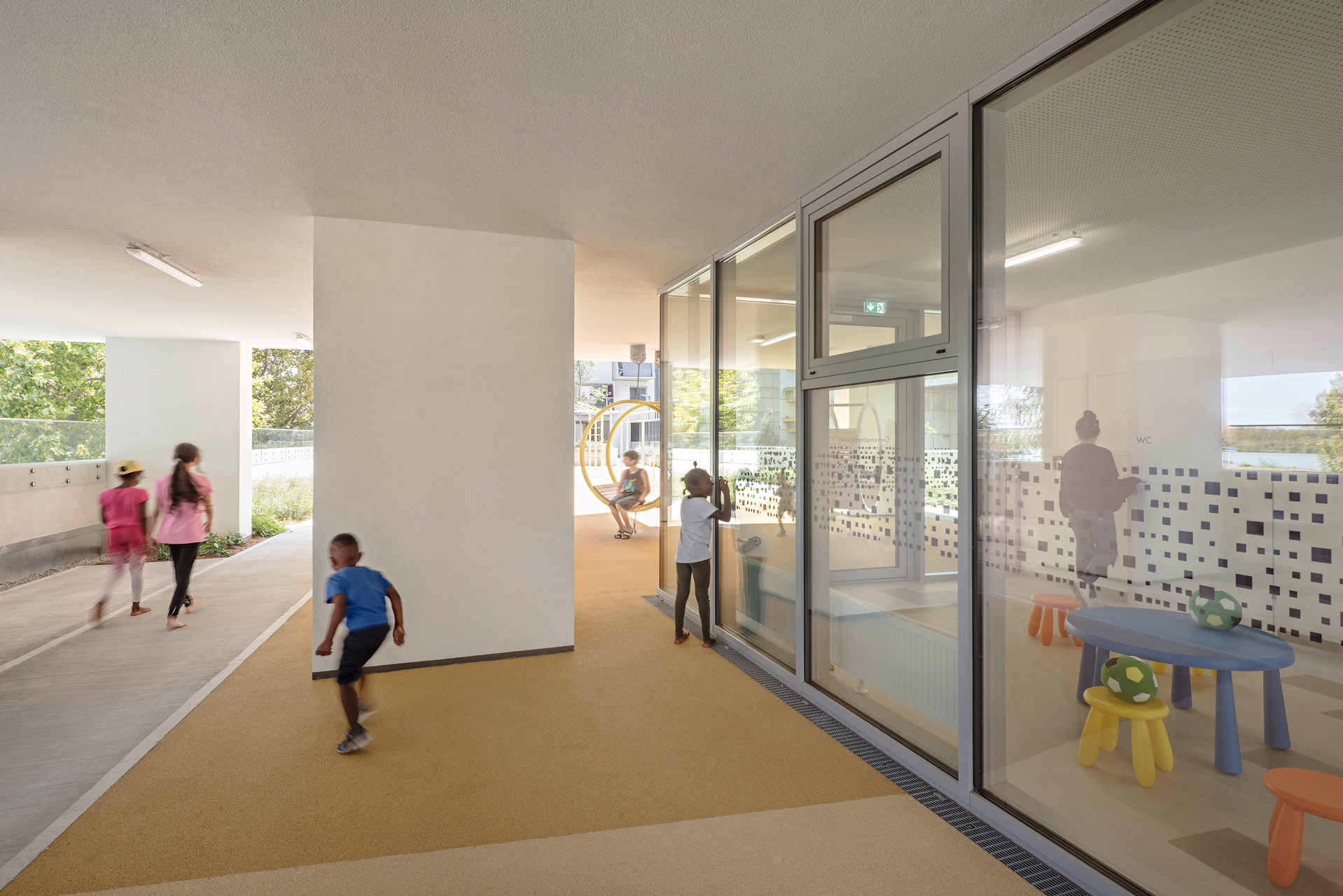 In enger Zusammenarbeit mit dem Künstler Ingo Nussbaumer wurde eine speziell an den Ort angepasste Farbpalette entwickelt, die abhängig von Licht und Tageszeit beim Durchschreiten der Anlage unterschiedliche Farbräume erzeugt. (Autor: Achim Geissinger, nach einem Text der Architekten)