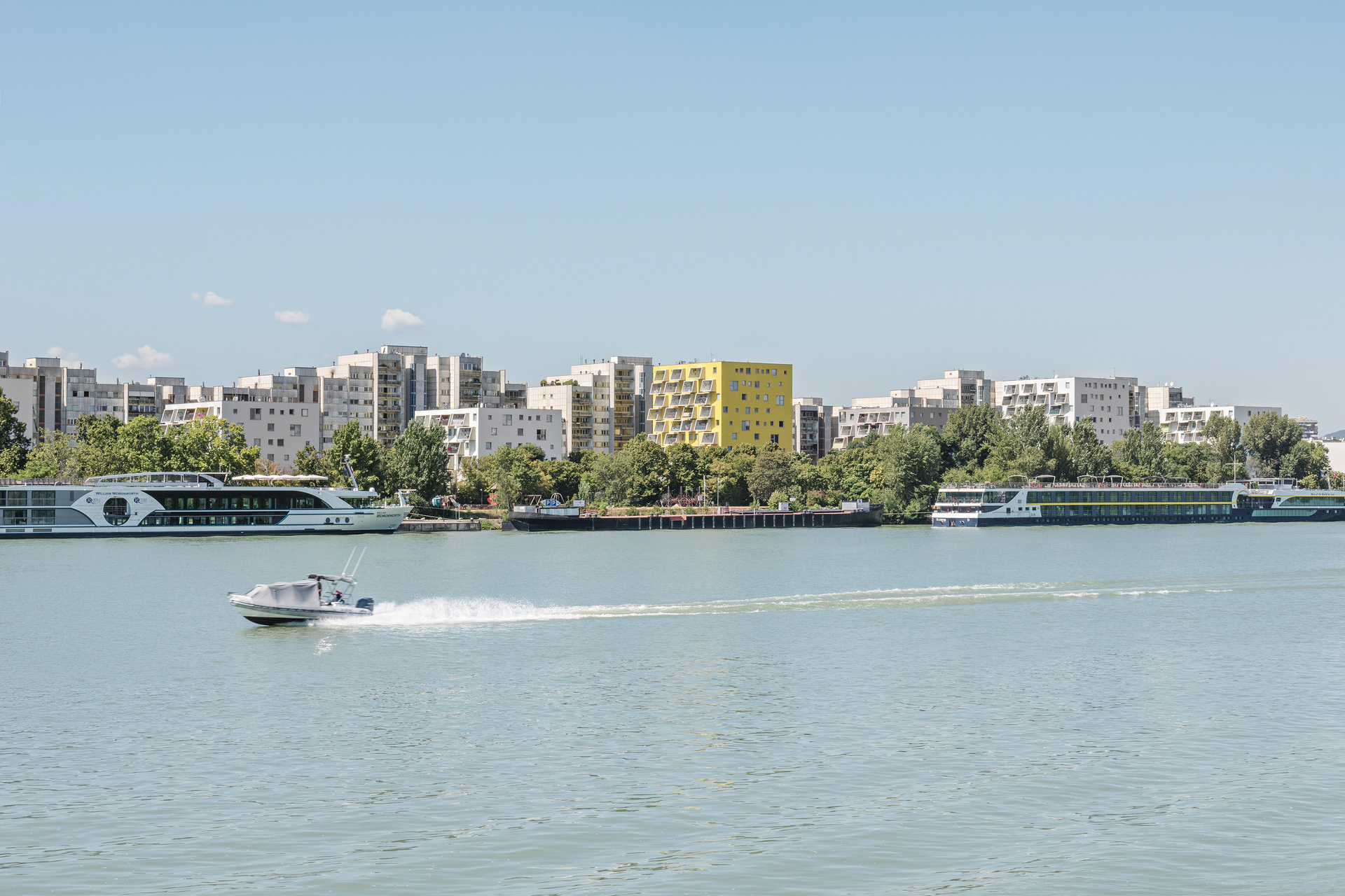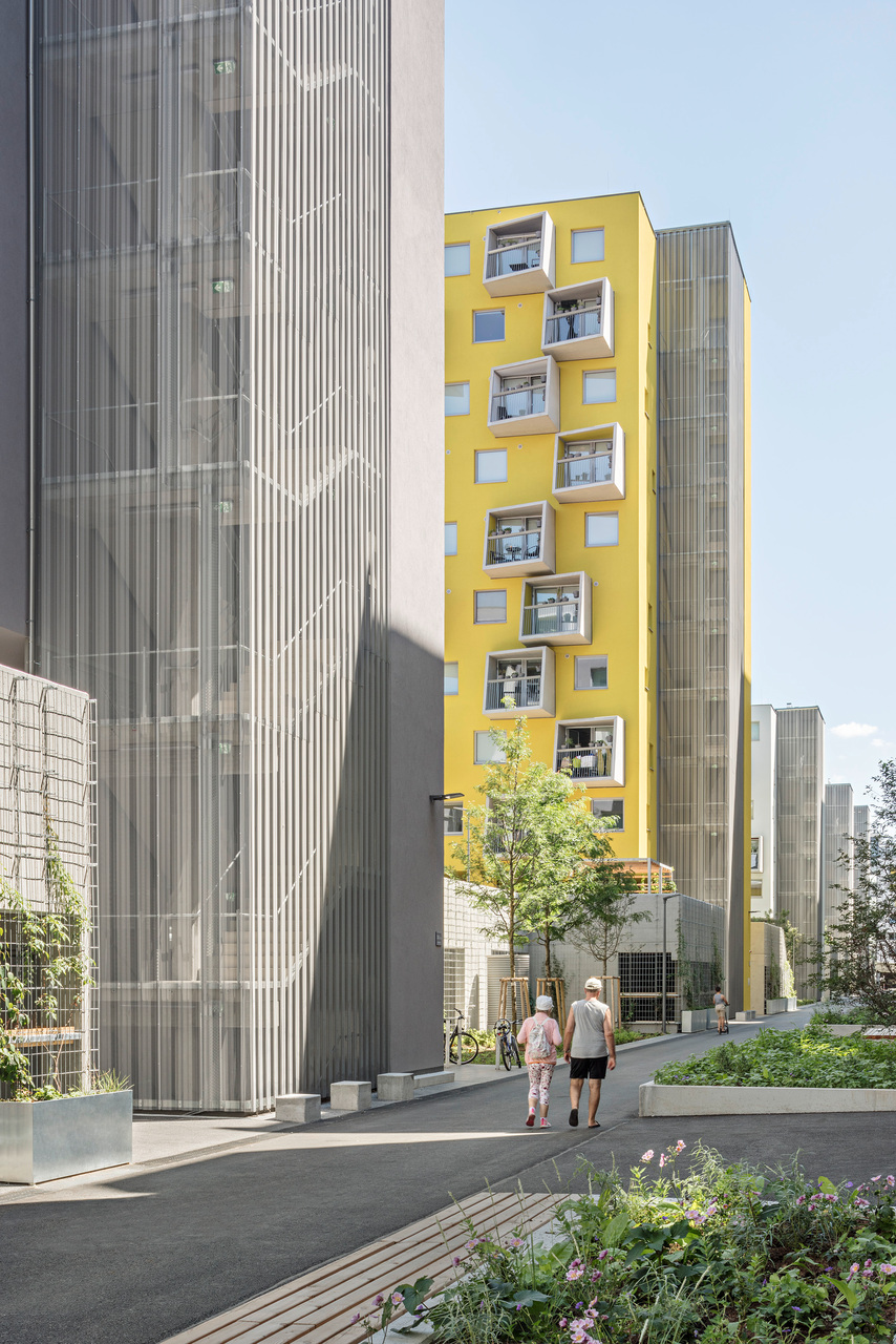 Der Garagenriegel wurde um ein Geschoss reduziert und im Sinne von Nachverdichtung und Stadtreparatur mit sieben Einzelbaukörpern mit insgesamt rund 20.000 m² und 332 Wohnungen aufgestockt. Um den charakteristischen Donaublick für die Bestandsmieter möglichst zu erhalten, wurden die schmalen Baukörper vor die Treppenhäuser gebaut und in ihrer jeweiligen Höhenentwicklung der vom Bestand vorgegebenen Wellenform angepasst.
