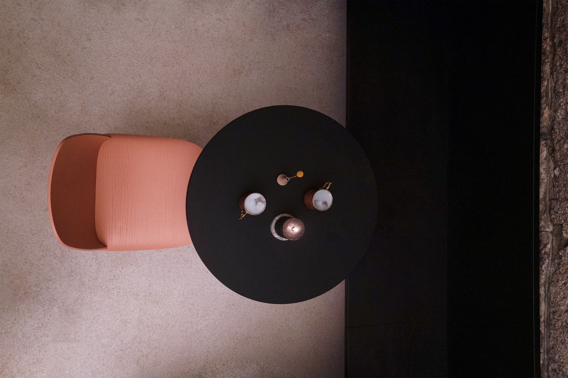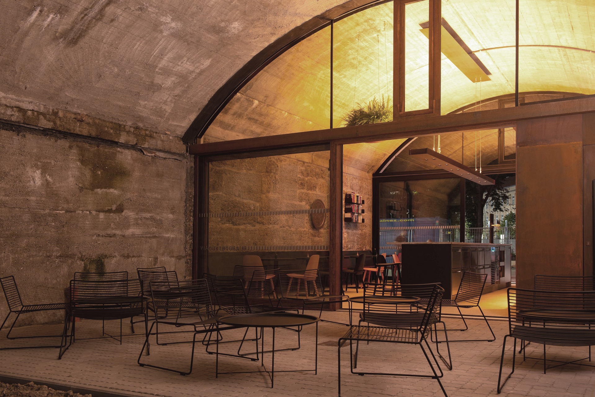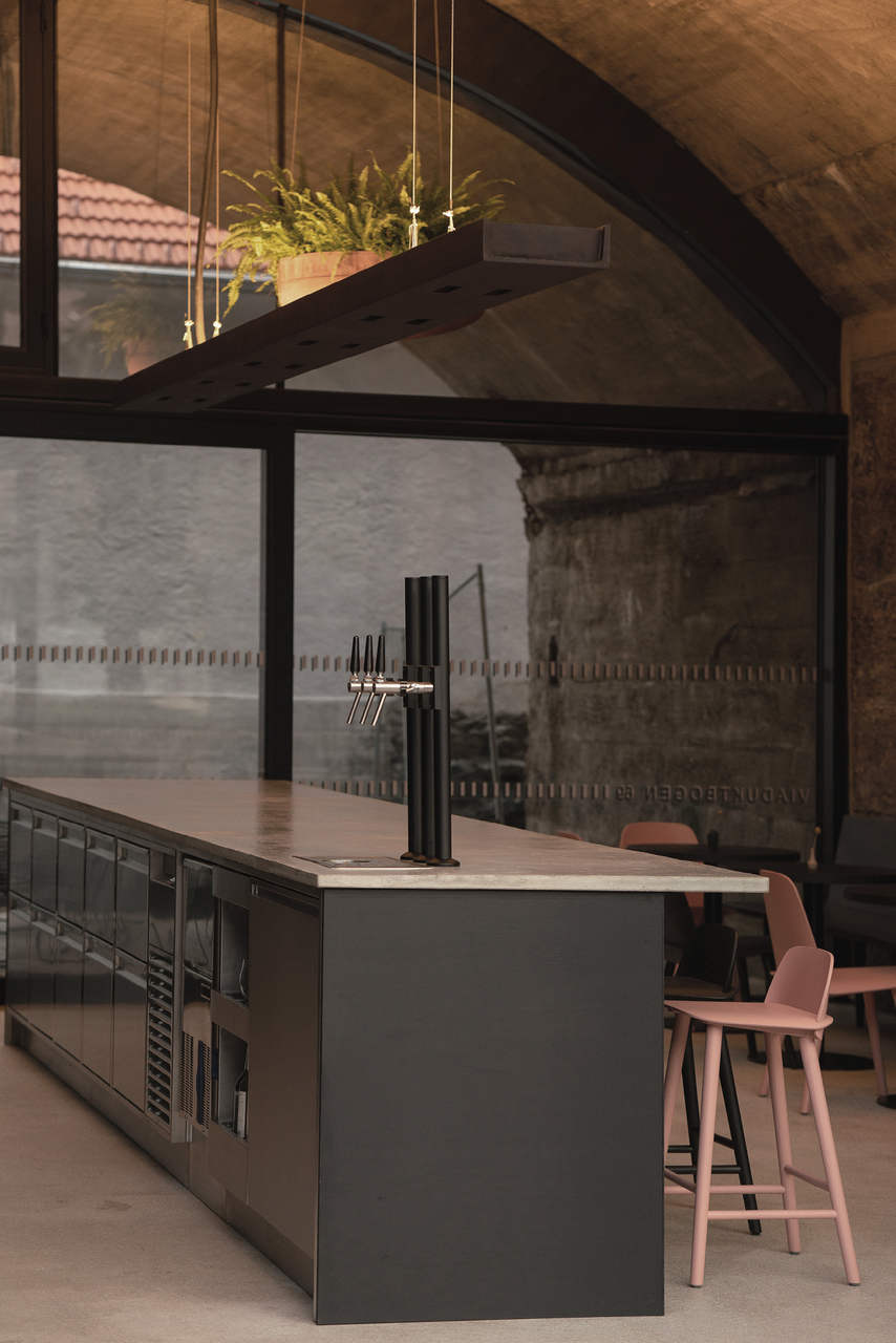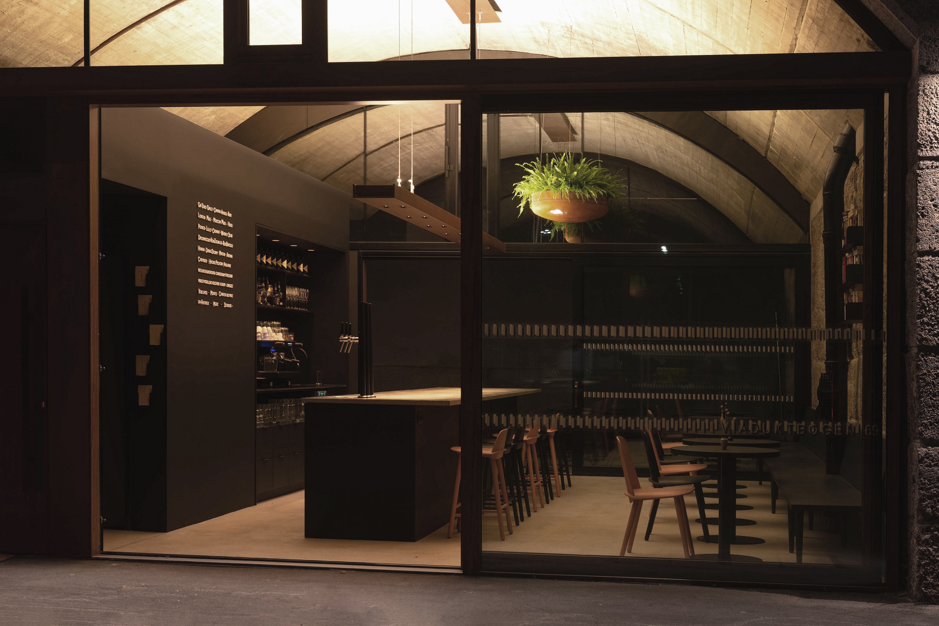Ausgehend vom Bestand, der – wie einige benachbarte Bögen – die Besonderheit aufweist, dass er aus zwei hintereinanderliegenden Bogenräumen besteht und so zweiseitig geöffnet ist, richteten sie im straßenseitigen, 9 Meter tiefen Bogen das eigentliche Lokal ein. Der zweite, 5 Meter tiefe Bogen wurde bewusst nicht verbaut, sondern bildet als südseitige Loggia eine gedeckte, witterungsgeschützte Pufferzone, die eine ganzjährige Bespielung des Außenbereichs ermöglicht. Zentrales Anliegen war es, der mit 60 m² sehr beschränkten Fläche räumliche Großzügigkeit zu verleihen, was u. a. durch die Verschränkung des Gastraums mit dem Schankbereich und durch die Reduktion der erforderlichen Infrastruktureinbauten auf ein absolutes Minimum erreicht wurde.