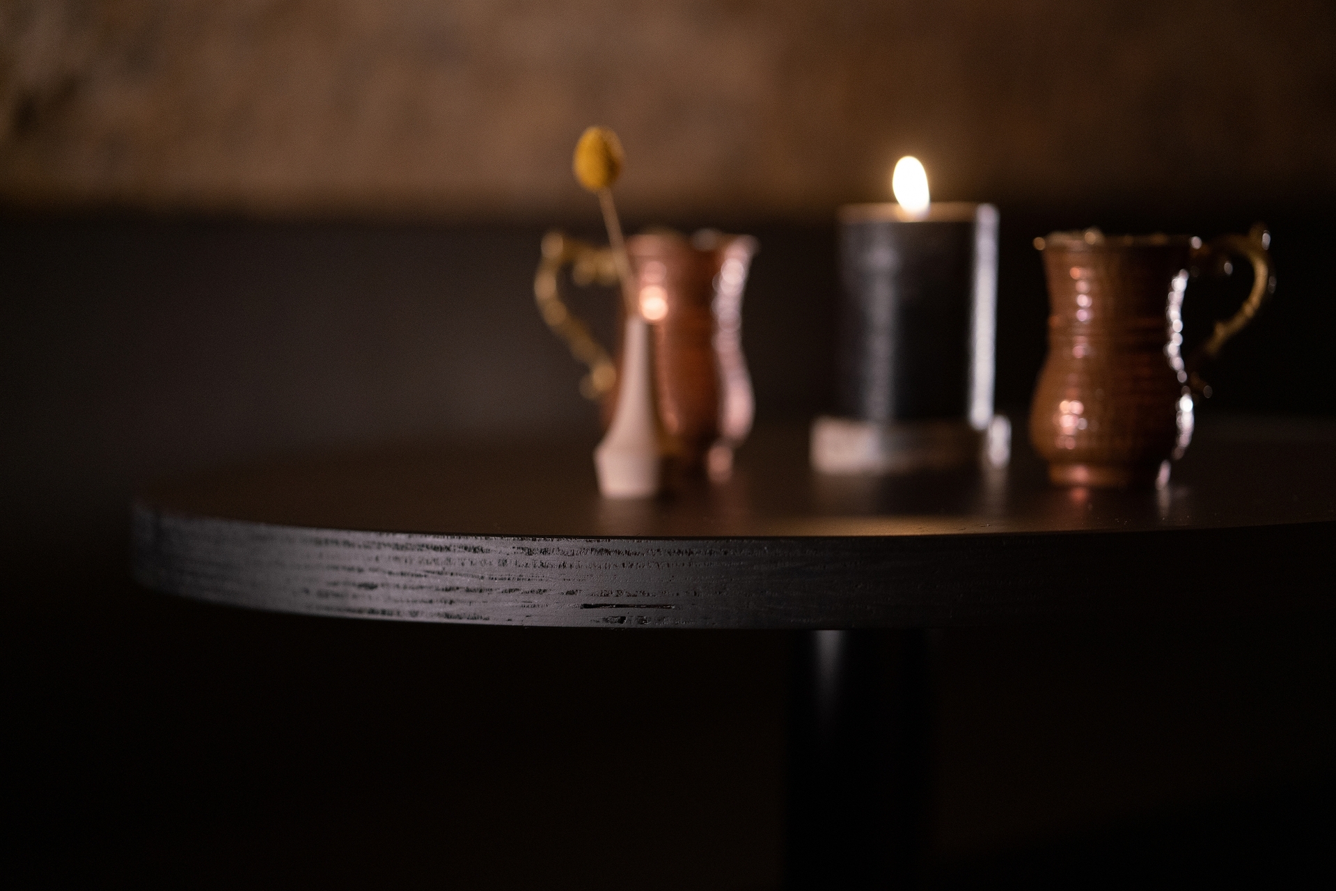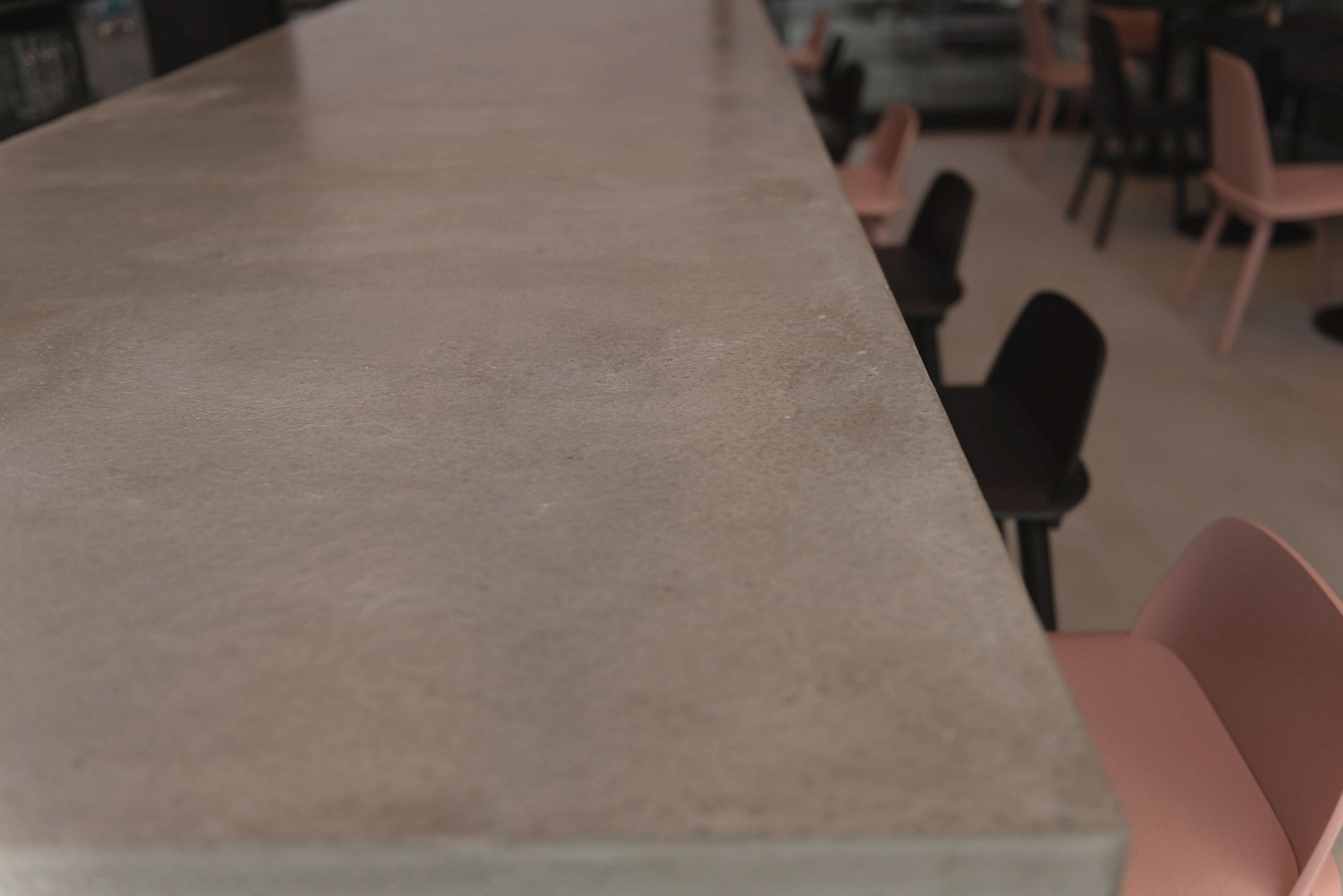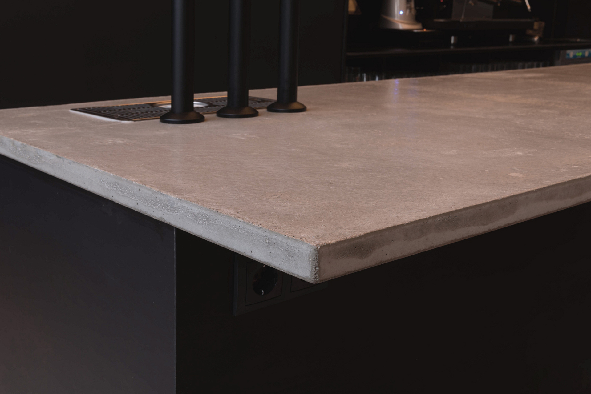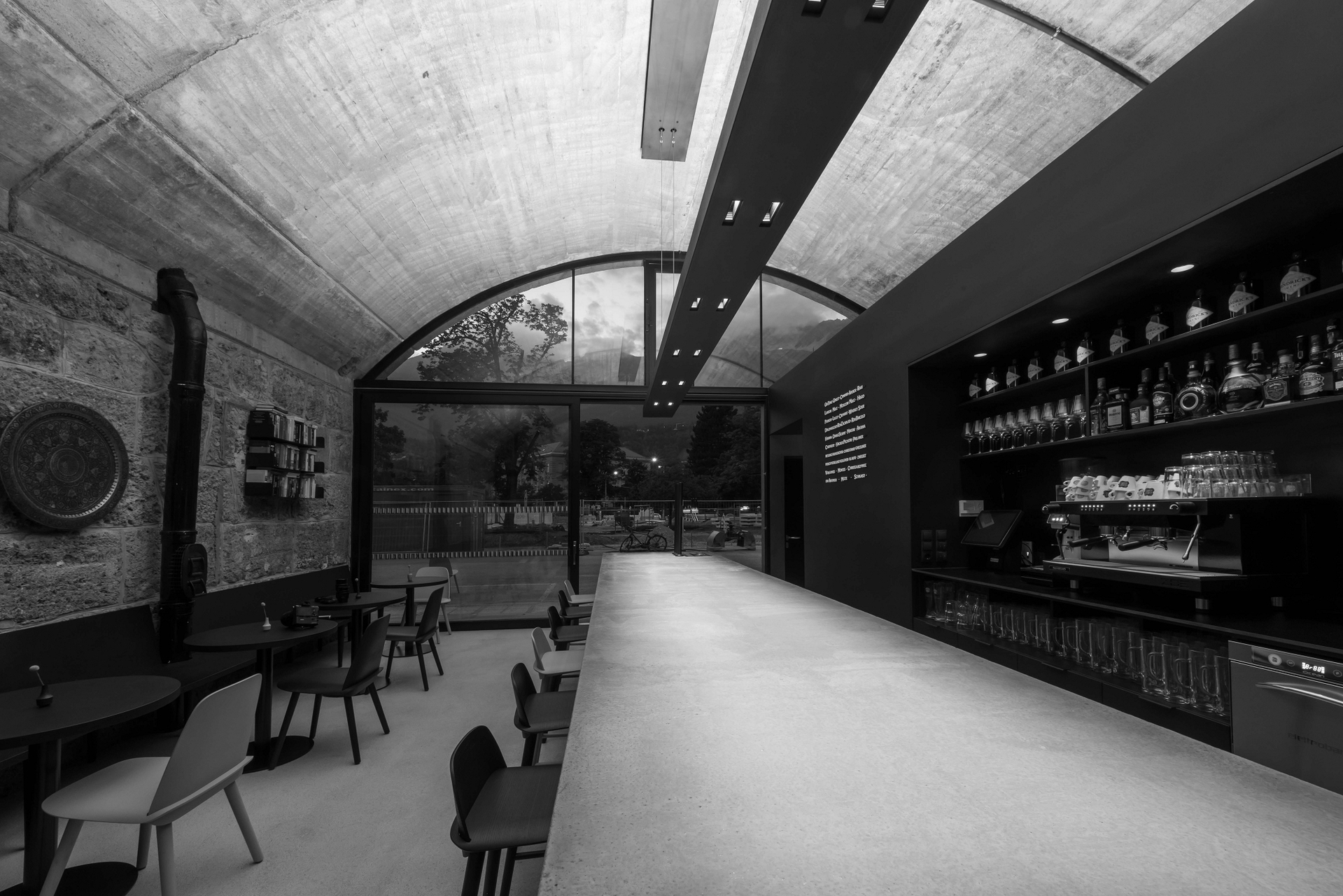 Das Zentrum bildet ein langer und breiter Tresen, eine kommunikative Begegnungszone, in der die klassischen Grenzen zwischen Gastgeber:in und Gast verschwimmen. Ein heller Fußboden aus grob geschliffenem Betonestrich ergänzt die vorhandene Substanz der Wände aus Höttinger Brecchie und Betongewölbe. Sämtliche Möbeleinbauten wurden aus Verpackungssperrholz in Seekiefer maßgefertigt und schwarz matt lasiert, womit sie dezent in den Hintergrund treten. Punktuelle Akzente setzen einzelne, in ihrer Farbigkeit von der Höttinger Brecchie abgeleitete, Möbelstücke. Direkt und indirekt beleuchtet wird der Raum über eine zentrale, massive Hängeleuchte, wobei das Gewölbe als eine Art diffuser Reflektor genutzt wird. Die direkte Beleuchtung fokussiert auf den Tresen mit seiner hellen Betonplatte und beschreibt exakt die Umrisse der mehr als 5 Meter langen Arbeits- und Begegnungsfläche. Raumhohe Schiebetüren verbinden das Lokal beidseitig mit dem Außenraum Richtung Radweg im Süden und dem neuen Ing.-Etzel-Park im Norden. Sie ermöglichen gleichzeitig auch eine permanente, natürliche Querlüftung, womit auf eine mechanische Lüftung komplett verzichtet werden konnte – ein in Anbetracht der engen budgetären Vorgaben nicht unwesentlicher Aspekt. (Text: Claudia Wedekind nach einem Text der Architekt:innen)