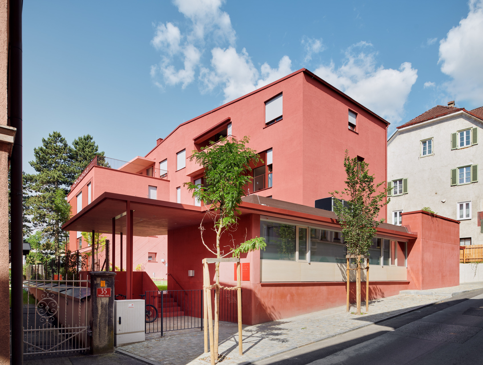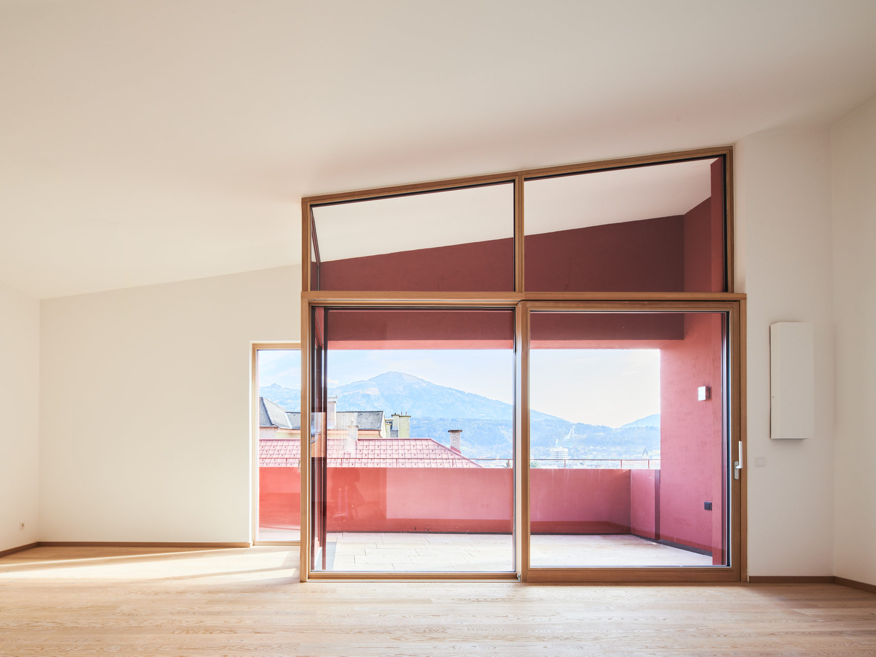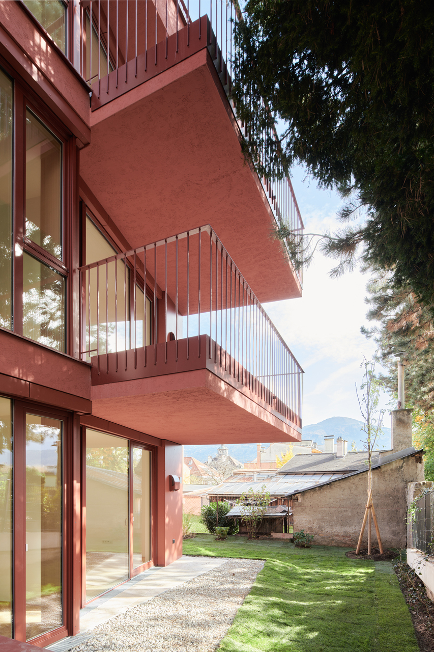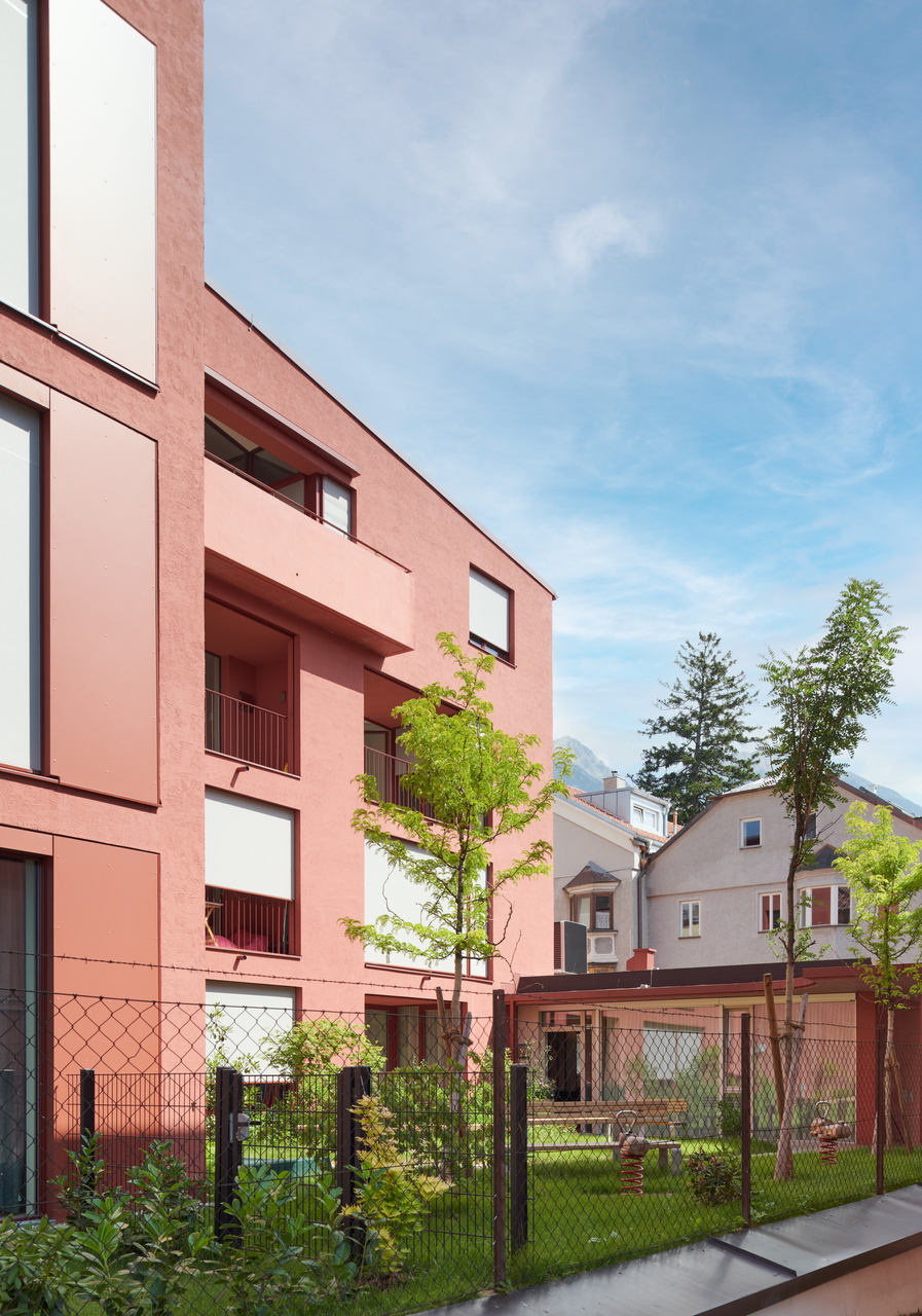 Im Neubau befinden sich 15 Wohnungen unterschiedlicher Größe, die fast alle zweiseitig belichtet und damit gut durchlüftbar sind. Je nach Lage zum öffentlichen Raum hin werden die Wohnungen durch Loggien oder Balkone ergänzt. Ein Stiegenhaus in Sichtbeton mit blauem Geländer und gelber Fliesenwand kontrastiert mit der kräftig roten Außenerscheinung des Baukörpers, die im Zusammenspiel mit dem Rosa des Nachbargebäudes und dessen rotem Blechdach etwas „Italianità“ nach Innsbruck bringt, einer im Kern ja auch bunten Stadt. (Text: Architekt)