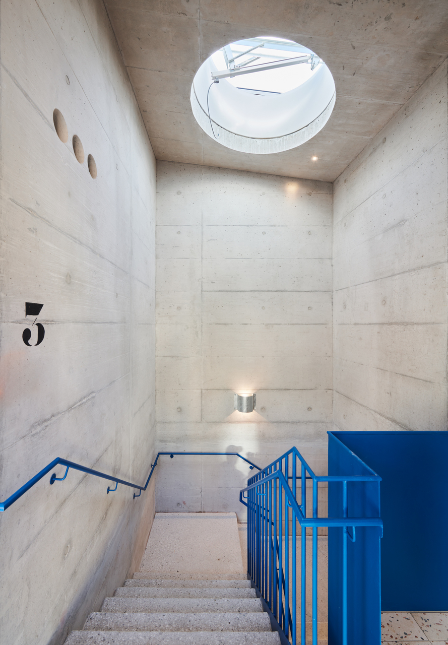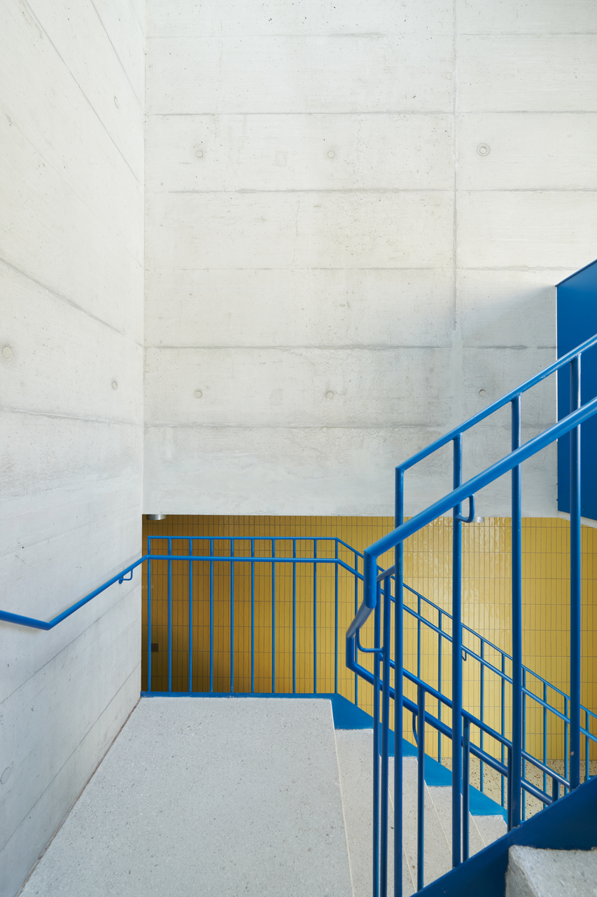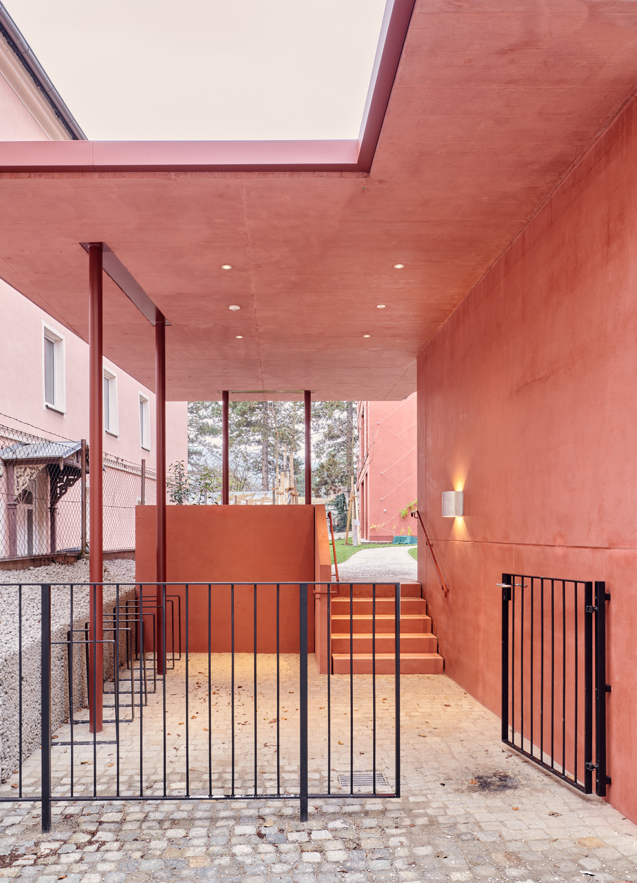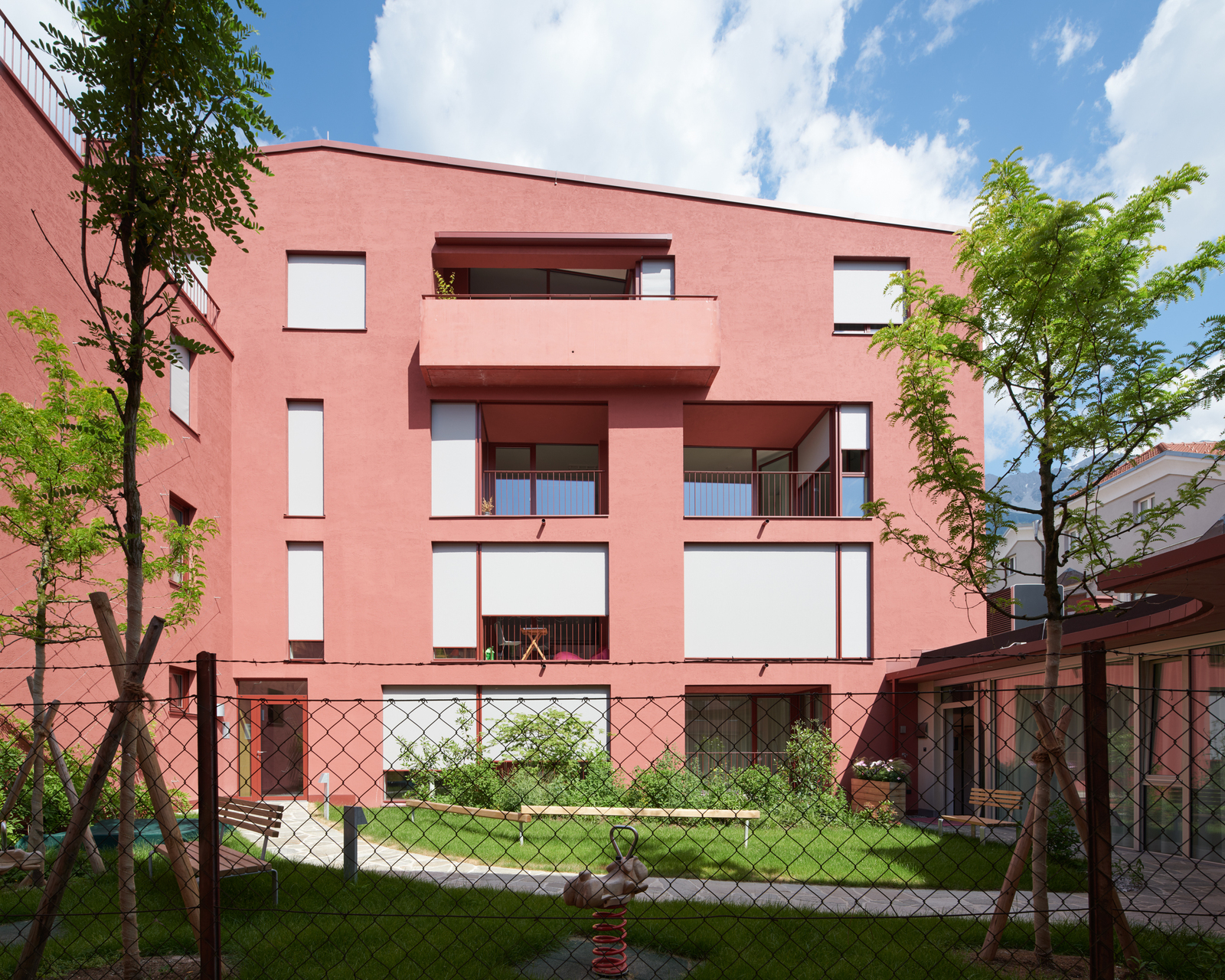 Im Neubau befinden sich 15 Wohnungen unterschiedlicher Größe, die fast alle zweiseitig belichtet und damit gut durchlüftbar sind. Je nach Lage zum öffentlichen Raum hin werden die Wohnungen durch Loggien oder Balkone ergänzt. Ein Stiegenhaus in Sichtbeton mit blauem Geländer und gelber Fliesenwand kontrastiert mit der kräftig roten Außenerscheinung des Baukörpers, die im Zusammenspiel mit dem Rosa des Nachbargebäudes und dessen rotem Blechdach etwas „Italianità“ nach Innsbruck bringt, einer im Kern ja auch bunten Stadt. (Text: Architekt)