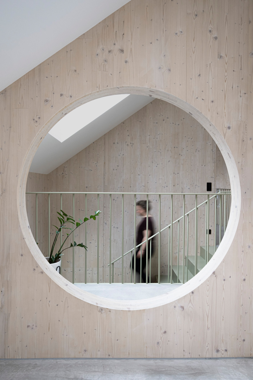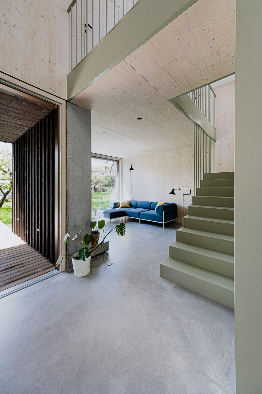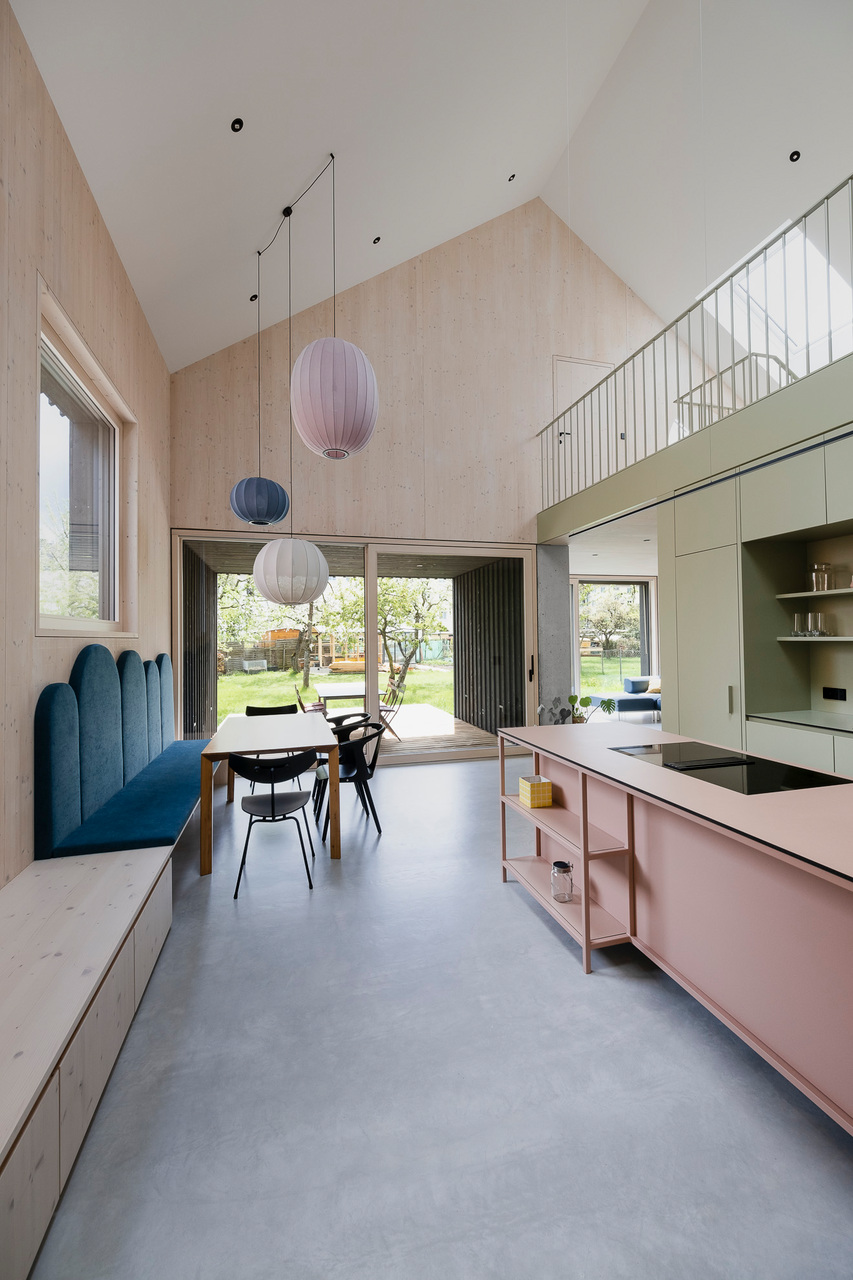 Die dreiseitig nur mit wenigen und gezielt gesetzten Öffnungen versehene, dunkle Lärchenholzfassade ergibt eine klare, unaufgeregte Kubatur. Diesem kompakten Eindruck stehen im Innenraum großzügige, bisweilen geschosshohe Öffnungen Richtung Garten und Terrasse gegenüber, die in die hellen, weiß lasierten Brettsperrholz-Wände und -Decken (CLT, Cross-laminated Timber) eingelassen sind. Offenheit und Luftigkeit des Innenraums werden bereits beim Eintritt ins Haus durch eine direkte Sichtachse in den Garten spürbar. Diese Orientierung wird von einer im Garderobenbereich beginnenden, in abgetöntem Grün gehaltenen Wand begleitet, die den Wohnbereich von den dahinterliegenden Räumen (Büro, Technik und WC) trennt und Stauraum bietet. Sie trägt die Galerie und löst sich nach oben hin in ein Geländer auf. Zum fein abgestimmten Farbkonzept gehören altrosafarbene Volumina im Kochbereich und in Petrol gehaltene Sitzgelegenheiten.