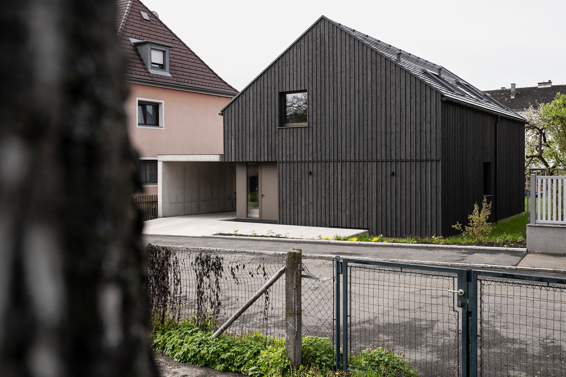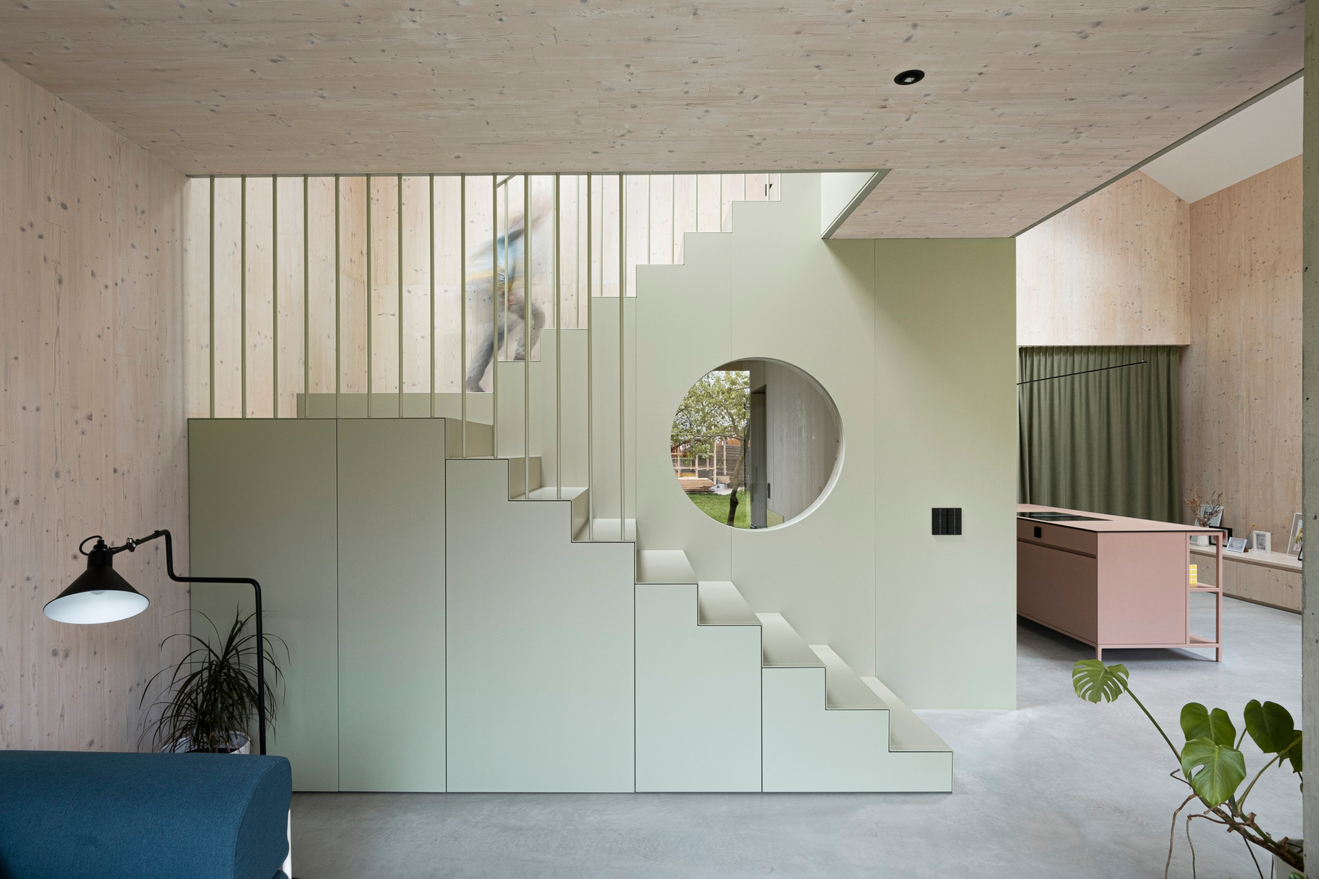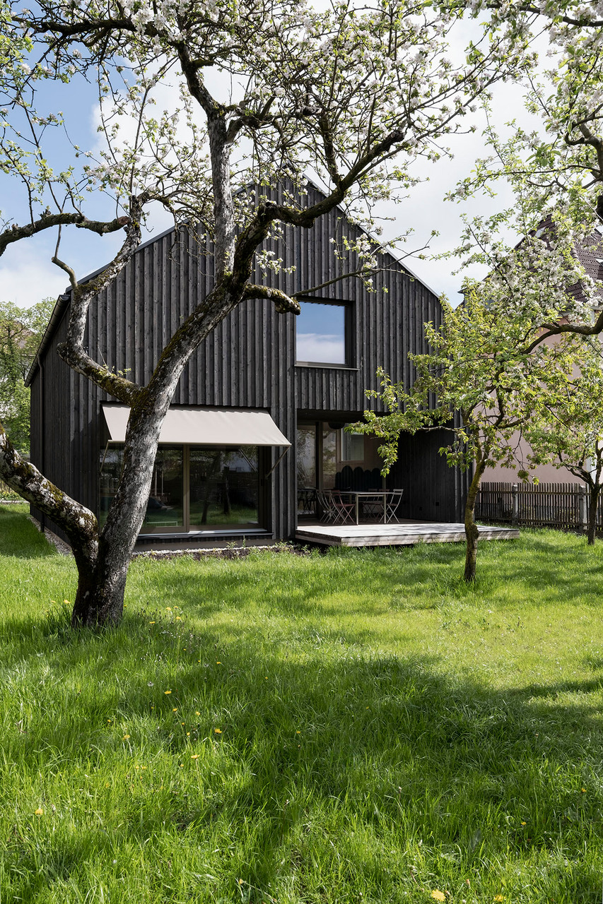 Die dreiseitig nur mit wenigen und gezielt gesetzten Öffnungen versehene, dunkle Lärchenholzfassade ergibt eine klare, unaufgeregte Kubatur. Diesem kompakten Eindruck stehen im Innenraum großzügige, bisweilen geschosshohe Öffnungen Richtung Garten und Terrasse gegenüber, die in die hellen, weiß lasierten Brettsperrholz-Wände und -Decken (CLT, Cross-laminated Timber) eingelassen sind. Offenheit und Luftigkeit des Innenraums werden bereits beim Eintritt ins Haus durch eine direkte Sichtachse in den Garten spürbar. Diese Orientierung wird von einer im Garderobenbereich beginnenden, in abgetöntem Grün gehaltenen Wand begleitet, die den Wohnbereich von den dahinterliegenden Räumen (Büro, Technik und WC) trennt und Stauraum bietet. Sie trägt die Galerie und löst sich nach oben hin in ein Geländer auf. Zum fein abgestimmten Farbkonzept gehören altrosafarbene Volumina im Kochbereich und in Petrol gehaltene Sitzgelegenheiten.