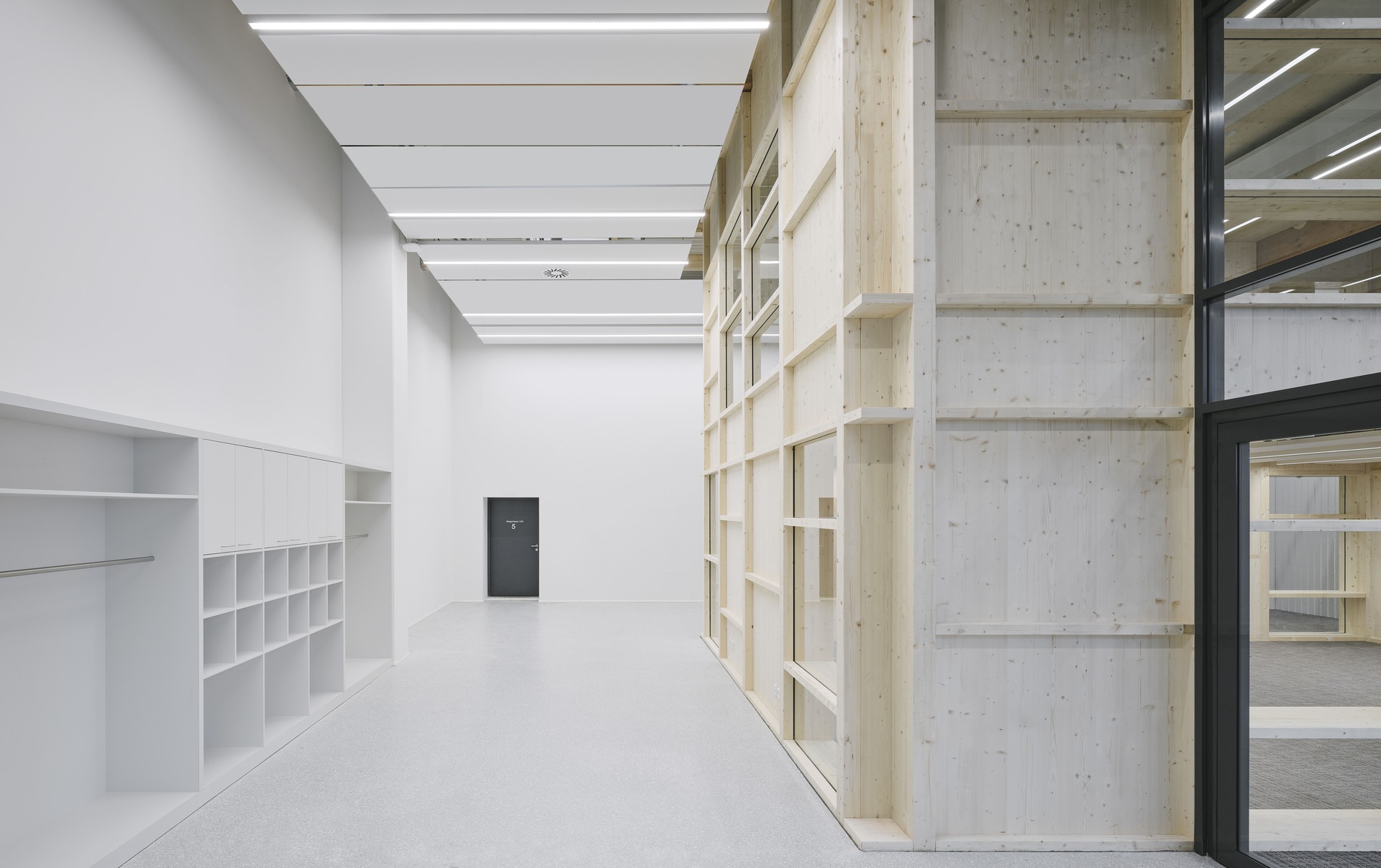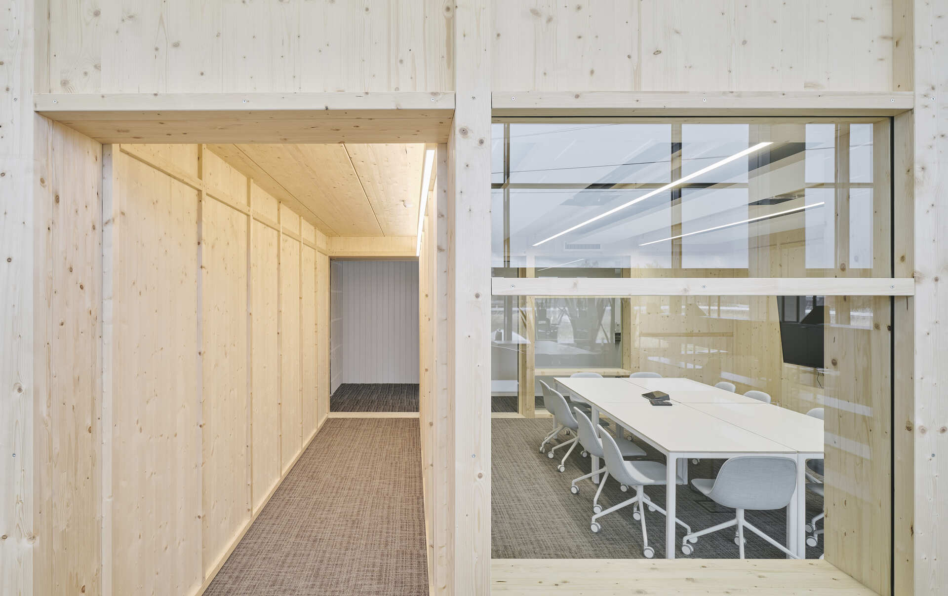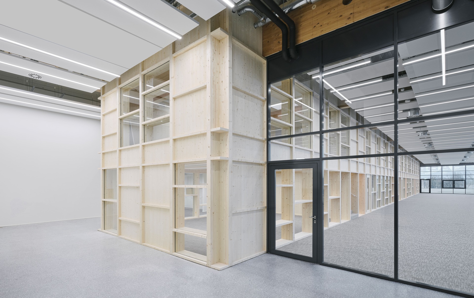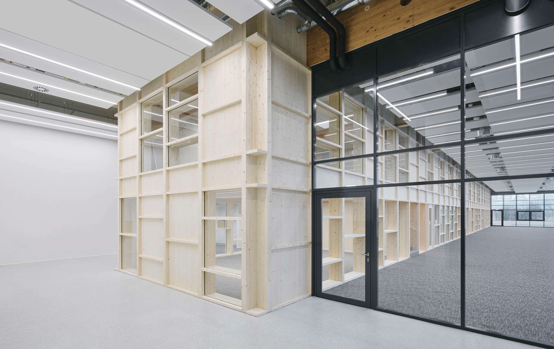 Inspiriert durch die angrenzenden Logistikhochregale ergänzten die Architektinnen die Bestandshalle mit einem eingestellten Holzbaukörper. Der offene, zweigeschossige Einbau zoniert den Bestand und bietet Raum für differenzierte Arbeitsabläufe. Es entstehen unterschiedliche Bürogrößen, Besprechungsräume, Nebenräume sowie großzügige Gemeinschafts- und Pausenflächen. Die naturbelassene, kompakte Holzkonstruktion fungiert als Filter zu den umliegenden Flächen und schafft durch ihre Materialität ein behagliches Arbeitsklima.