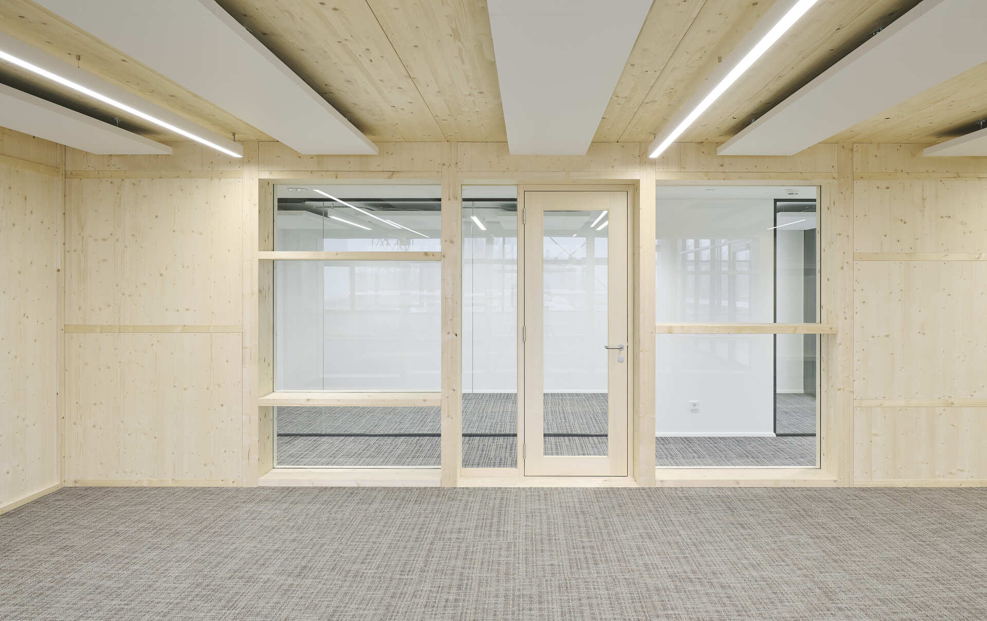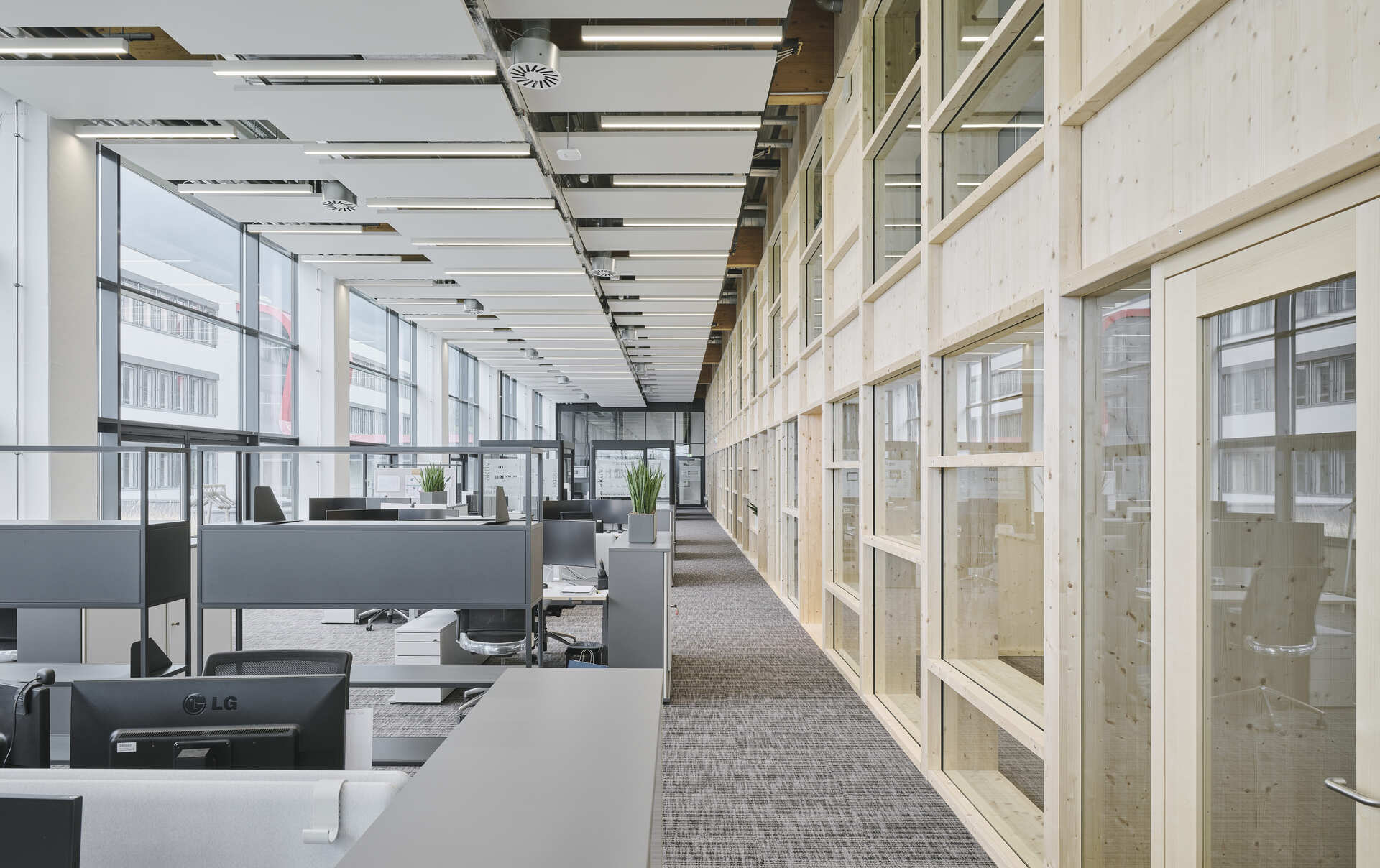 Durch den Einbau kann der Bestand unter Wiederverwendung der bereits verbauten grauen Energie zoniert und gegliedert werden und neue betrieblich notwendige Funktionen übernehmen. Das neue „Holzregal“ gliedert in dienende und bediente Räume, wodurch sich der überhöhte Open-Space-Bereich geschickt verkleinern ließ und die notwendigen Flächen für unterschiedlich große Einzelbüros, Fokusräume, Gruppen- und Besprechungsräume sowie Gemeinschafts- und Pausenbereiche geschaffen werden konnten. (Text: Architektinnen, bearbeitet)