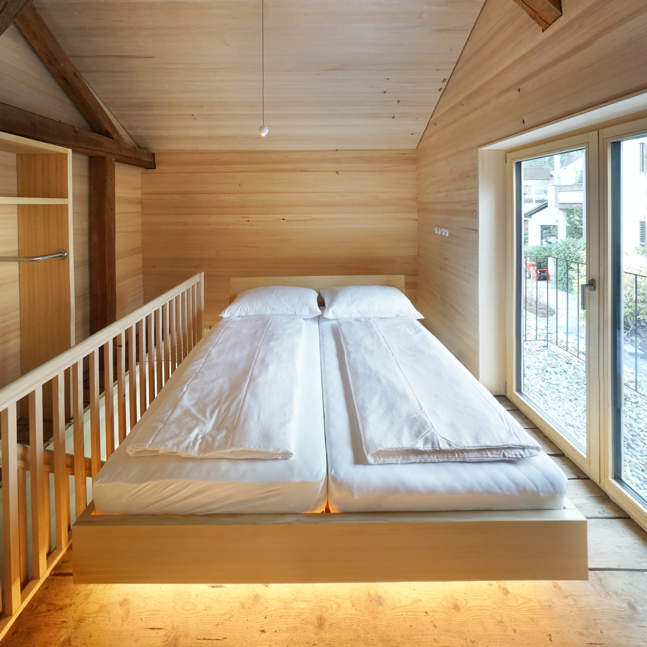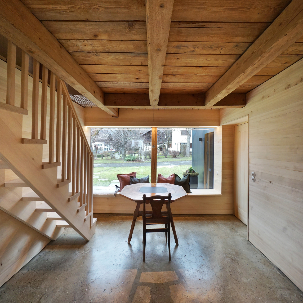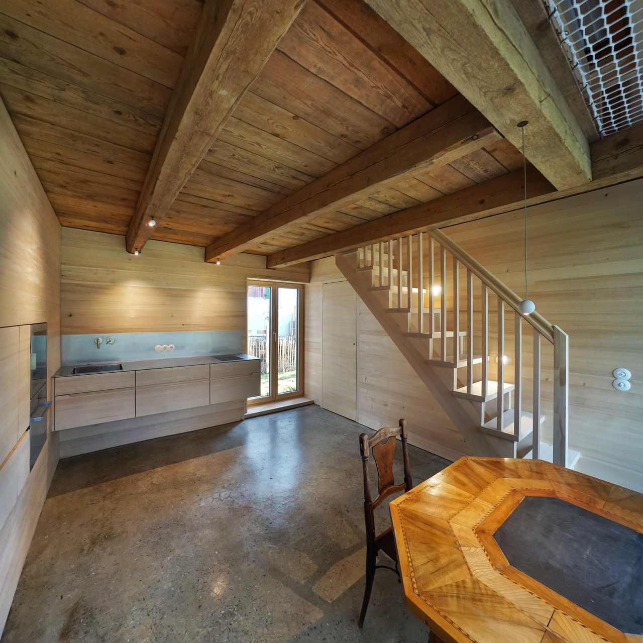 Die Zwischendecke aus einer Balkenlage mit Bretterboden ist lediglich gereinigt und teils zur Belichtung geöffnet. Wand- und Deckenoberflächen sind mit unbehandelter Weißtanne verschalt, der Boden als Lehmstampfboden mit Fußbodenheizung ausgeführt. Das Haus wird über die Fernwärmeleitung des Elternhauses beheizt und die bestehende Solaranlage am Dach weitergenutzt.