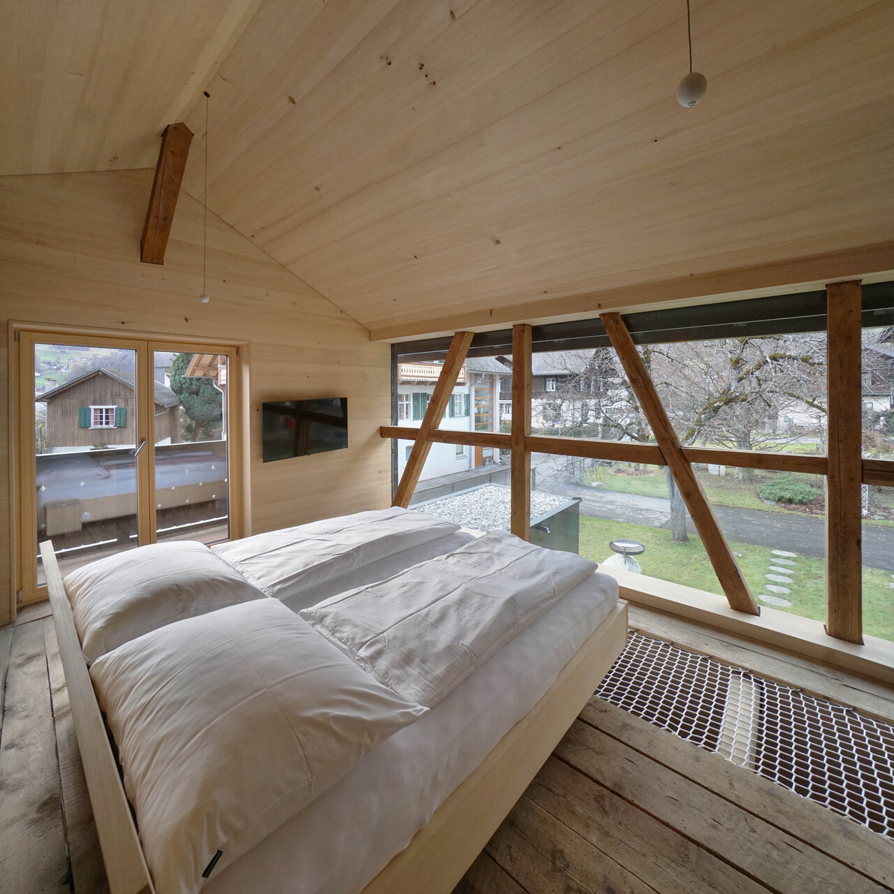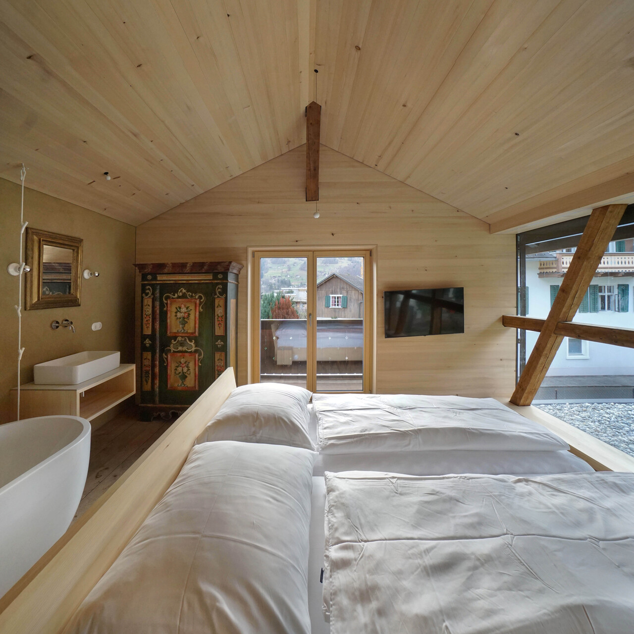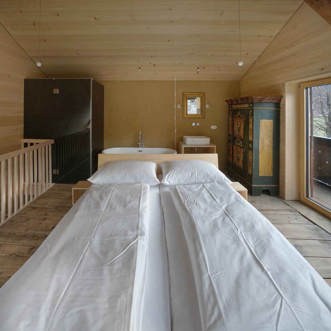 Dazu bedurfte es einer neuen Nutzung. Der einstige Stall wurde zum Gehäuse von zwei Ferienwohnungen. Sein Kern blieb möglichst unverändert, seine Formen- und Materialsprache bestimmt das Neue. Durchwegs wurden Baustoffe verwendet, die gut altern. Behutsam ist das neue Raumprogramm in die Bestandsstruktur eingewoben und tritt an den Eingangszubauten, großen Glasscheibe und Balkonen zu Tage.