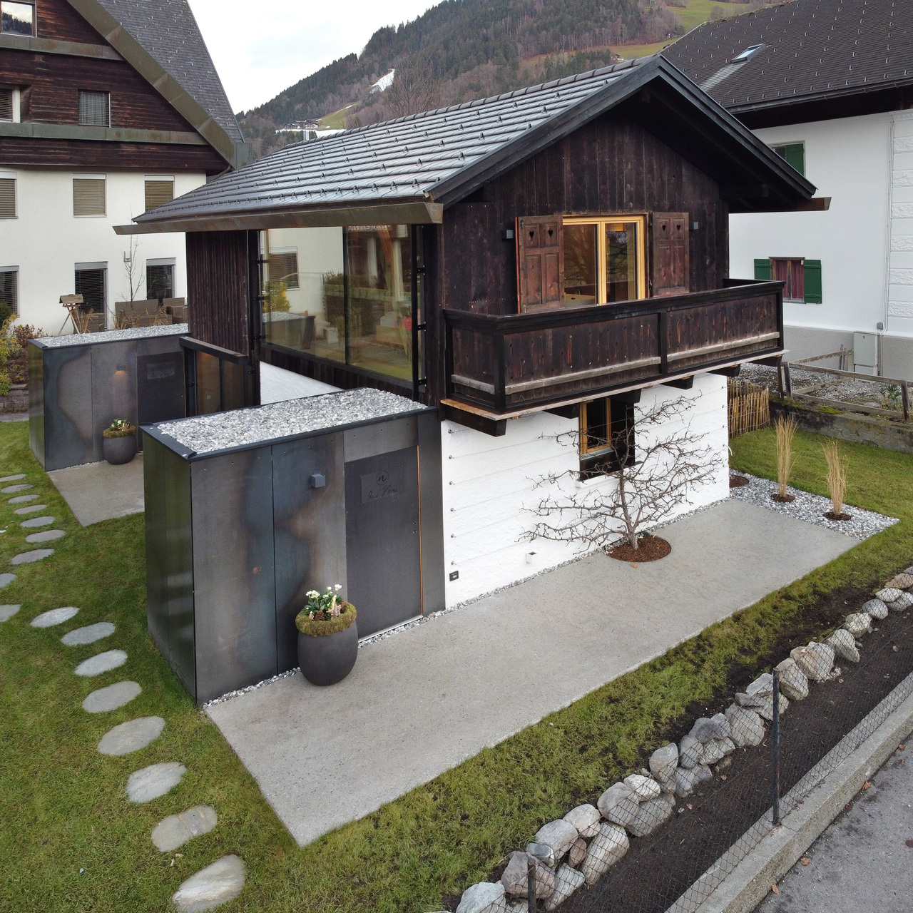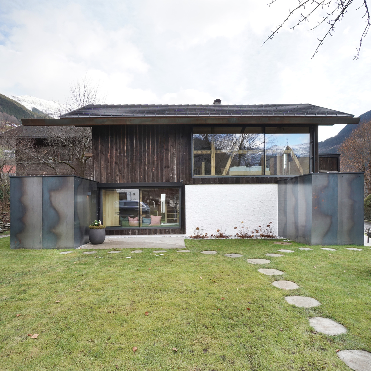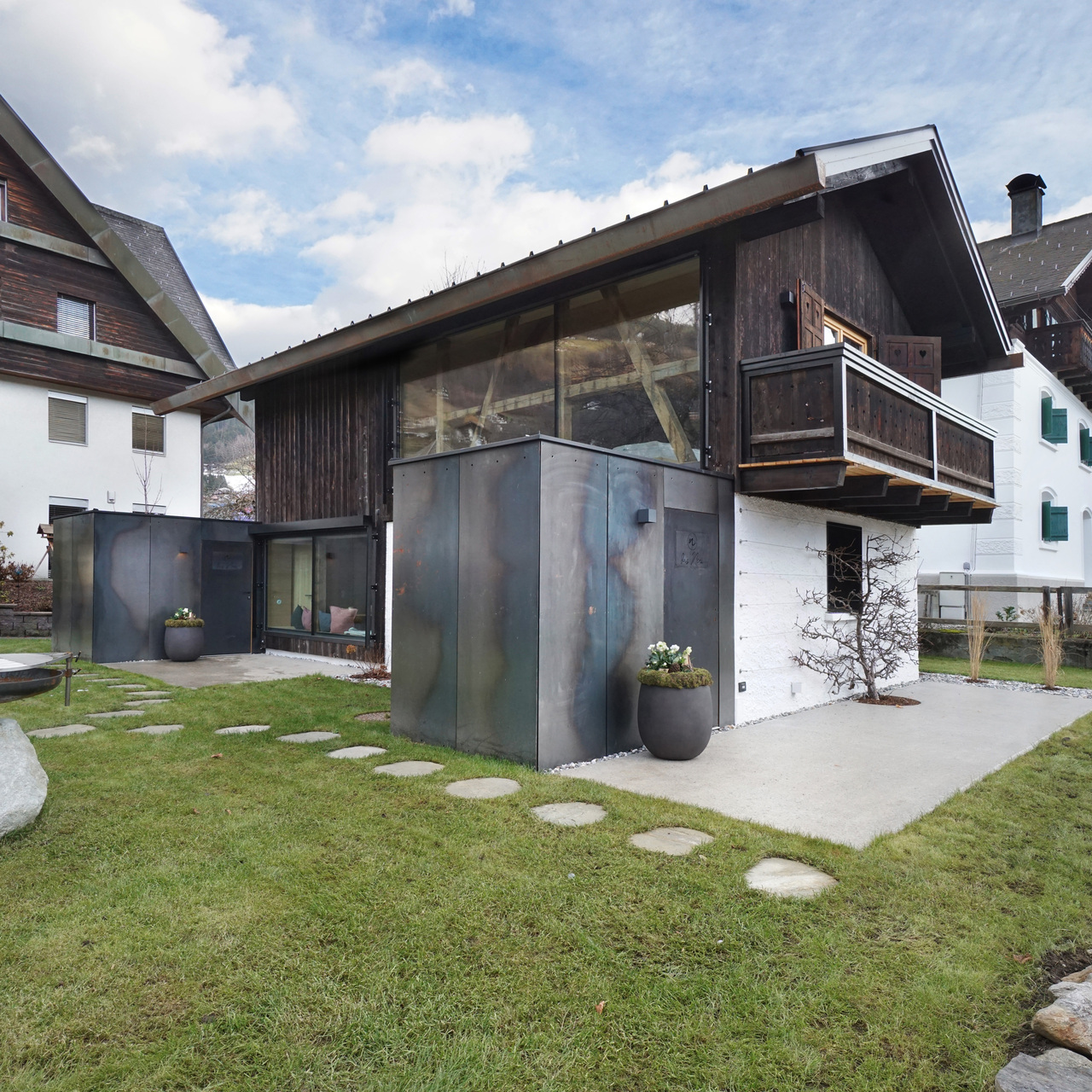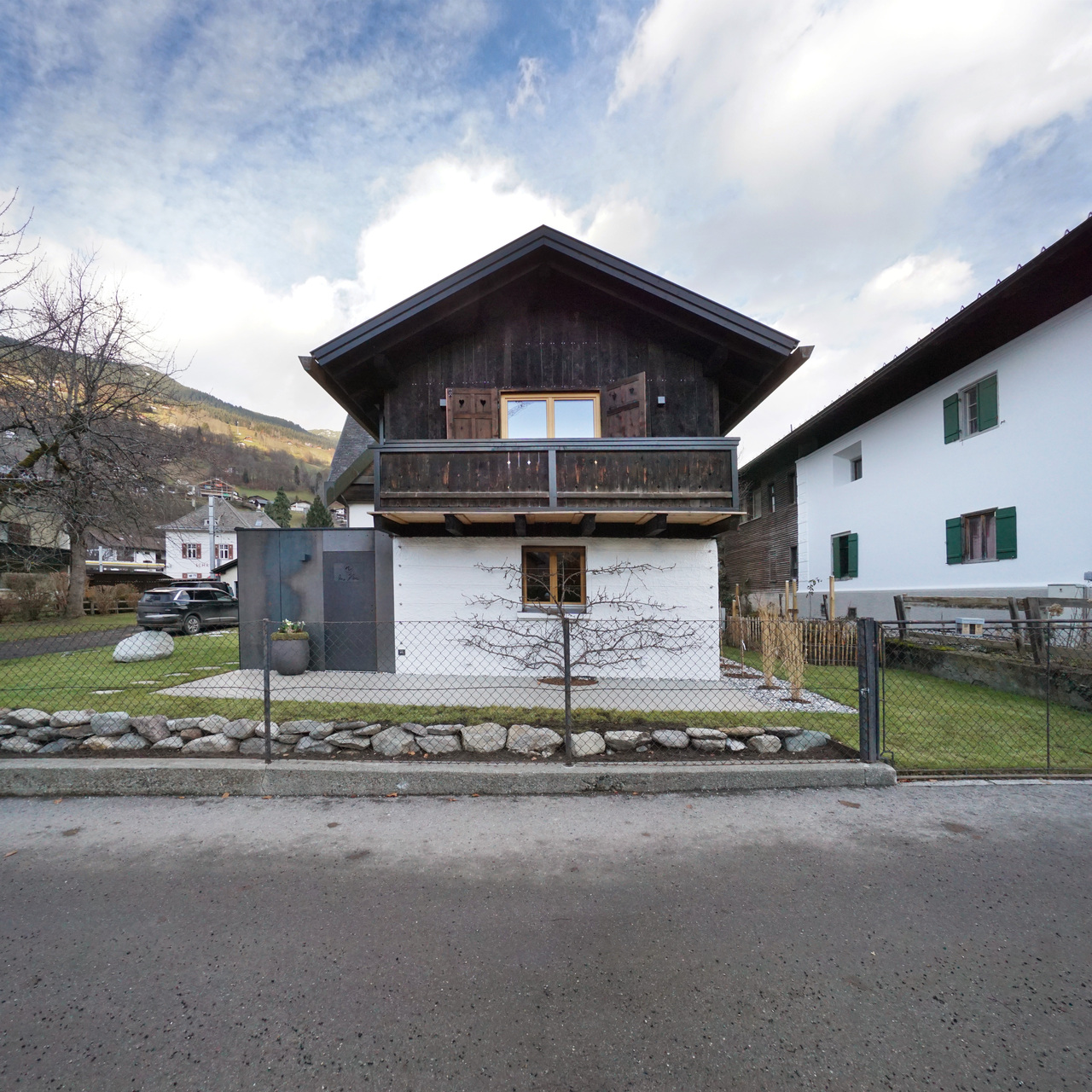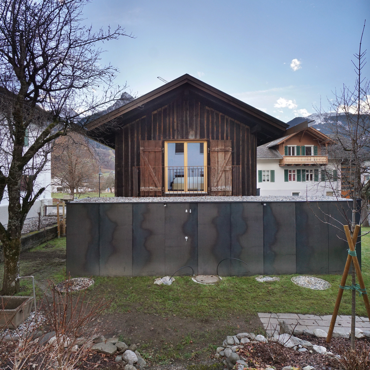 Der etwa 80-jährige Stall in Schruns im Montafon war so ein Gebäude. Nicht mehr genutzt, doch in den Ort eingewachsen. Knapp fünf Meter breit, keine zehn Meter lang, steht er in einem Garten, hinter sich das Elternhaus des Bauherrn, vor sich die Unterdorfstraße und ein Feld. Die Hälfte des Erdgeschosses aus 50cm starken Ziegelmauern, der Rest ein Holzriegelbau.
