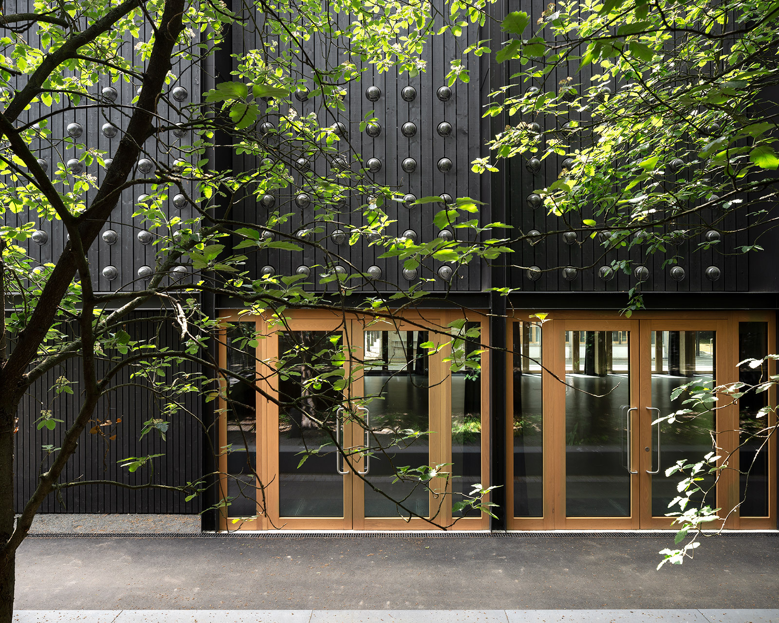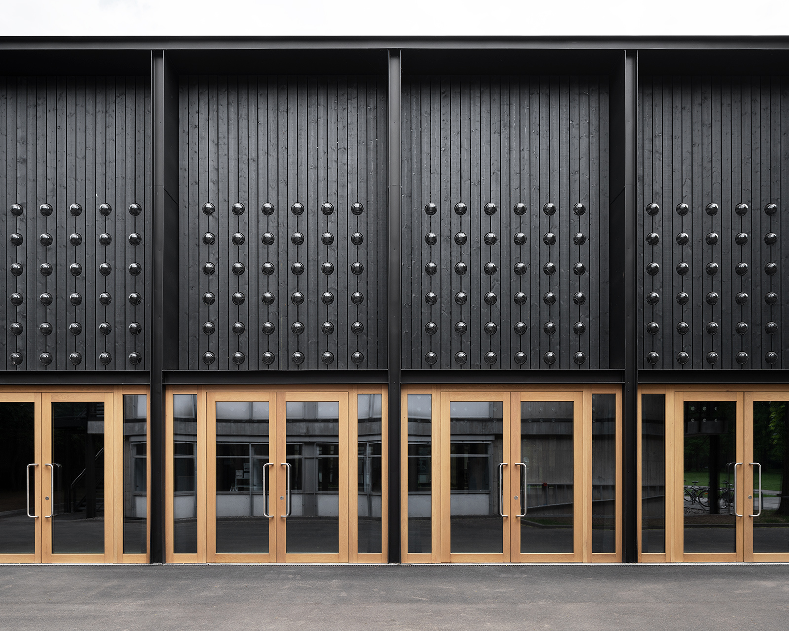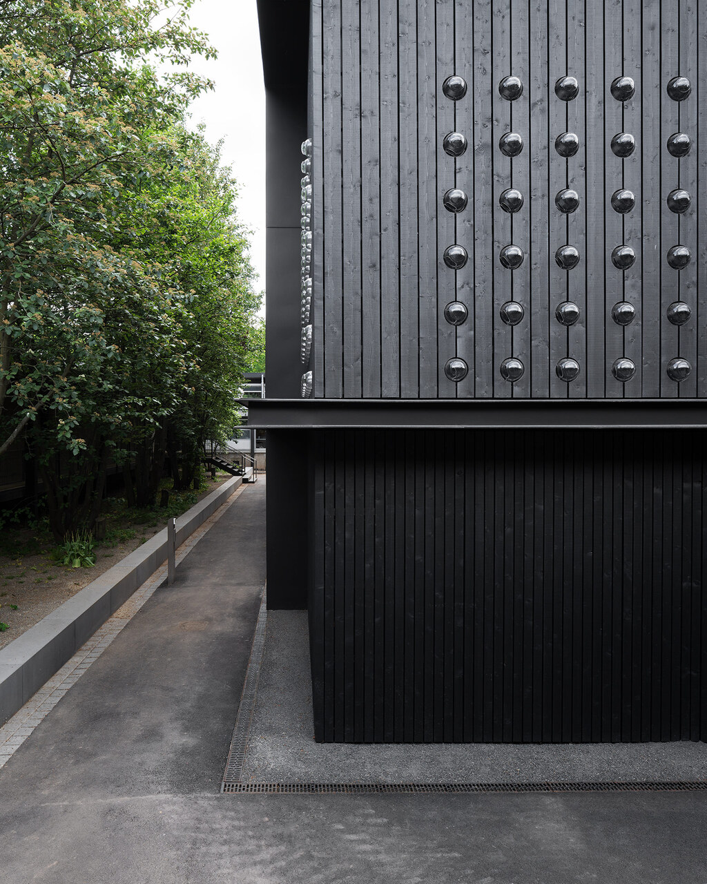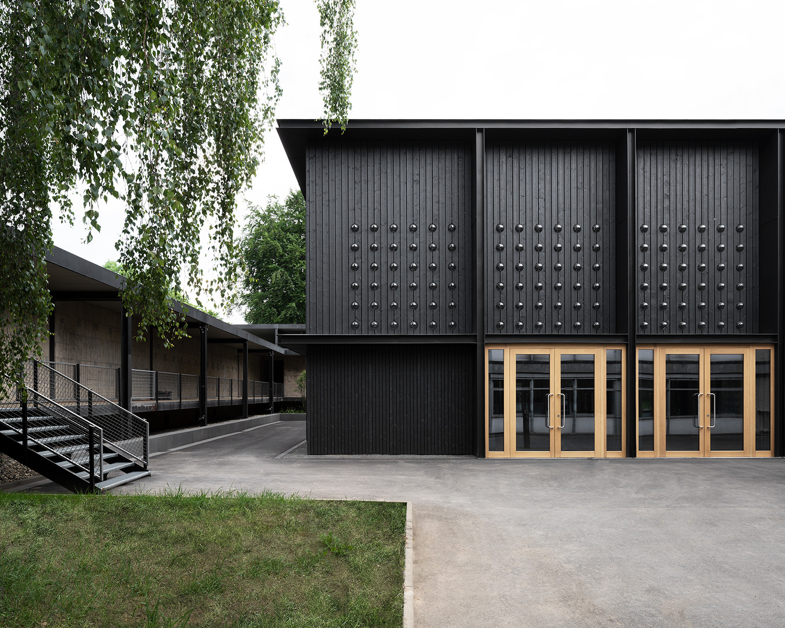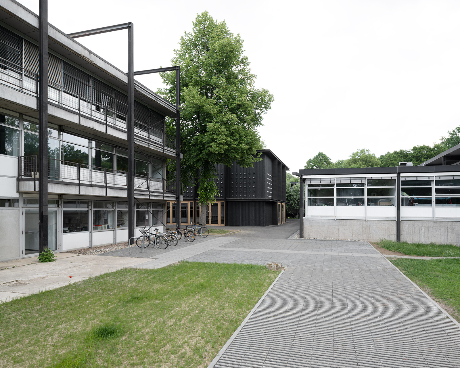 Der Farbton der dunkel gehaltenen Fassadengestaltung ist dem prägnantesten Bauteil des Posenenskebaus, der außen liegenden Stahlstruktur, entlehnt. Und auch die überall sichtbare, durch das hölzerne Tragwerk gegliederte Gebäudestruktur nimmt Bezug zum denkmalgeschützten Bestand. Dennoch setzt sich der Neubau deutlich vom Gebäudebestand ab und zeigt eine eigene Art von feingliedriger Architektursprache.