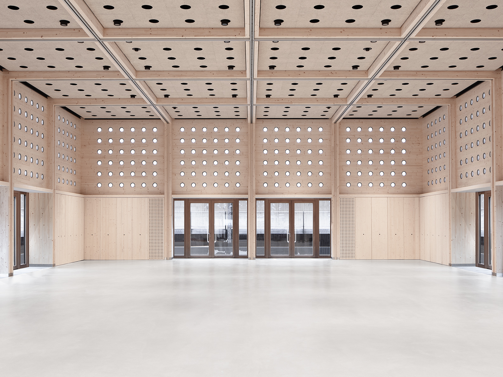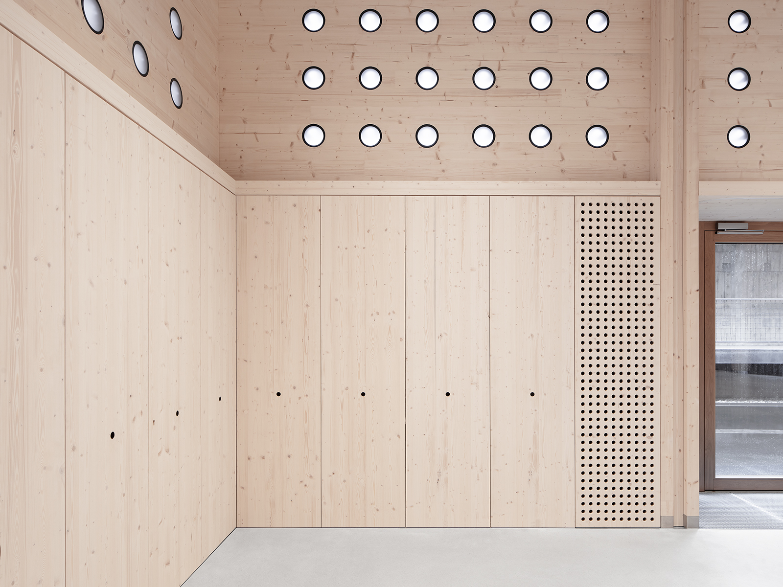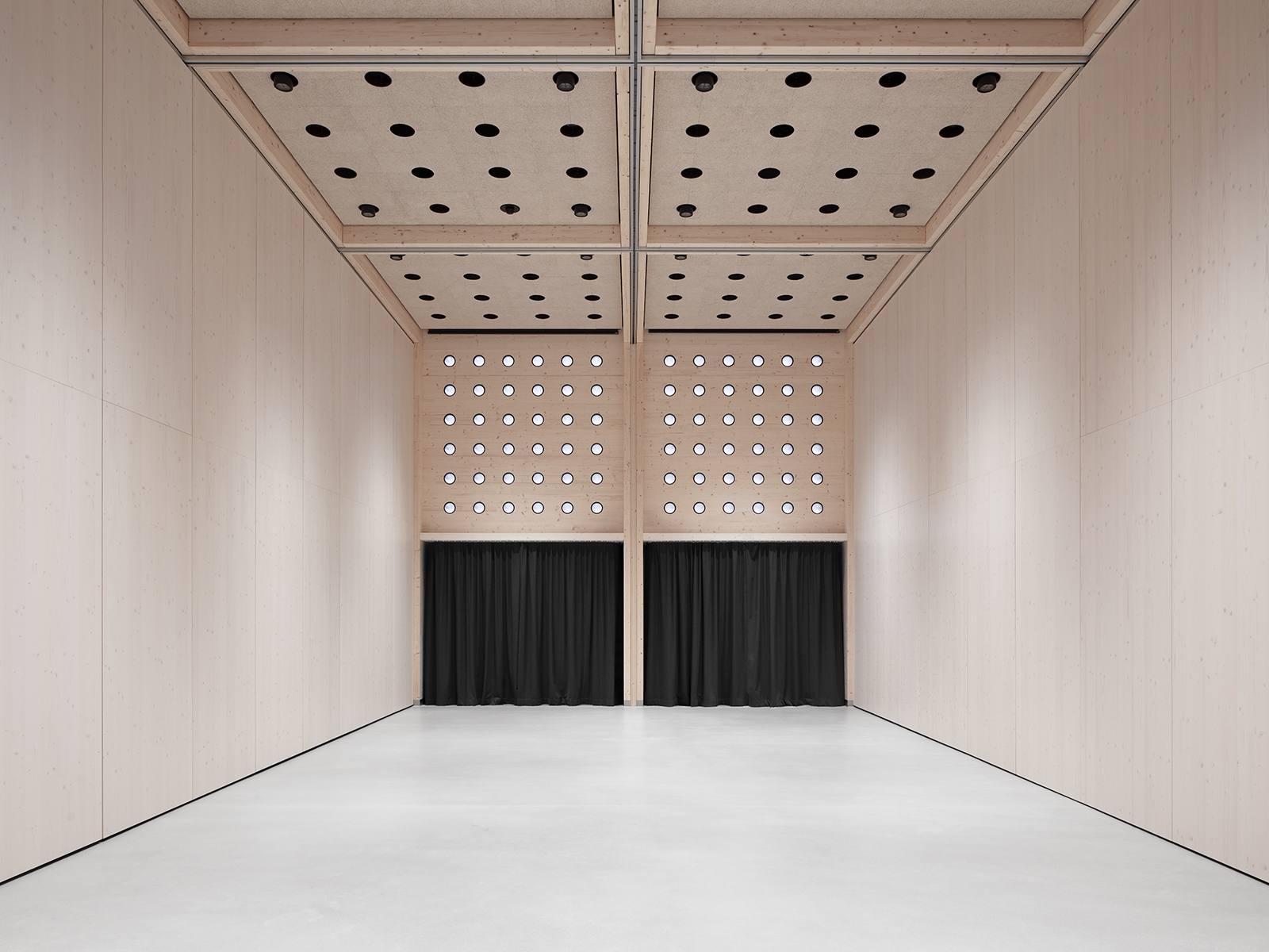 Die klare, innere Struktur macht die gewünschten Nutzungsvarianten möglich, von der ungeteilten Halle bis zum in zahlreiche Einzelräume geteilten Arbeits- oder Ausstellungsbereich. Auch die Ausformung der Fassaden macht unterschiedliche Arten des Zugangs und auch jede Lichtsituation bzw. Verdunkelungen möglich. Die rohen, unbehandelten Holzoberflächen des flexibel nutzbaren Innenraums nehmen subtile Bezüge zu den sägerau geschalten Sichtbetonflächen der Bestandsgebäude auf.