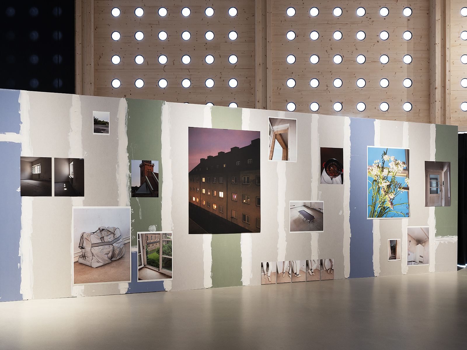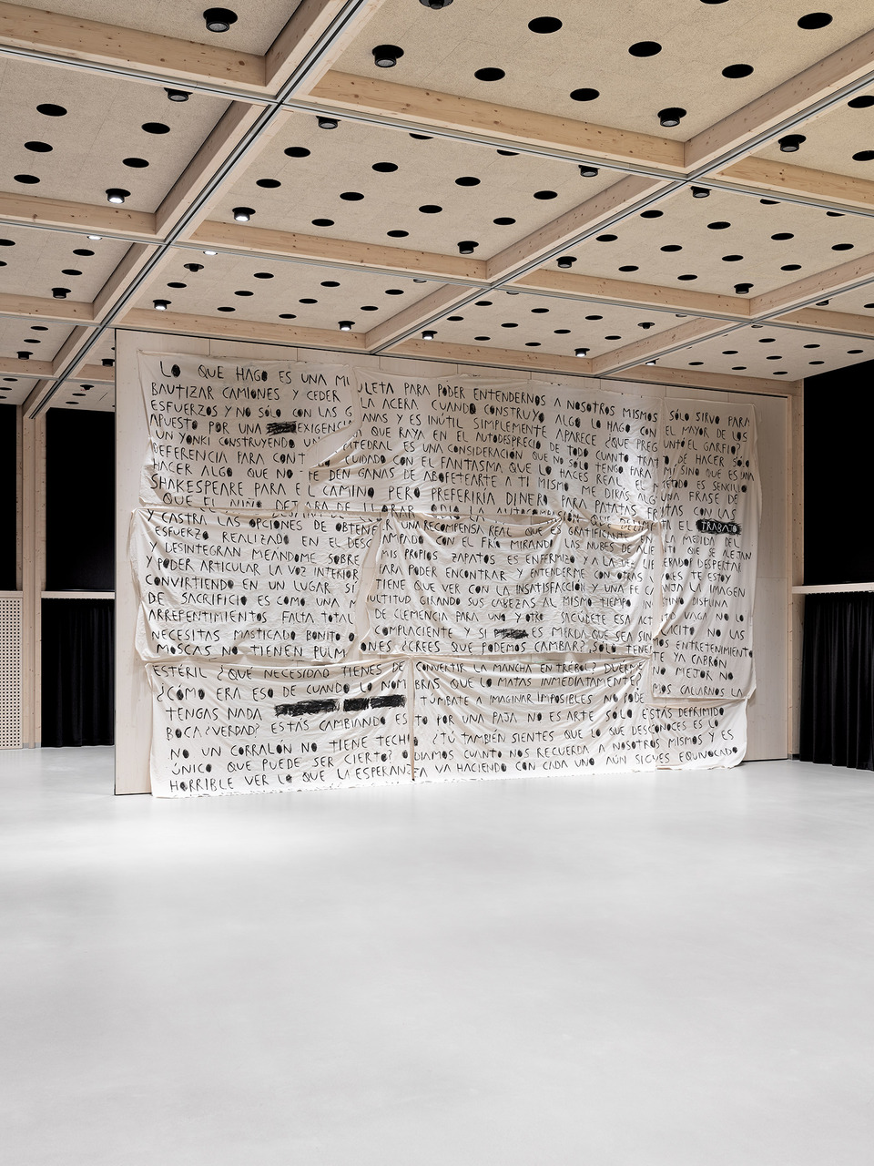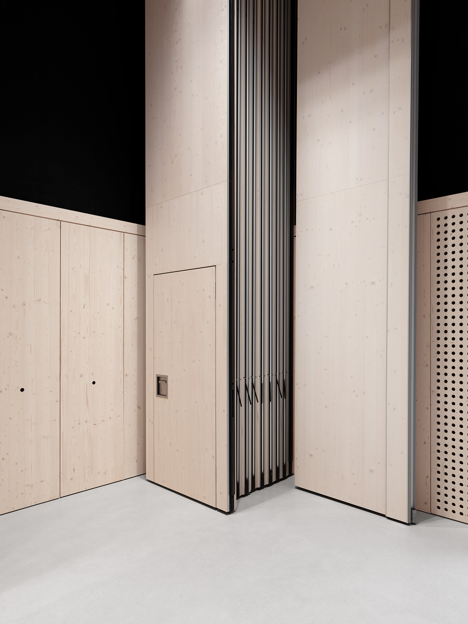 Die klare, innere Struktur macht die gewünschten Nutzungsvarianten möglich, von der ungeteilten Halle bis zum in zahlreiche Einzelräume geteilten Arbeits- oder Ausstellungsbereich. Auch die Ausformung der Fassaden macht unterschiedliche Arten des Zugangs und auch jede Lichtsituation bzw. Verdunkelungen möglich. Die rohen, unbehandelten Holzoberflächen des flexibel nutzbaren Innenraums nehmen subtile Bezüge zu den sägerau geschalten Sichtbetonflächen der Bestandsgebäude auf.