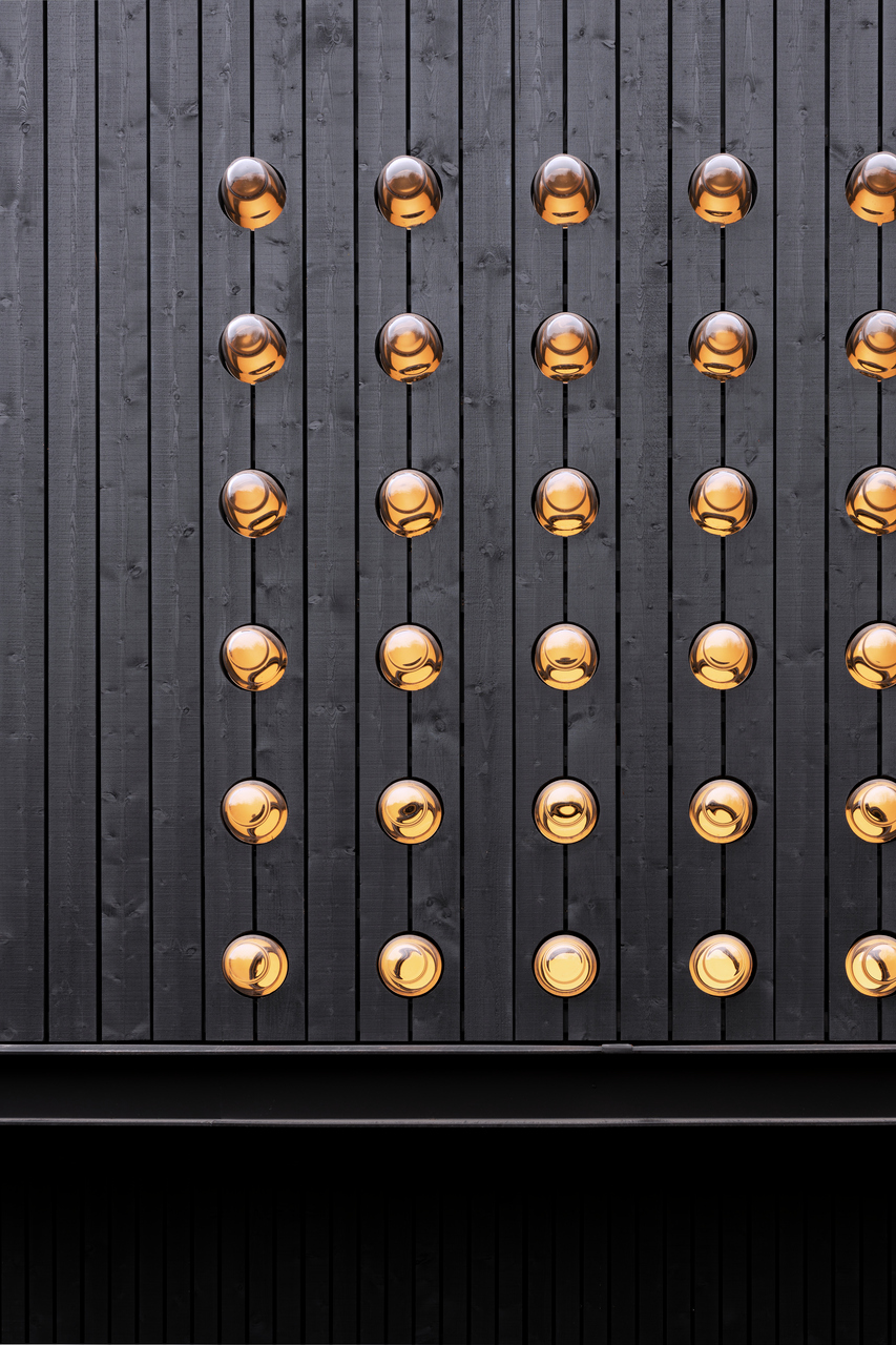 Eine Besonderheit sind die im oberen Wandbereich umlaufend angeordneten Lichtlinsen. Diese 864 eigens für das Projekt entwickelten, gewölbten Glaselemente bringen gleichmäßig diffuses Licht in den Innenraum. Grafisch und identitätsstiftend verleihen sie der Ausstellunghalle die gewünschte Sonderstellung im Ensemble.