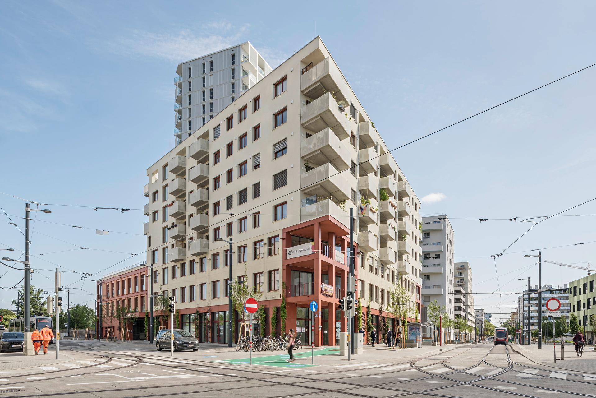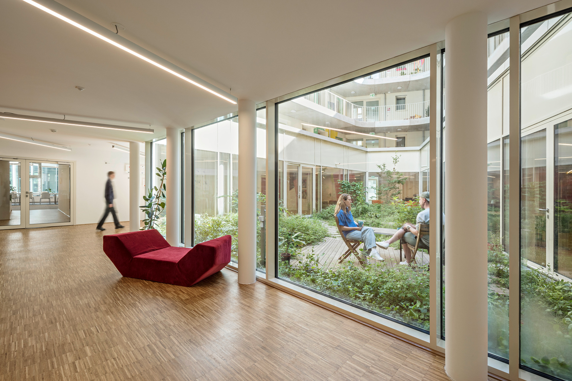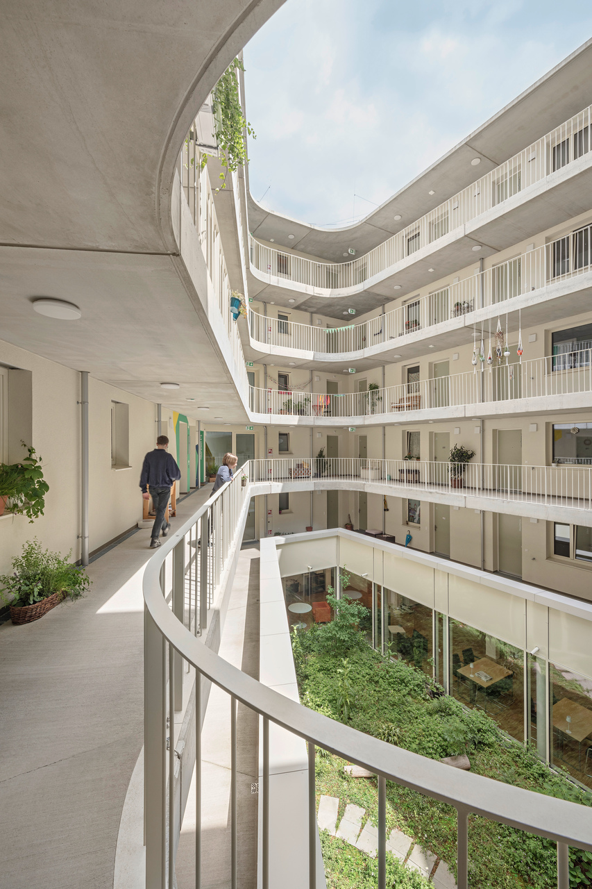 Die Räume im Gebäudeinneren werden durch zwei eingeschnittene Atrien natürlich belichtet und um Grünraum erweitert. Ein umlaufender Laubengang erschließt die Wohngeschosse und dient als Begegnungsort für die Hausgemeinschaft.