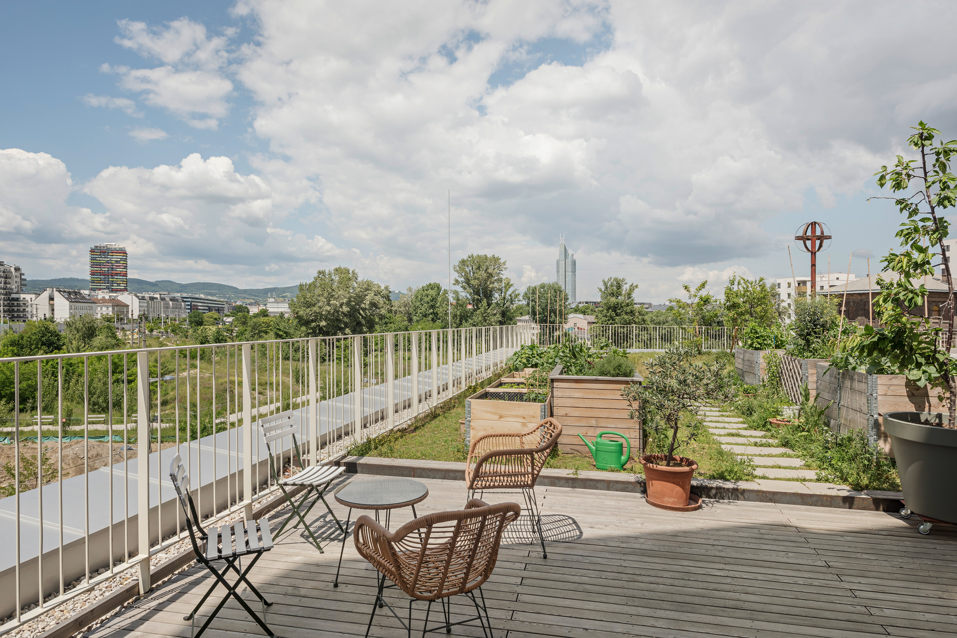 Die weitläufige Gemeinschaftsterrasse im 3. OG steht in Verbindung mit der Gemeinschaftsküche und dem Kinderspielraum; sie dient dem allgemeinen Aufenthalt, als Kleinkinderspielplatz und zum urban gardening. Im 7. OG bietet eine kleinere Terrasse im Anschluss an die gemeinschaftlich genutzte Sauna mit Ruhebereich Rückzugsmöglichkeiten im Freien.