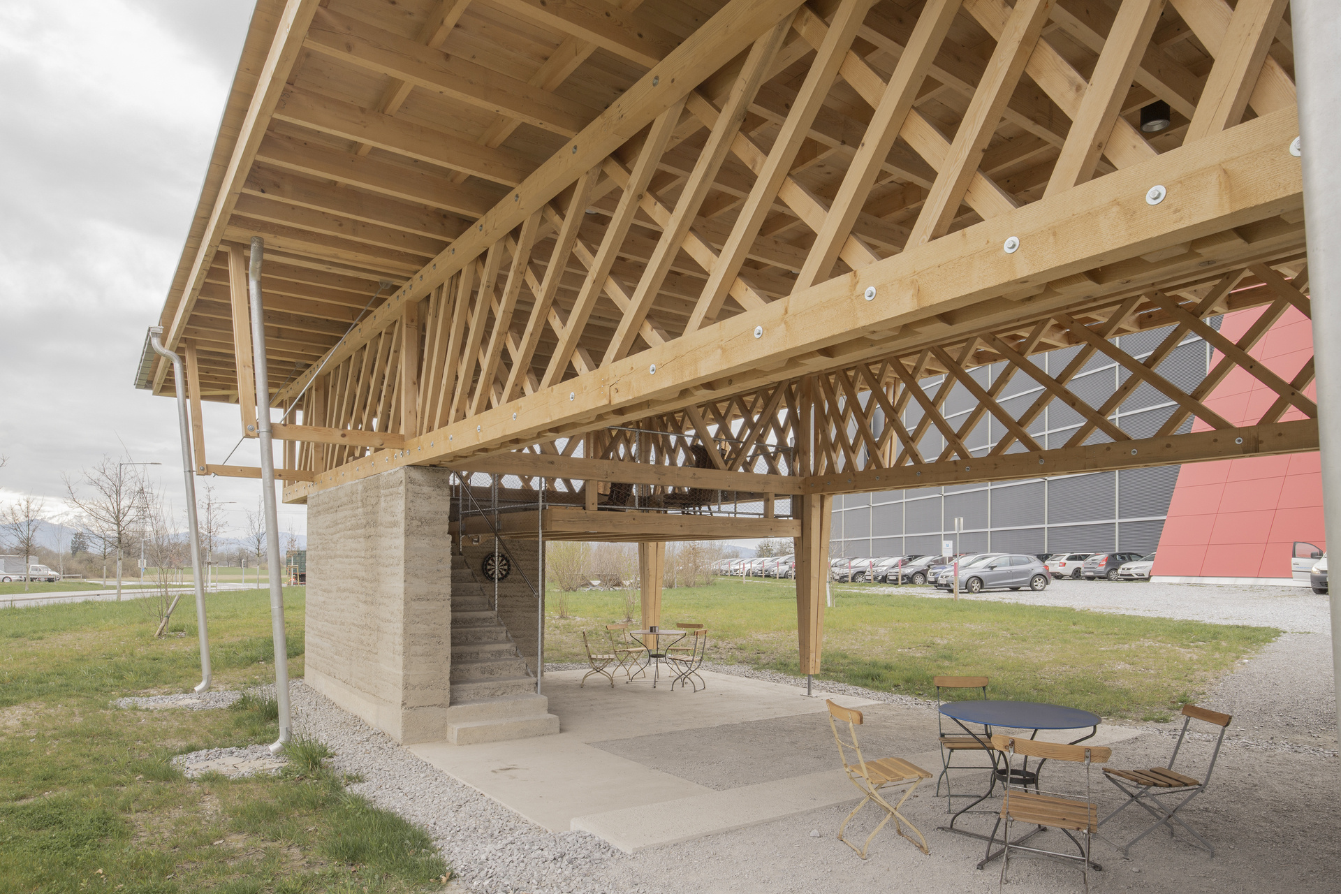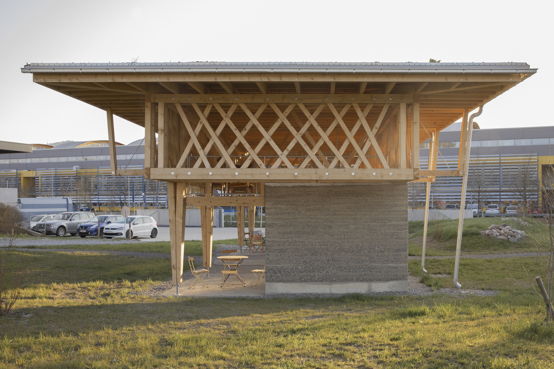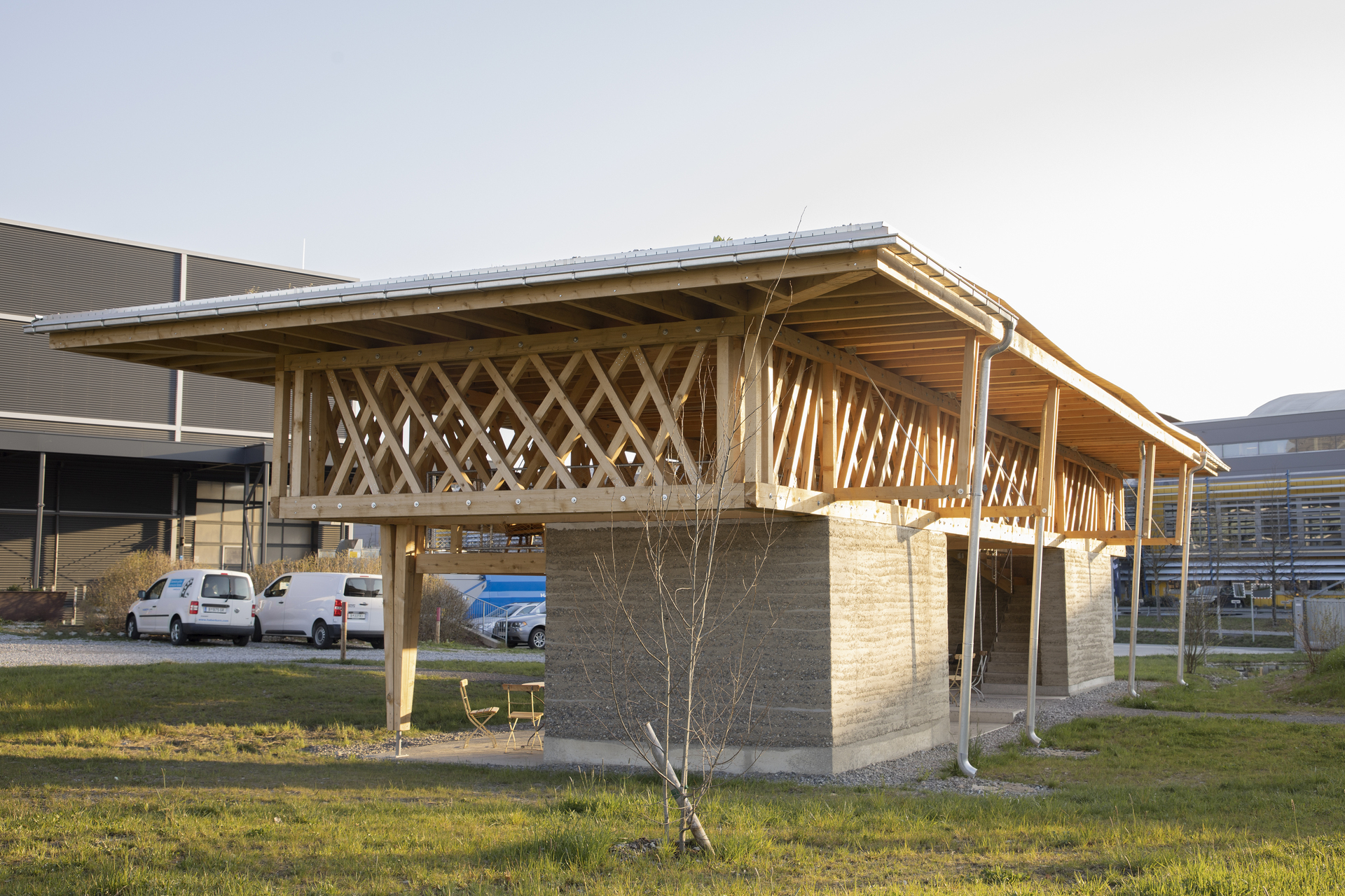 Während auf der Wiese Habitate für eine höhere Biodiversität geschaffen wurden, ist der Pavillon ein Beitrag zur Qualitätssteigerung des Arbeitsumfelds für die Belegschaft. Auf der südöstlichen Ecke des Geländes gelegen, bietet er vielseitig nutzbare, überdachte Flächen auf zwei Ebenen. Zwei Aufgänge führen in das Obergeschoss, das primär für Besprechungen konzipiert ist.