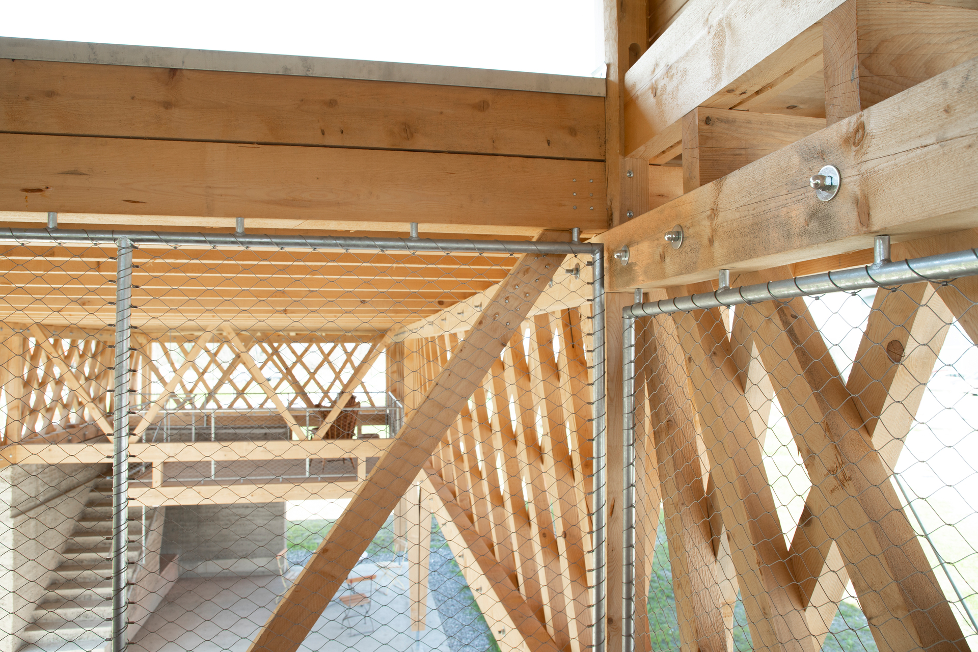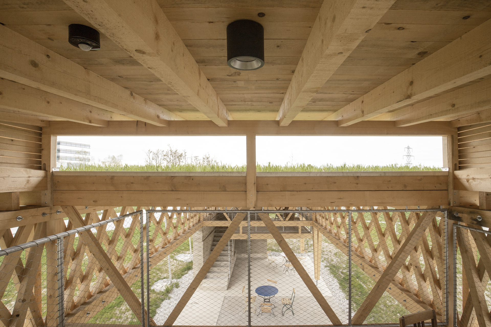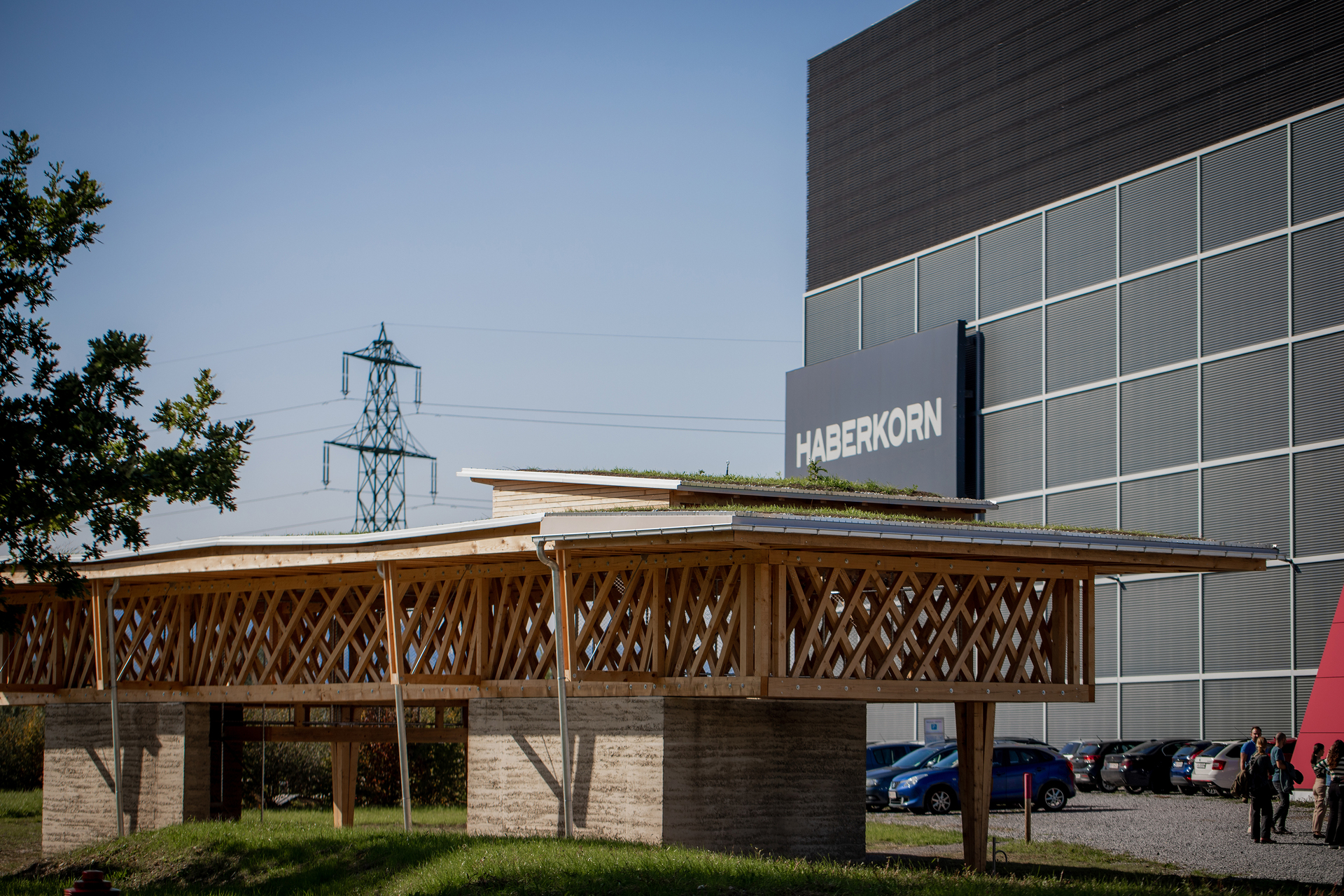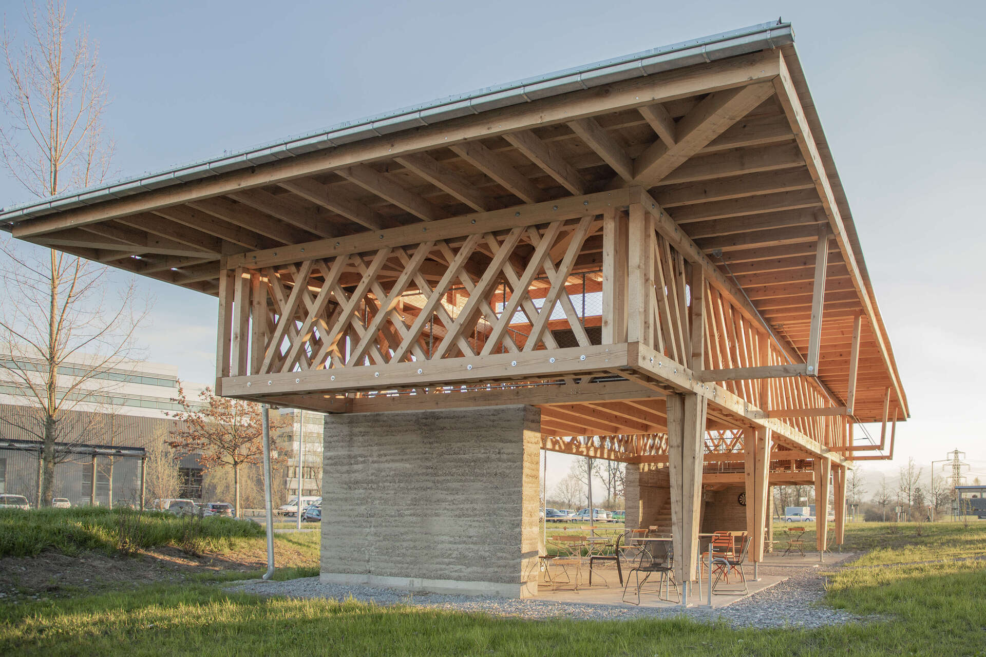 Während auf der Wiese Habitate für eine höhere Biodiversität geschaffen wurden, ist der Pavillon ein Beitrag zur Qualitätssteigerung des Arbeitsumfelds für die Belegschaft. Auf der südöstlichen Ecke des Geländes gelegen, bietet er vielseitig nutzbare, überdachte Flächen auf zwei Ebenen. Zwei Aufgänge führen in das Obergeschoss, das primär für Besprechungen konzipiert ist.