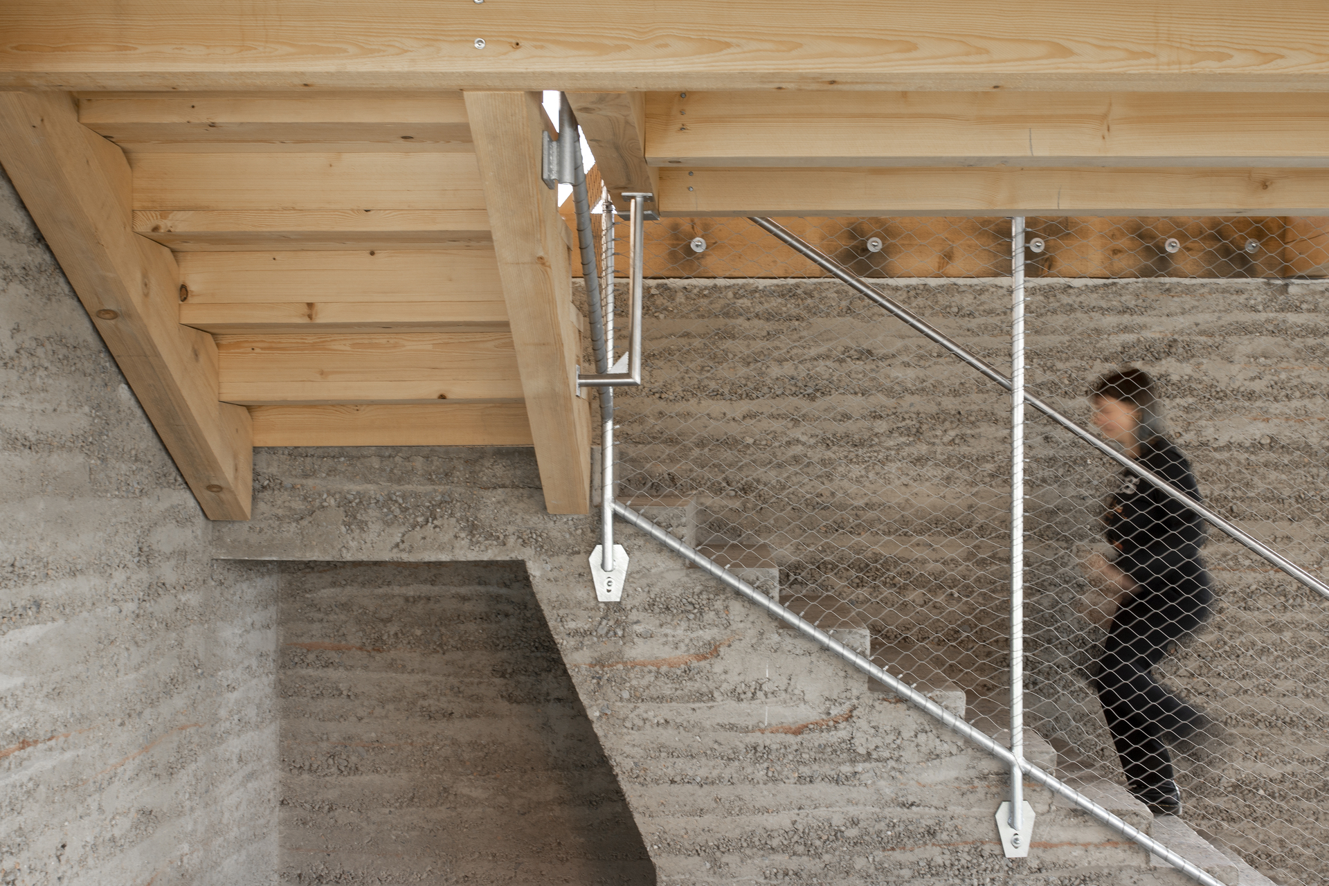Die Bauweise sollte einfach sein. Bauwerke aus der umgebenden Riedlandschaft, vor allem die Holzkonstruktion der denkmalgeschützten Senderbrücke (1916), waren „naheliegende“ Vorbilder. Gegründet ist das Gebäude auf Holzpfählen, mit einer Bodenplatte aus Beton. Darauf stehen Stampflehmwände und vier Holzstützen, die das Holzfachwerk darüber tragen. Bei der Auswahl des Holzes und der Verarbeitung war Regionalität oberste Prämisse. Das Dach besteht aus flachen, begrünten Satteldächern. (Text: Tobias Hagleitner, nach einem Text des Architekten)
