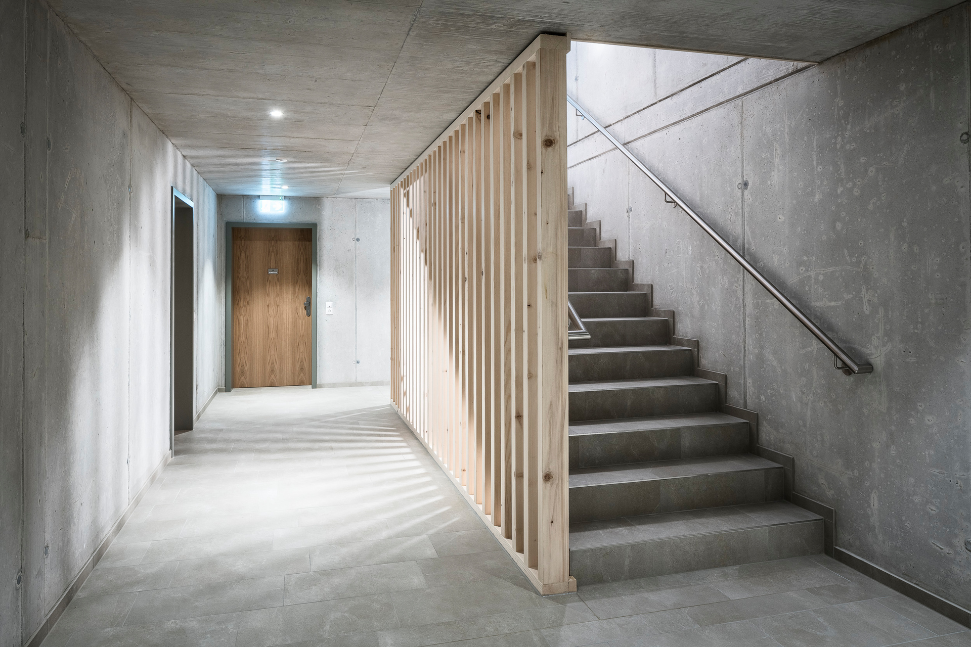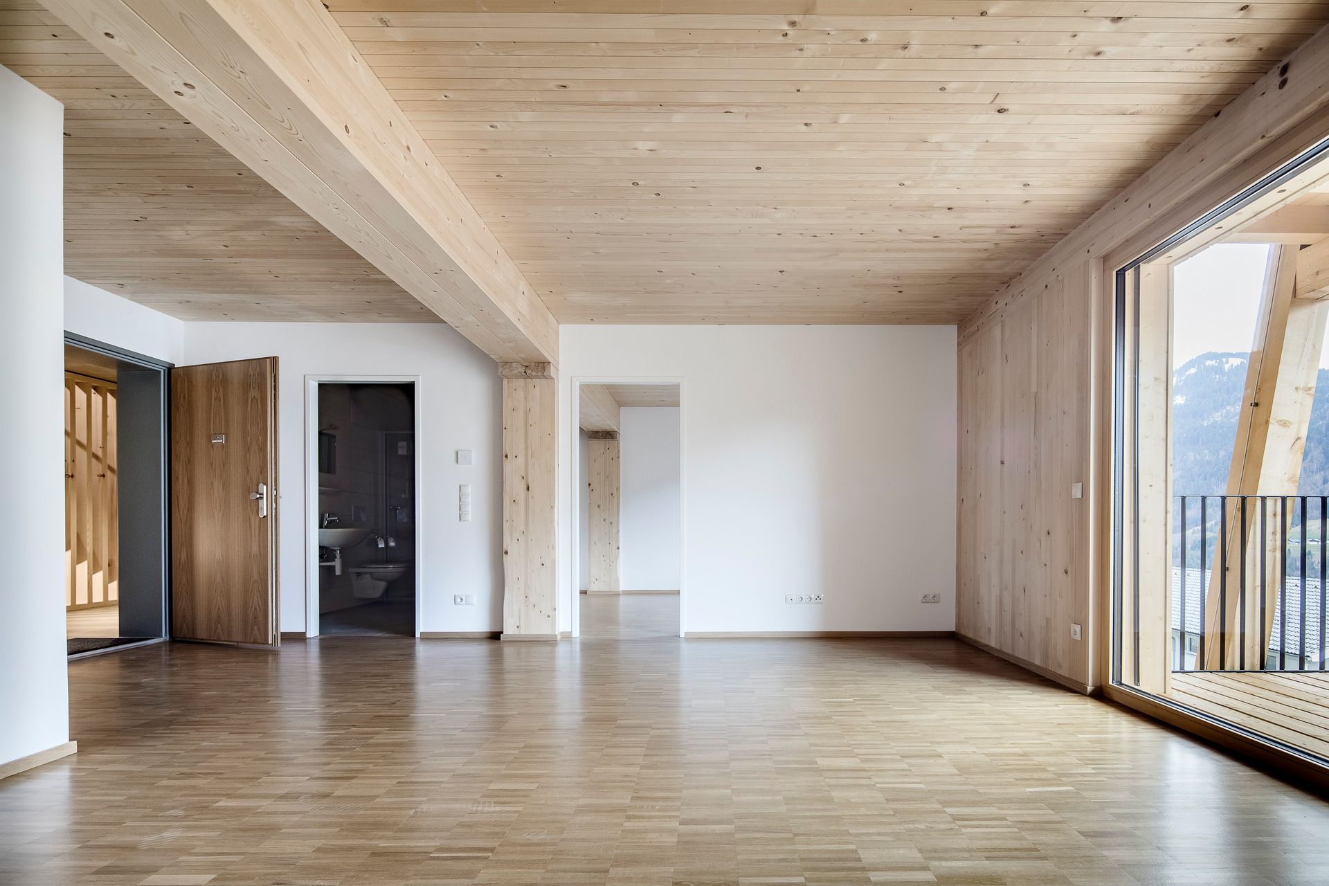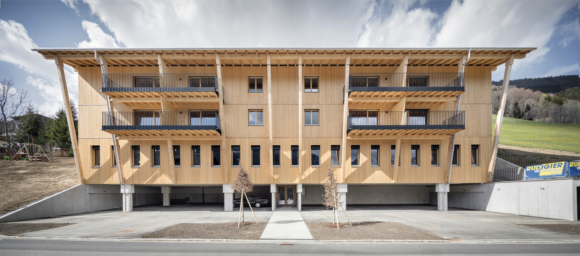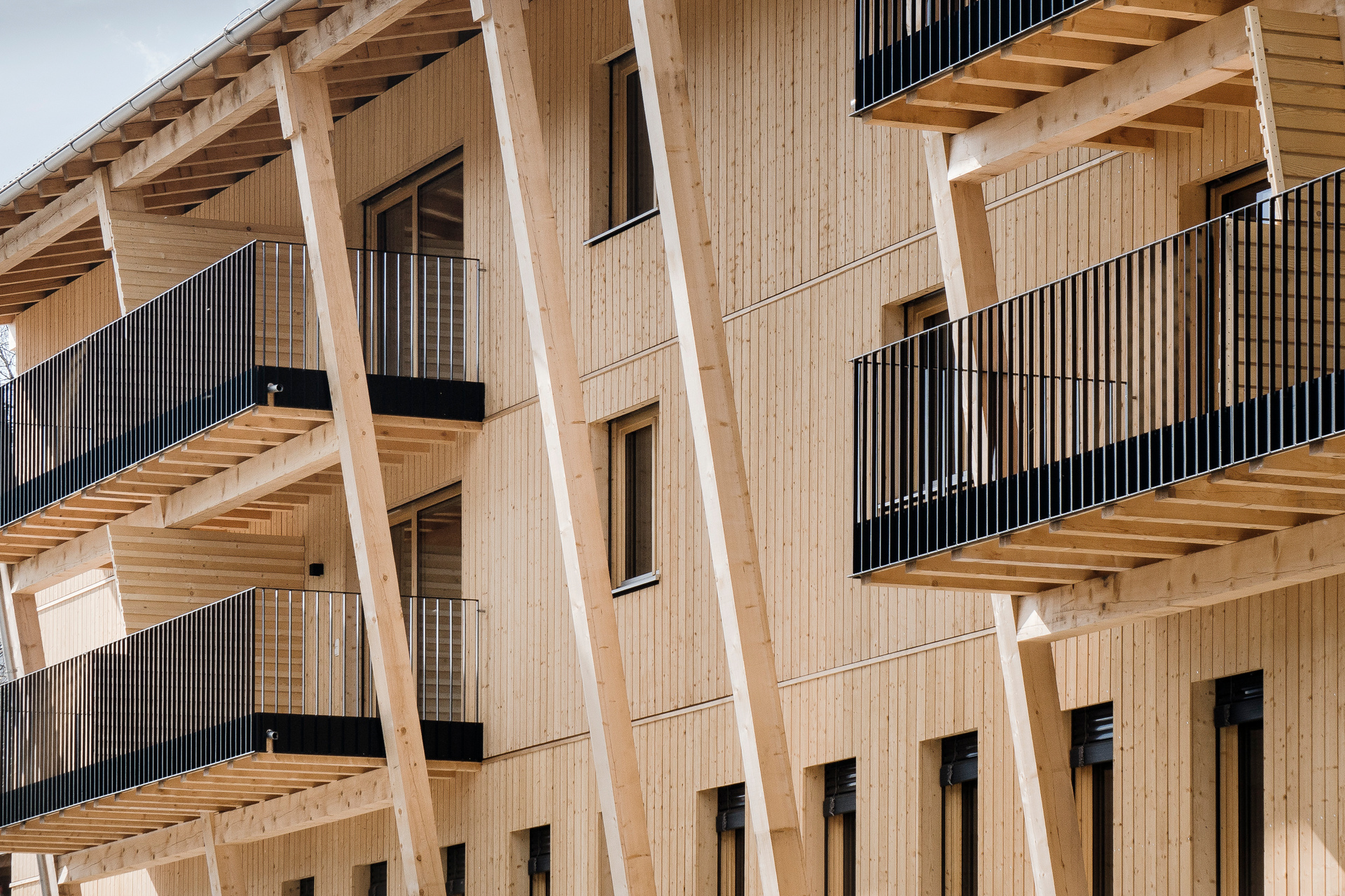 Decken und Aussenwände sind aus Massivholzelementen vorgefertigt, Fassaden, Stützen und Träger sind in Vollholz konstruiert. Alle Hölzer sind roh und unbehandelt. Das gleichmässig umlaufende Vordach und eine konsequente Sockelausbildung bildet einen konstruktiven Holzschutz für die Fassade. Sie wird so mit den Jahren eine schöne und gleichmäßige Patina entwickeln. Die zwischen die Schrägstützen eingehängten Balkone gliedern die Geschosse und wirken identitätsstiftend. (Text: Isabella Marboe, nach einem Text der Architekten)