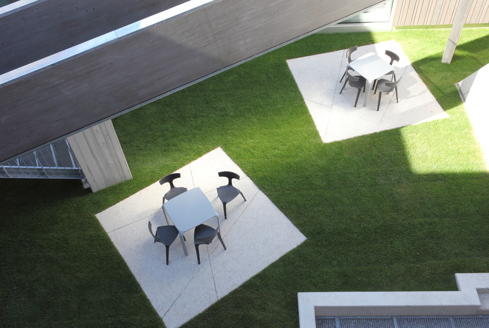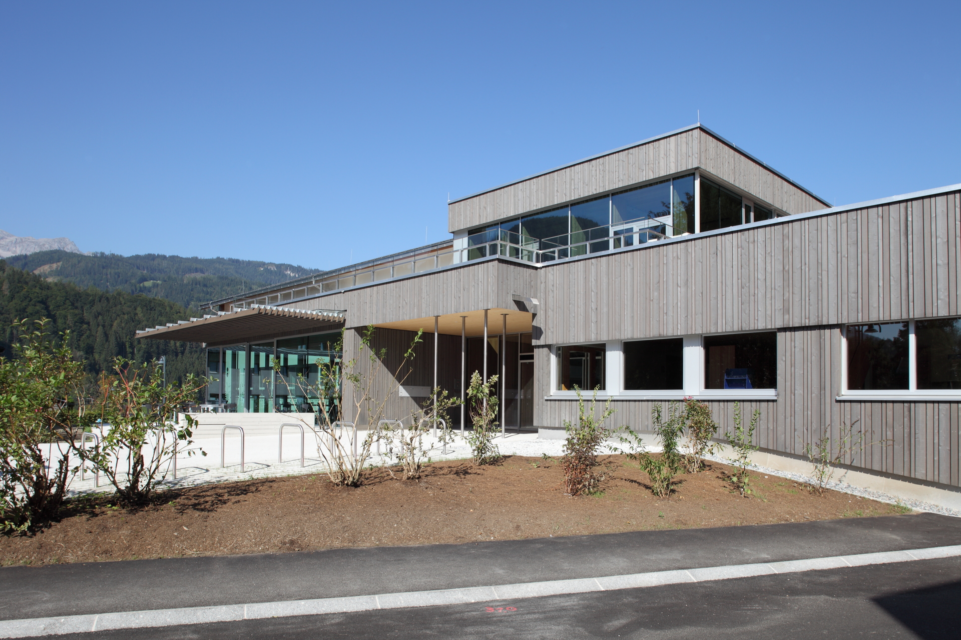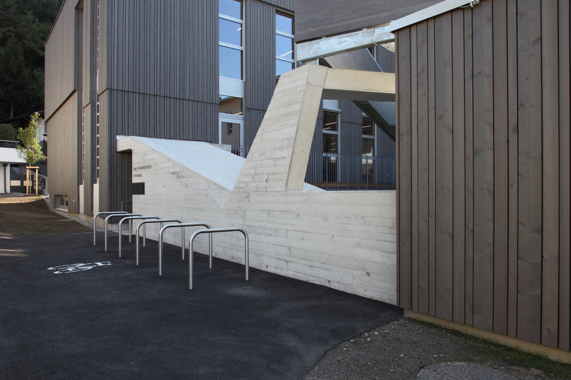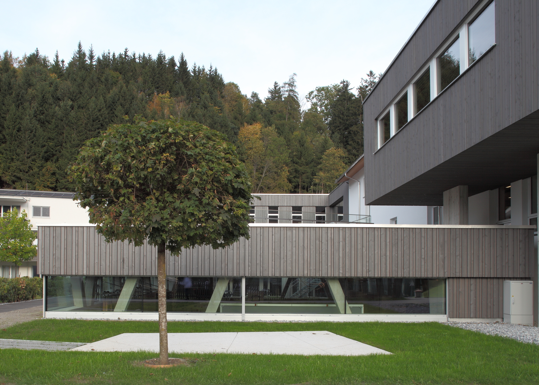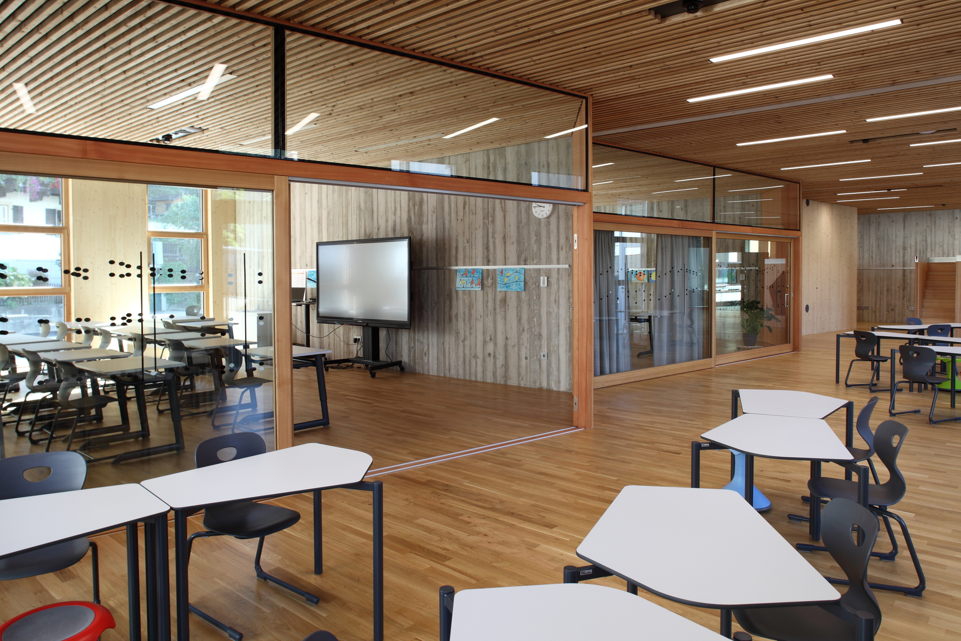 Angesichts der geringen Flächenressourcen und benachbarten Bebauung war die Erweiterung der Nutzflächen von 4 auf 8 Klassen planerisch herausfordernd. Inhaltlich gesehen erfolgte die Transformation von einem klassischen Gangtypus mit daran aufgefädelten Klassenzimmern zu einer zeitgemäßen Schule mit großen, offenen Lern- und Unterrichtsbereichen. Synergien und Mehrfachnutzungen wurden angesichts der begrenzten Platzsituation notwendig und geschickt umgesetzt. Das zeigt etwa die Nutzung des Turnsaaldaches als Frei- und Pausenfläche oder der abgesenkte Innenhof, der gleichzeitig Eingangsbereich für die externe Nutzung des Schulgebäudes und Lichthof für die Räume des Musikvereins des Turnsaales, der Garderoben und Lagerräume ist.
