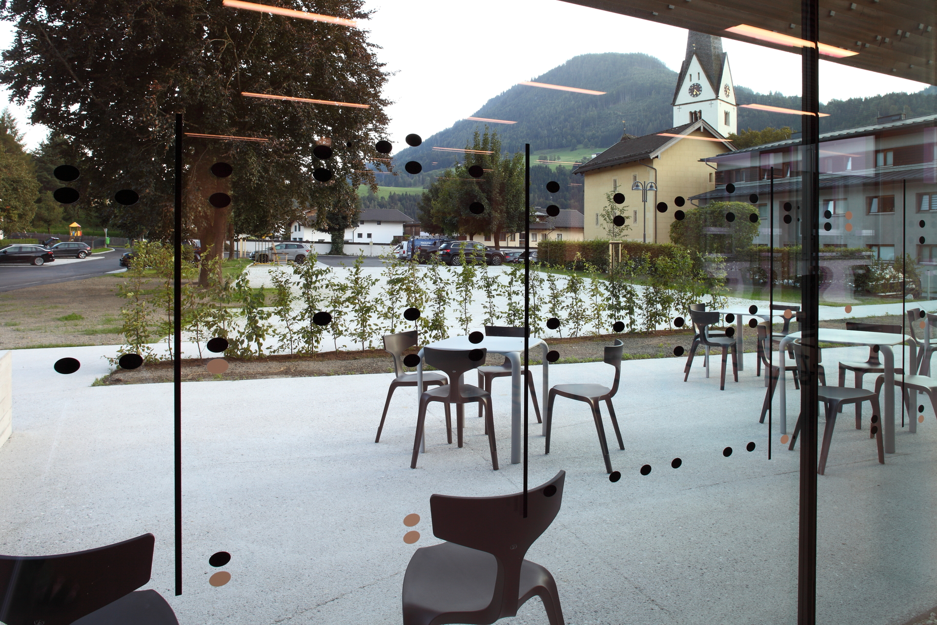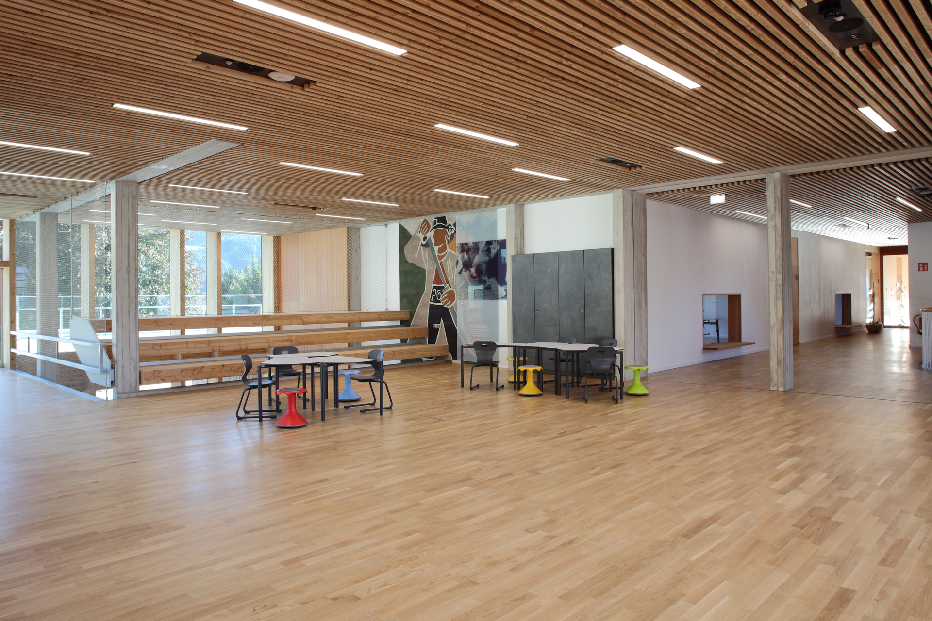 Das gestalterische Ziel war es, Bestand und Zubau zu einem neuen Ganzen zu verschmelzen ohne die Identität der einzelnen Zeithorizonte zu verlieren. Entstanden ist dabei auch Überraschendes, wie die Sitzstufenanlage der Aula im Obergeschoss, die in das darunterliegende Foyer hineinragt oder die adaptierten Klassenräume, die sich nun in die Gangbereiche hinein erweitern. Das Fresko mit einer Darstellung des aus Pfarrwerfen stammenden Freiheitskämpfers Peter Sieberer von der ehemaligen Außenfassade wurde, wie ein Objet trouvé, in die Gestaltung der Aula integriert und um einen zeitgemäßen Kommentar ergänzt.