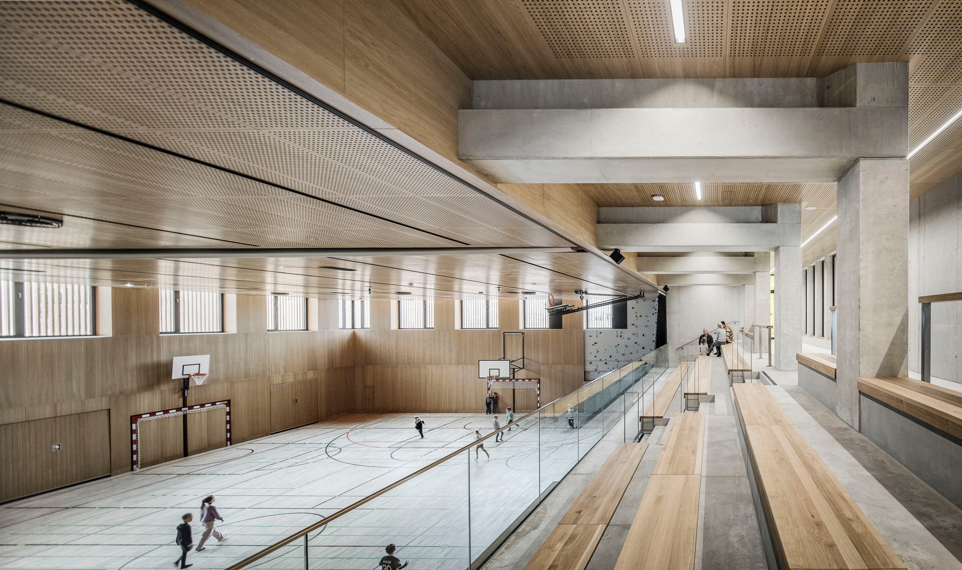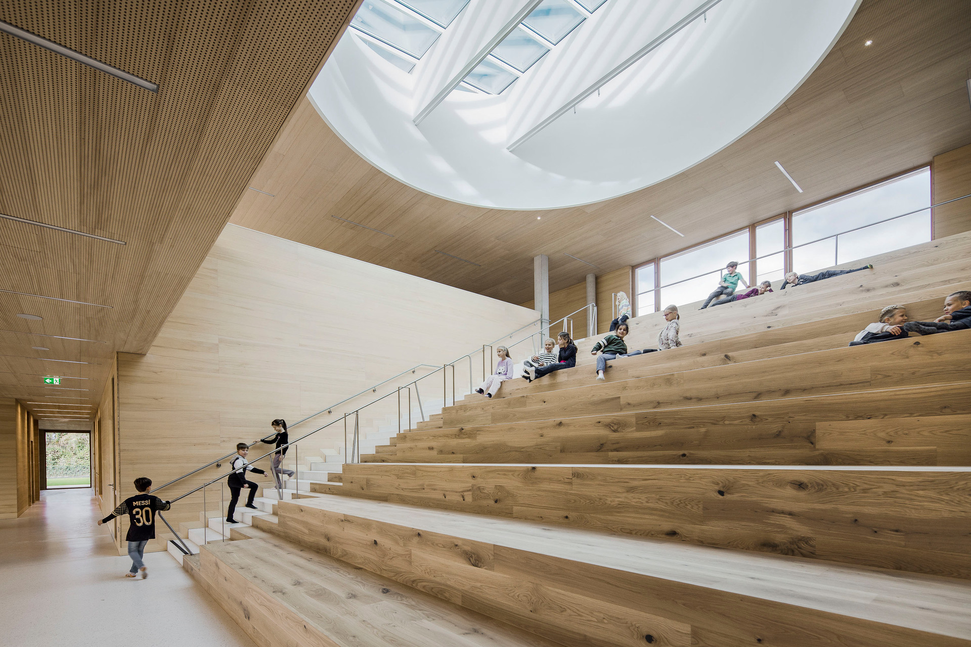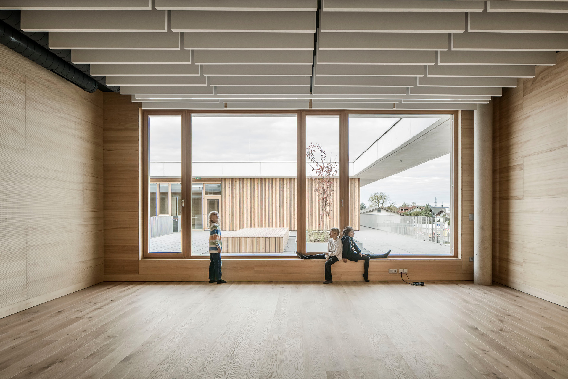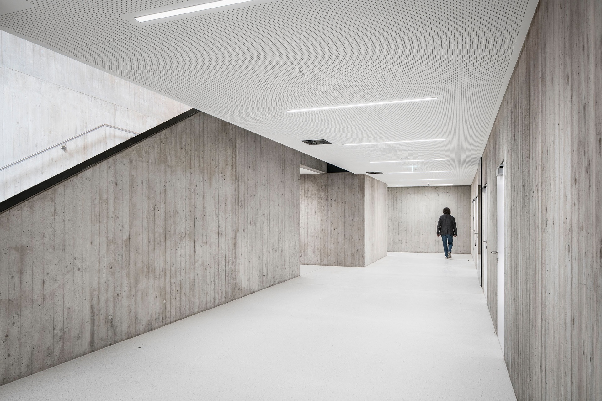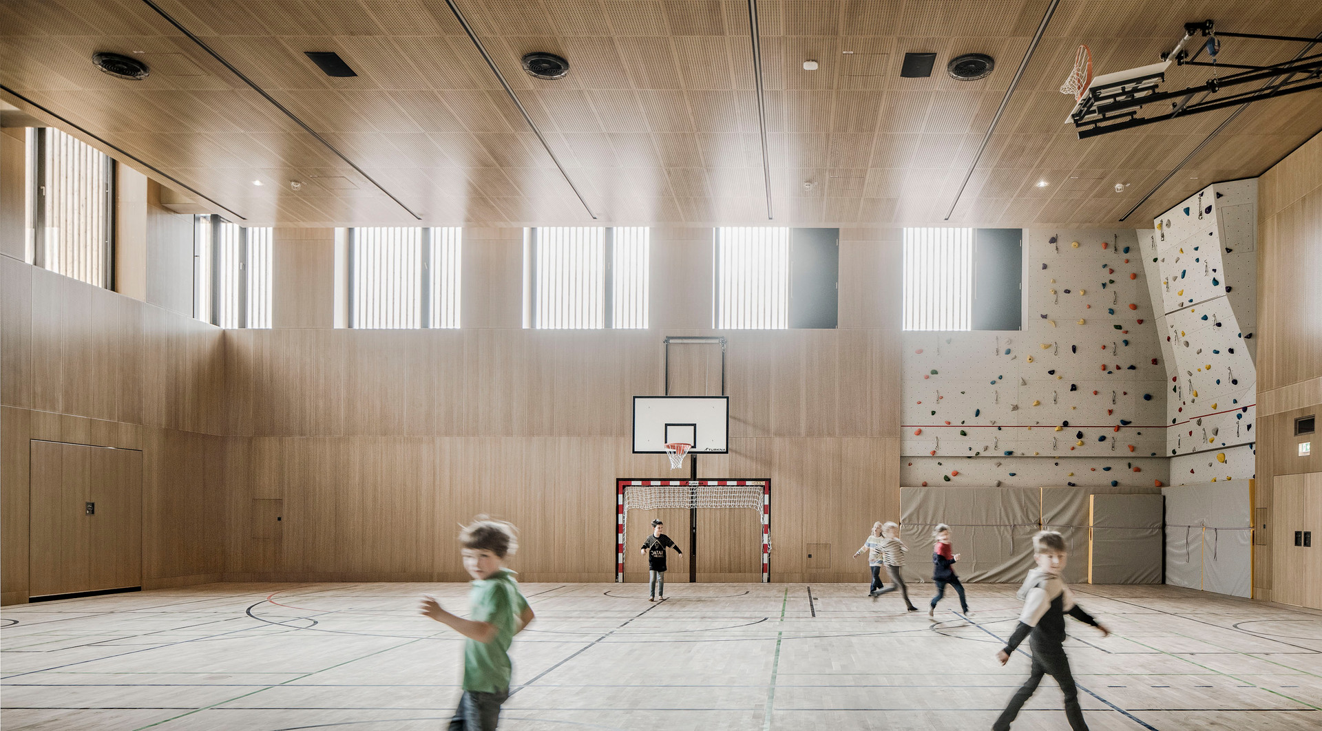 Der im Sinne eines Solitärs konzipierte Neubau für Volksschule, Nachmittagsbetreuung, Musikschule, einer großen auch extern genutzten Turnhalle und weiteren kommunalen Funktionen bildet im Niemandsland am Rande des größten Kasernenareals Österreichs eine identitätsstiftende Adresse. In dieser mit dem Begriff heterogen nur unzulänglich beschriebenen Situation schafft der zweigeschossige Baukörper mit seinem nahezu quadratischen Grundriss eine Ankerpunkt für den ganzen Ort. Über einen großzügigen Vorbereich gelangt man auf einen mit Pfeilern gefassten Vorhof. Sie filtern den Zugang zu den unterschiedlichen Funktionsbereichen und vermitteln gleichzeitig zwischen dem großen Maßstab und den kleinteiligeren Verhältnissen im Inneren. Die differenziert verästelten, zu Clustern zusammengefassten Klassenbereiche im Obergeschoss sind mit gut nutzbaren Außenbereichen optimal verknüpft, sodass sich ein vielfältiges Raumangebot zum Lernen in unterschiedlichen Situationen ergibt. Diese reichen vom abgeschlossenen Klassenzimmer, über offene Lernzonen bis hin zum Freiluftunterricht. Wie schon bei der Volksschule in Großarl hat Thalmeier hier wiederum große Schiebewände geplant, die akustisch wie visuell sowohl eine geschlossene wie auch eine offene, marktplatzartige Lernsituation erlauben. Technisch sind diese großen Schiebeelemente so perfekt ausgeführt, dass sie nicht nur extrem leicht manipulierbar, sondern im geschlossenen Zustand tatsächlich schalldicht sind.