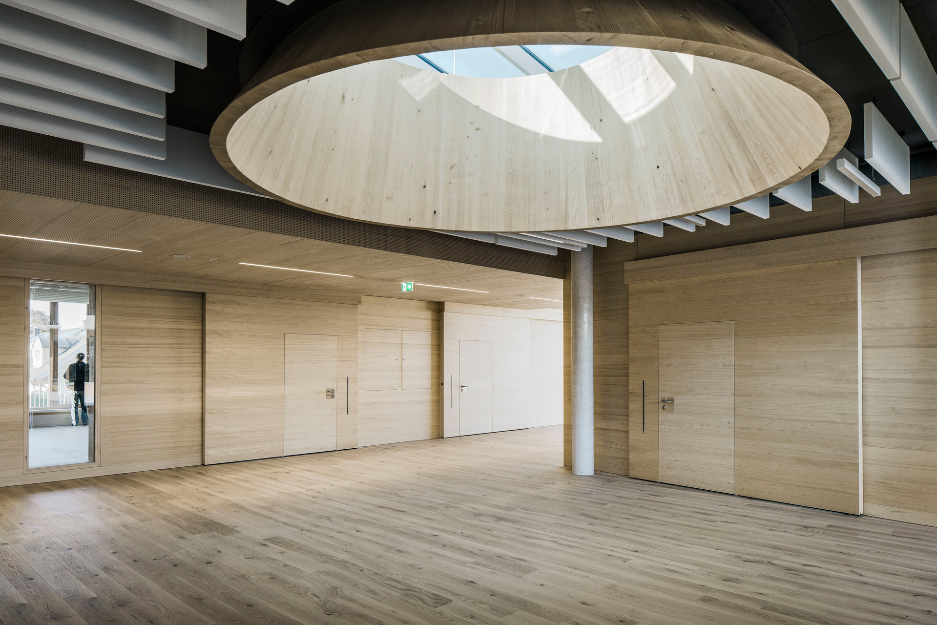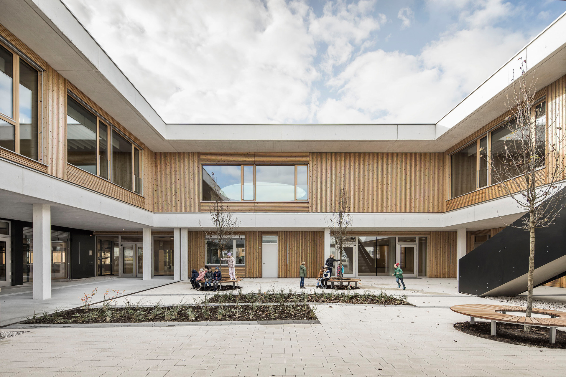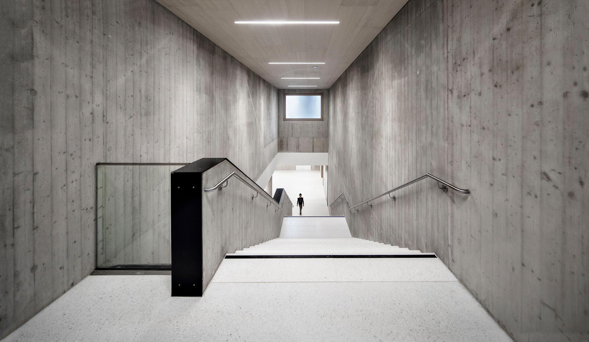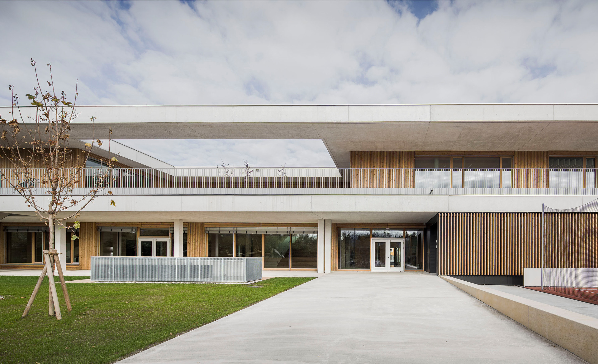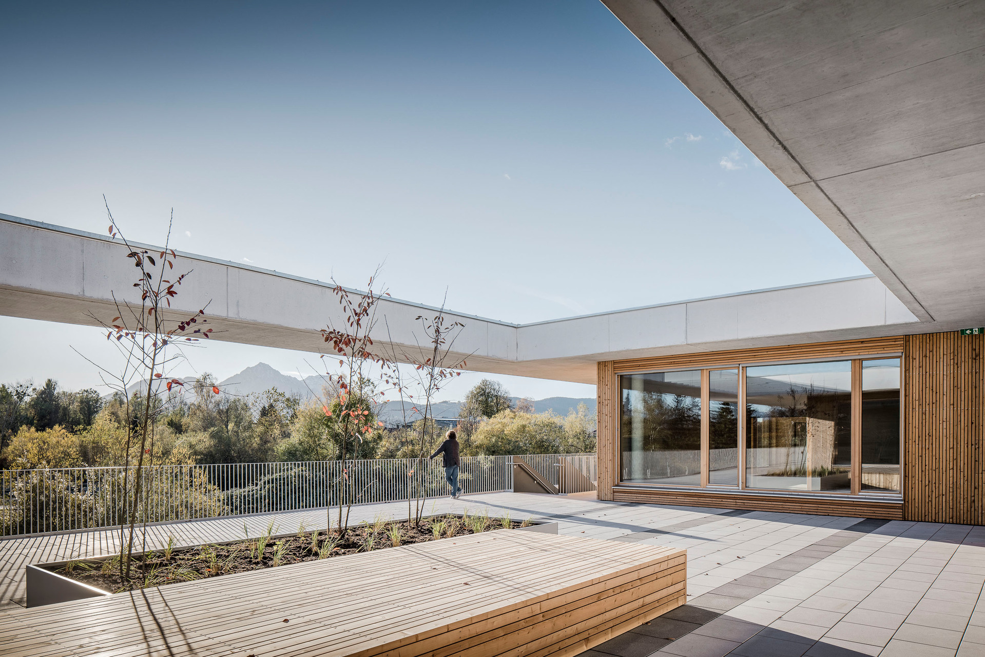 Der im Sinne eines Solitärs konzipierte Neubau für Volksschule, Nachmittagsbetreuung, Musikschule, einer großen auch extern genutzten Turnhalle und weiteren kommunalen Funktionen bildet im Niemandsland am Rande des größten Kasernenareals Österreichs eine identitätsstiftende Adresse. In dieser mit dem Begriff heterogen nur unzulänglich beschriebenen Situation schafft der zweigeschossige Baukörper mit seinem nahezu quadratischen Grundriss eine Ankerpunkt für den ganzen Ort. Über einen großzügigen Vorbereich gelangt man auf einen mit Pfeilern gefassten Vorhof. Sie filtern den Zugang zu den unterschiedlichen Funktionsbereichen und vermitteln gleichzeitig zwischen dem großen Maßstab und den kleinteiligeren Verhältnissen im Inneren. Die differenziert verästelten, zu Clustern zusammengefassten Klassenbereiche im Obergeschoss sind mit gut nutzbaren Außenbereichen optimal verknüpft, sodass sich ein vielfältiges Raumangebot zum Lernen in unterschiedlichen Situationen ergibt. Diese reichen vom abgeschlossenen Klassenzimmer, über offene Lernzonen bis hin zum Freiluftunterricht. Wie schon bei der Volksschule in Großarl hat Thalmeier hier wiederum große Schiebewände geplant, die akustisch wie visuell sowohl eine geschlossene wie auch eine offene, marktplatzartige Lernsituation erlauben. Technisch sind diese großen Schiebeelemente so perfekt ausgeführt, dass sie nicht nur extrem leicht manipulierbar, sondern im geschlossenen Zustand tatsächlich schalldicht sind.