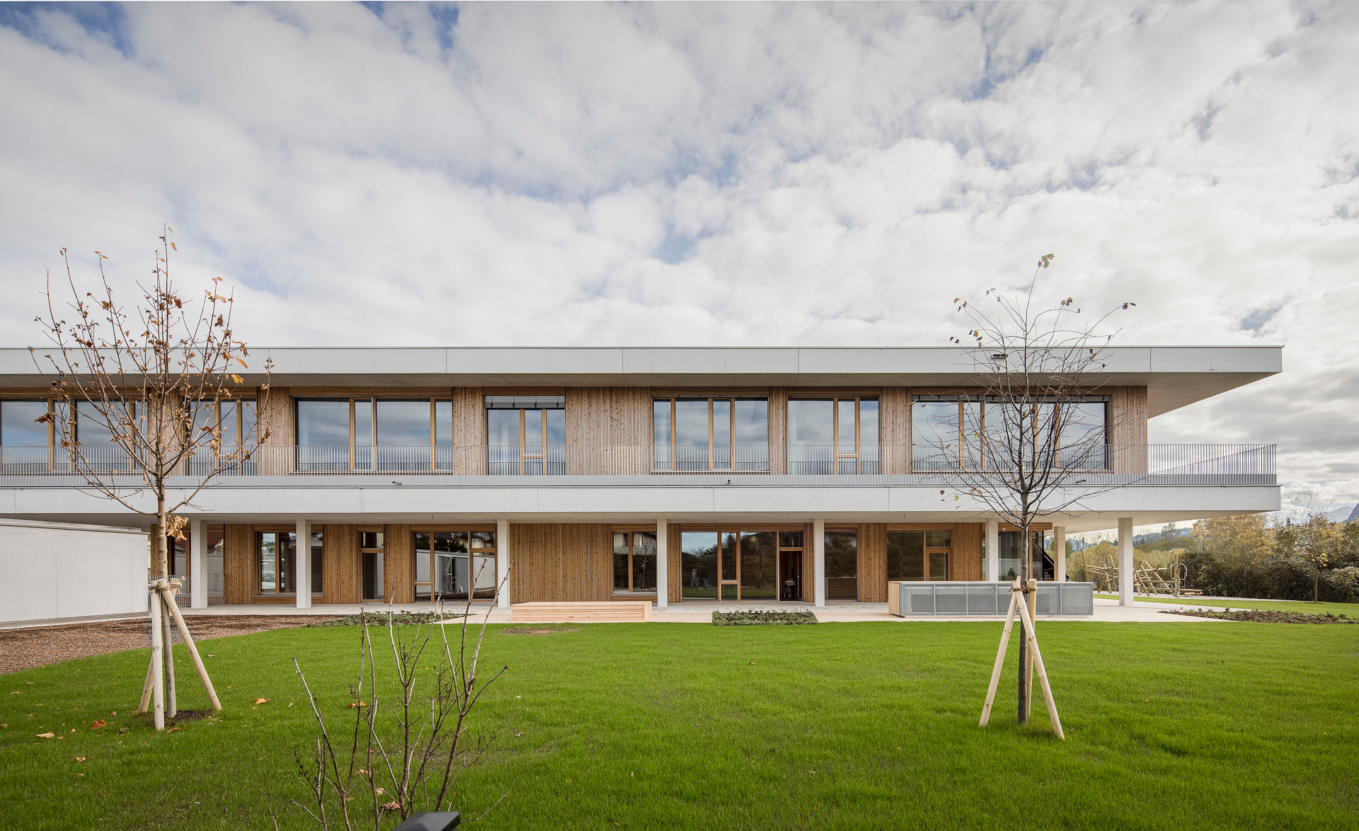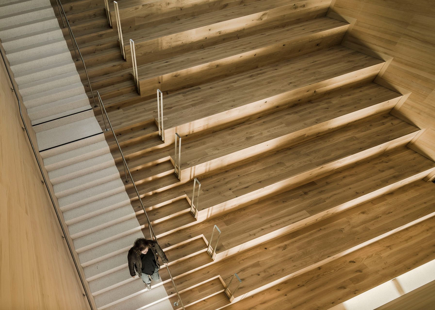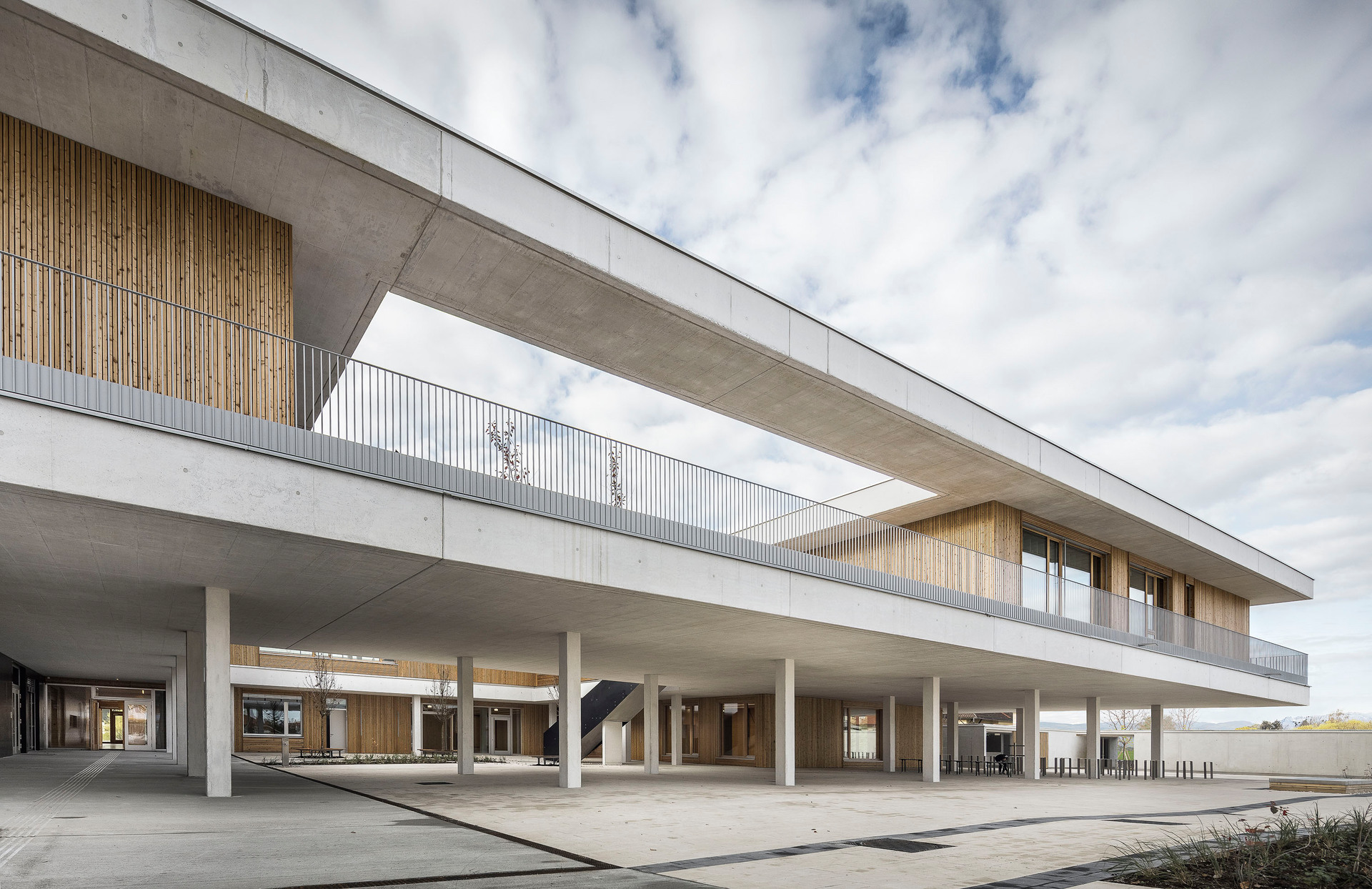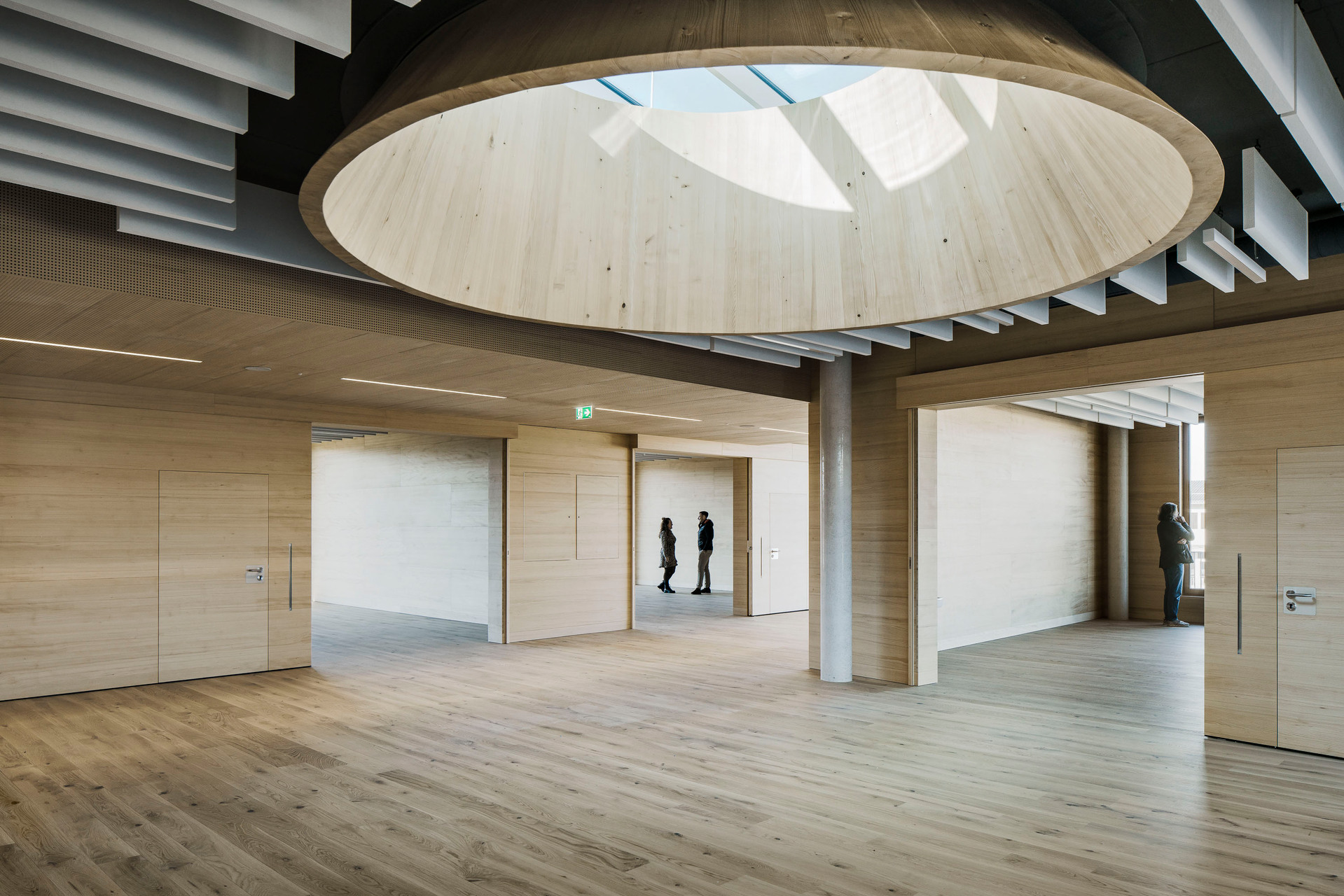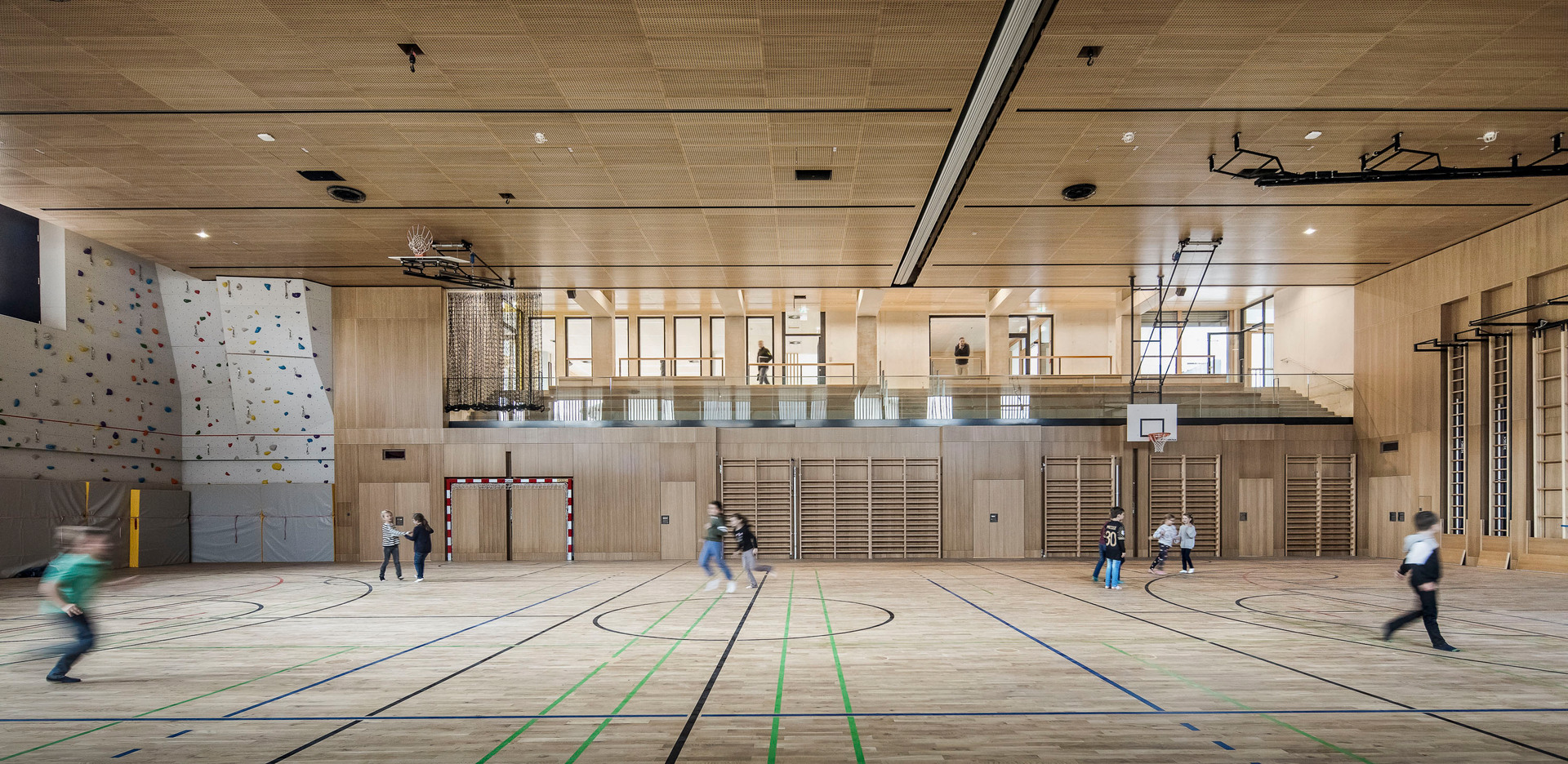 Der im Sinne eines Solitärs konzipierte Neubau für Volksschule, Nachmittagsbetreuung, Musikschule, einer großen auch extern genutzten Turnhalle und weiteren kommunalen Funktionen bildet im Niemandsland am Rande des größten Kasernenareals Österreichs eine identitätsstiftende Adresse. In dieser mit dem Begriff heterogen nur unzulänglich beschriebenen Situation schafft der zweigeschossige Baukörper mit seinem nahezu quadratischen Grundriss eine Ankerpunkt für den ganzen Ort. Über einen großzügigen Vorbereich gelangt man auf einen mit Pfeilern gefassten Vorhof. Sie filtern den Zugang zu den unterschiedlichen Funktionsbereichen und vermitteln gleichzeitig zwischen dem großen Maßstab und den kleinteiligeren Verhältnissen im Inneren. Die differenziert verästelten, zu Clustern zusammengefassten Klassenbereiche im Obergeschoss sind mit gut nutzbaren Außenbereichen optimal verknüpft, sodass sich ein vielfältiges Raumangebot zum Lernen in unterschiedlichen Situationen ergibt. Diese reichen vom abgeschlossenen Klassenzimmer, über offene Lernzonen bis hin zum Freiluftunterricht. Wie schon bei der Volksschule in Großarl hat Thalmeier hier wiederum große Schiebewände geplant, die akustisch wie visuell sowohl eine geschlossene wie auch eine offene, marktplatzartige Lernsituation erlauben. Technisch sind diese großen Schiebeelemente so perfekt ausgeführt, dass sie nicht nur extrem leicht manipulierbar, sondern im geschlossenen Zustand tatsächlich schalldicht sind.