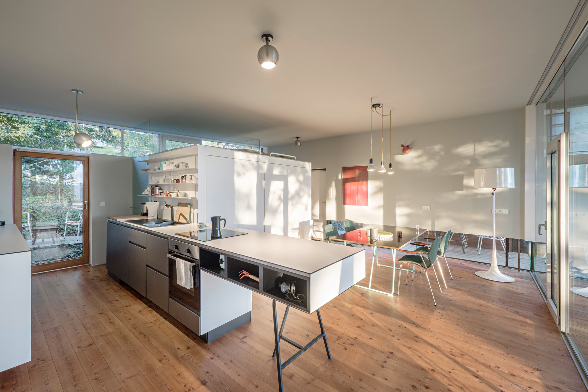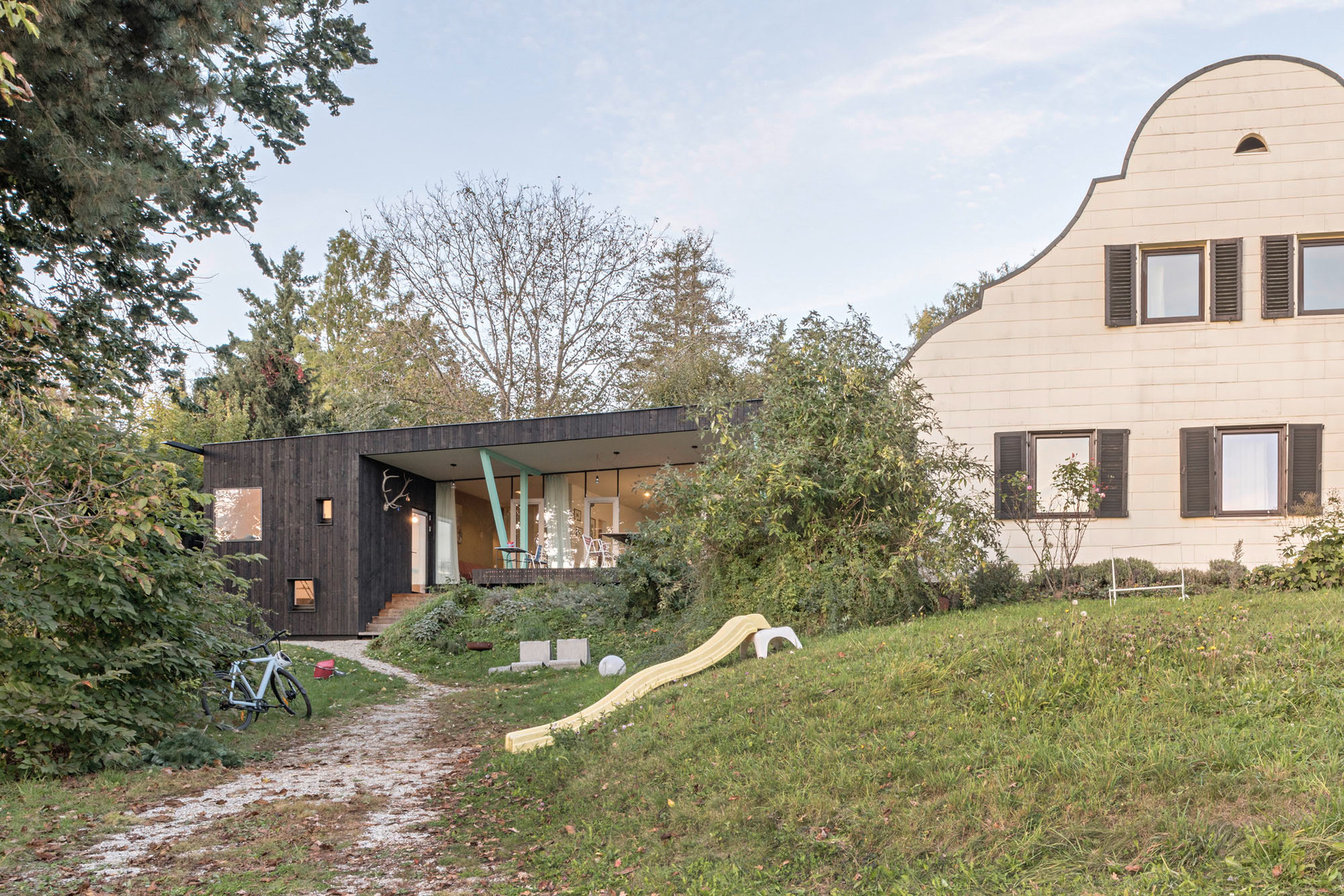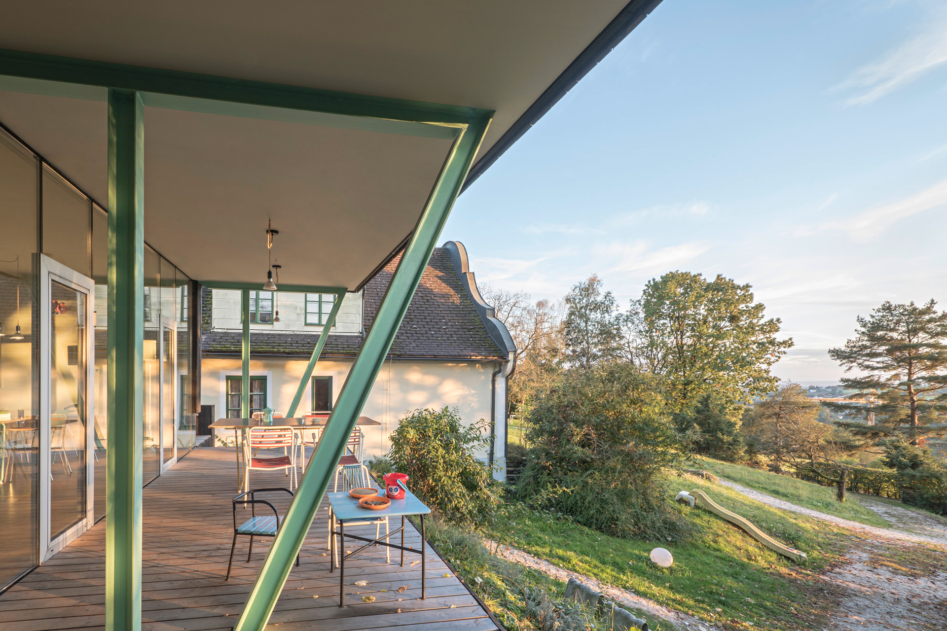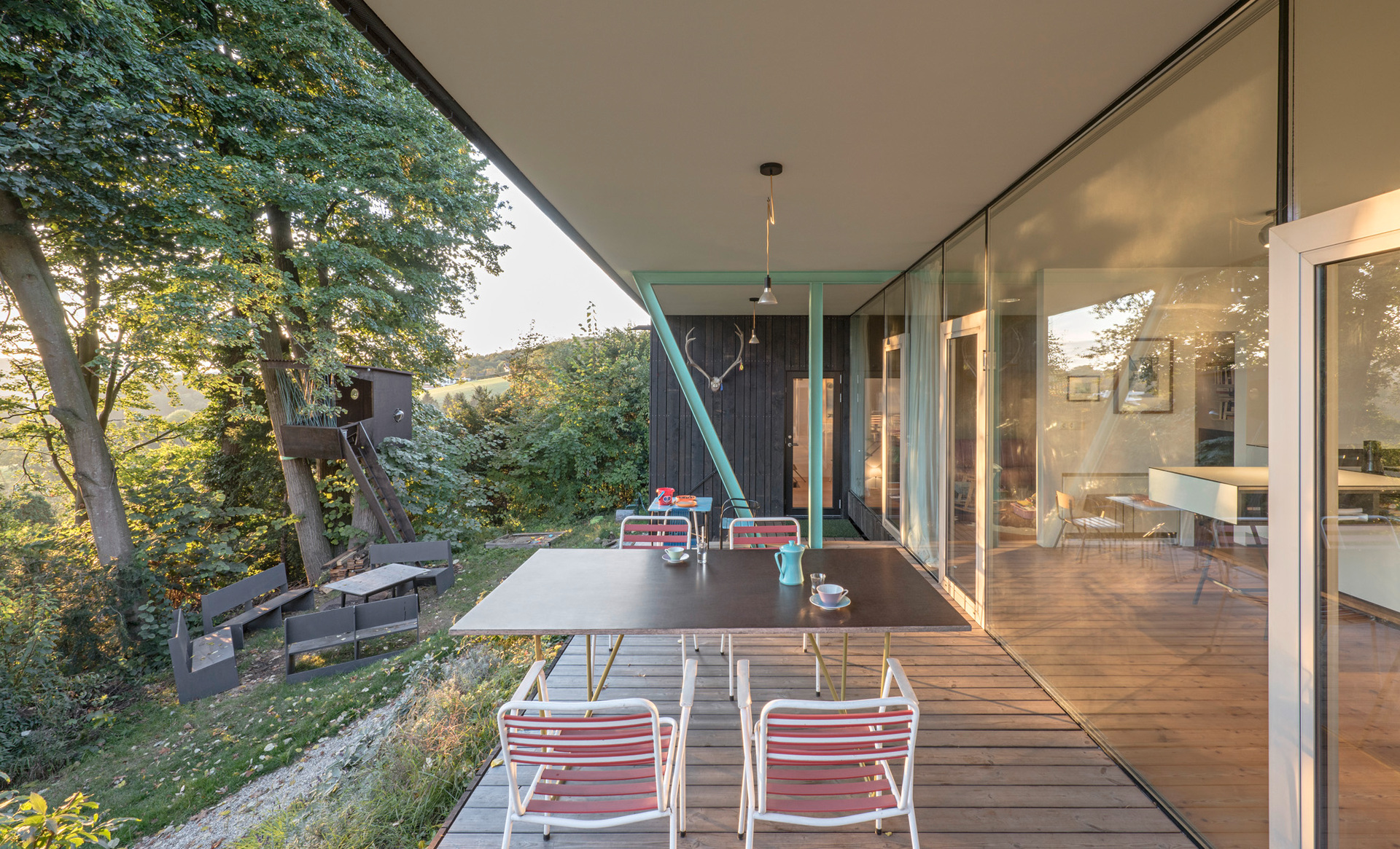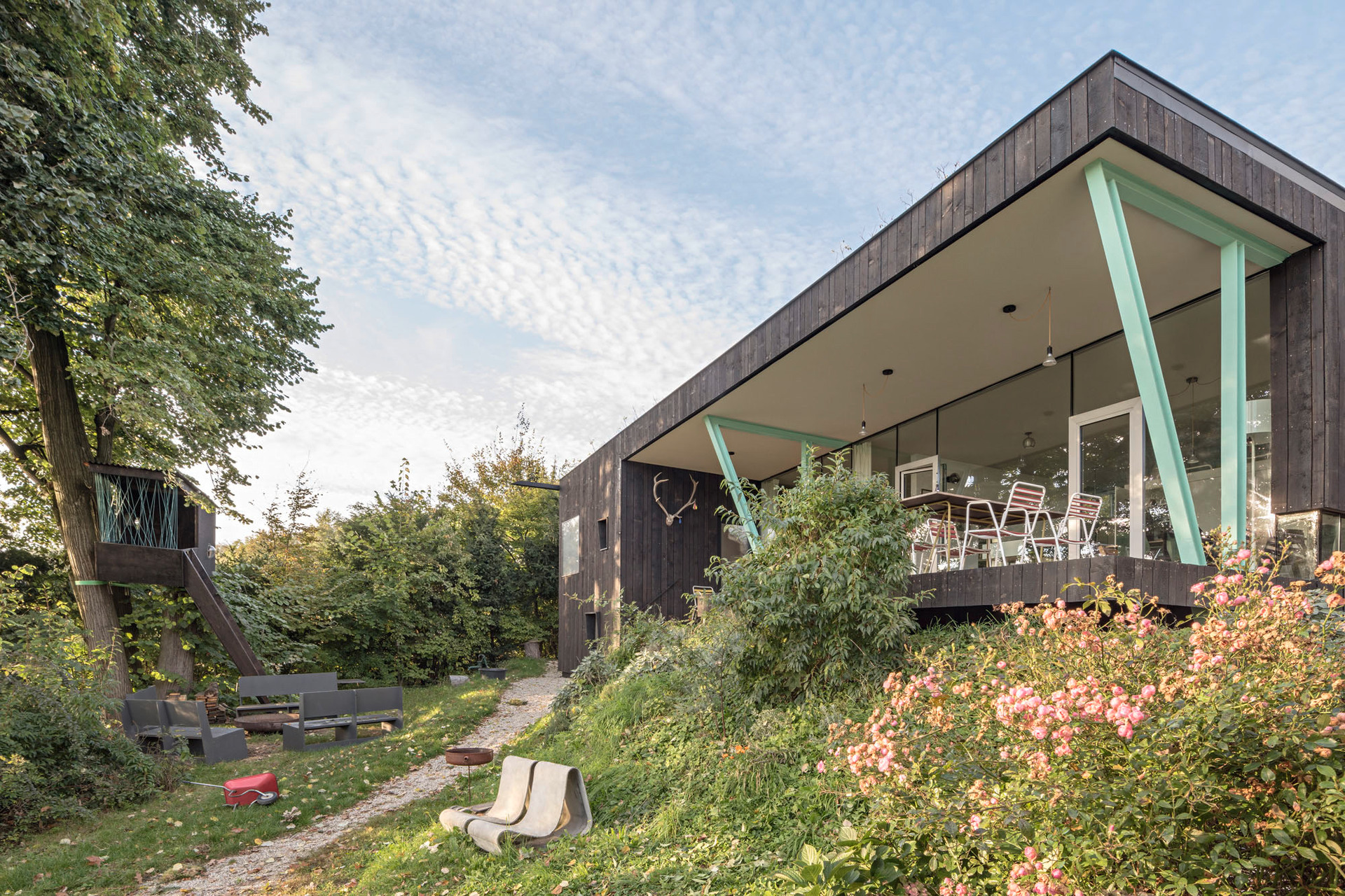 2020 folgte dann nach Familienzuwachs die Erweiterung und Ertüchtigung der kleinen Wohneinheit; diesmal mit vorgefertigten, mit Recyclingdämmstoff gefüllten Holzriegelbau-Wand- und Deckenelementen. Die LKW-Plane wurde entfernt und gegen eine diffusionsoffene Unterspannbahn getauscht. Über der Gesamtkonstruktion wurde eine entsprechende Hinterlüftungsebene angebracht. Südseitig wurde eine überdachte Terrasse angebaut, die zur optischen – und in den Sommermonaten auch physischen – Vergrößerung des Wohnraums beiträgt. Das Vordach sorgt für Sonnenschutz, lediglich in den Wintermonaten bringt direkter Sonnenschein den gewünschten Wärmeeintrag. (Text: Architekten, bearbeitet)