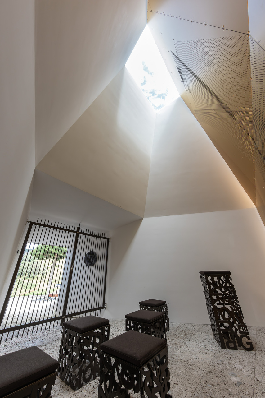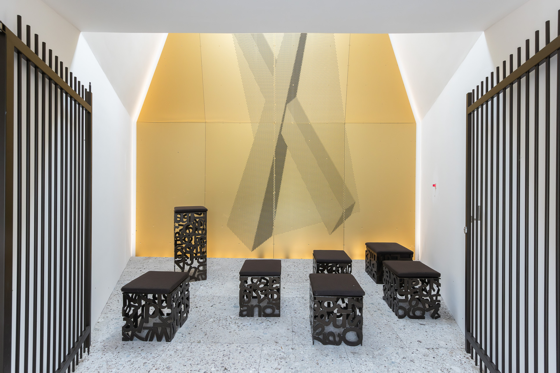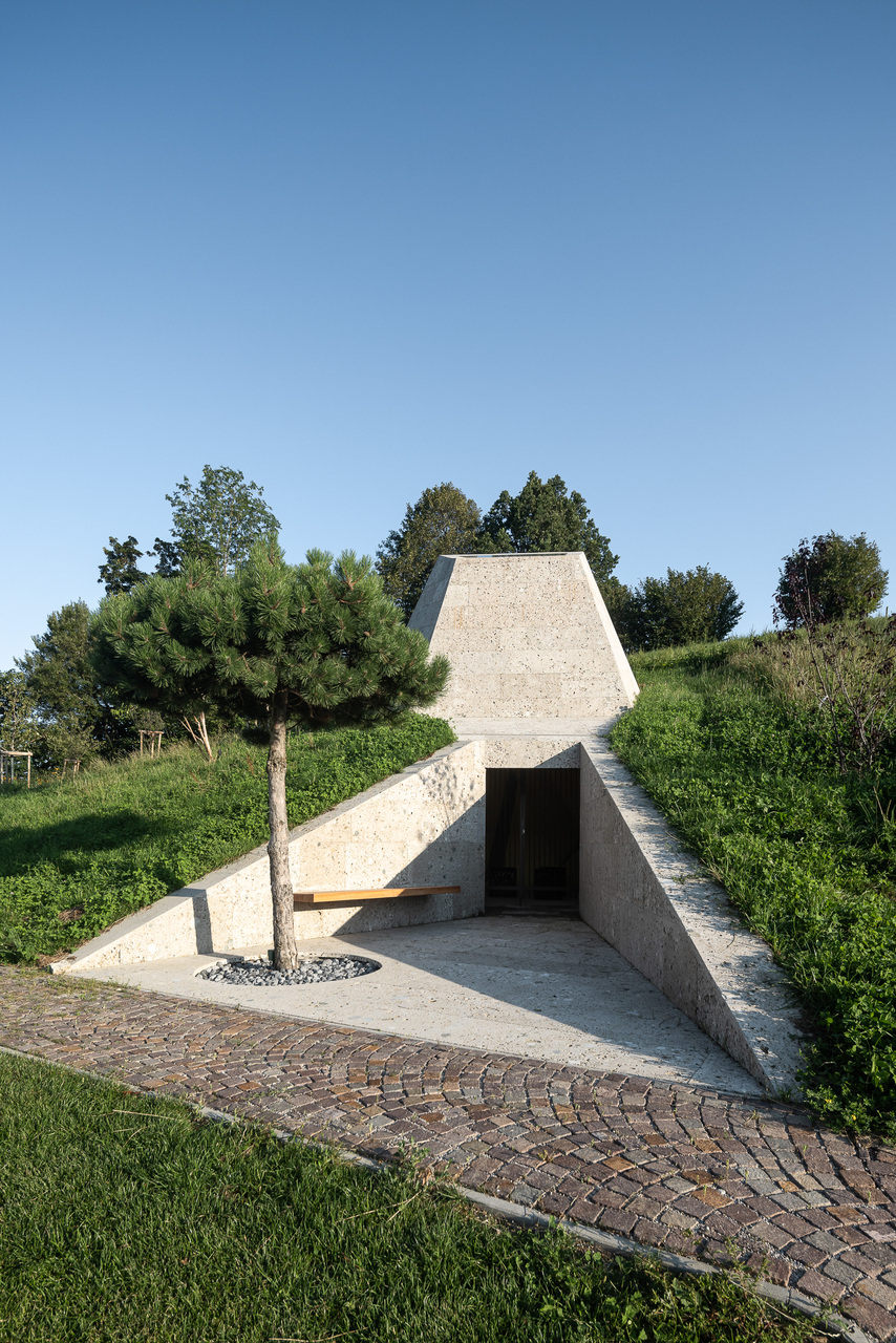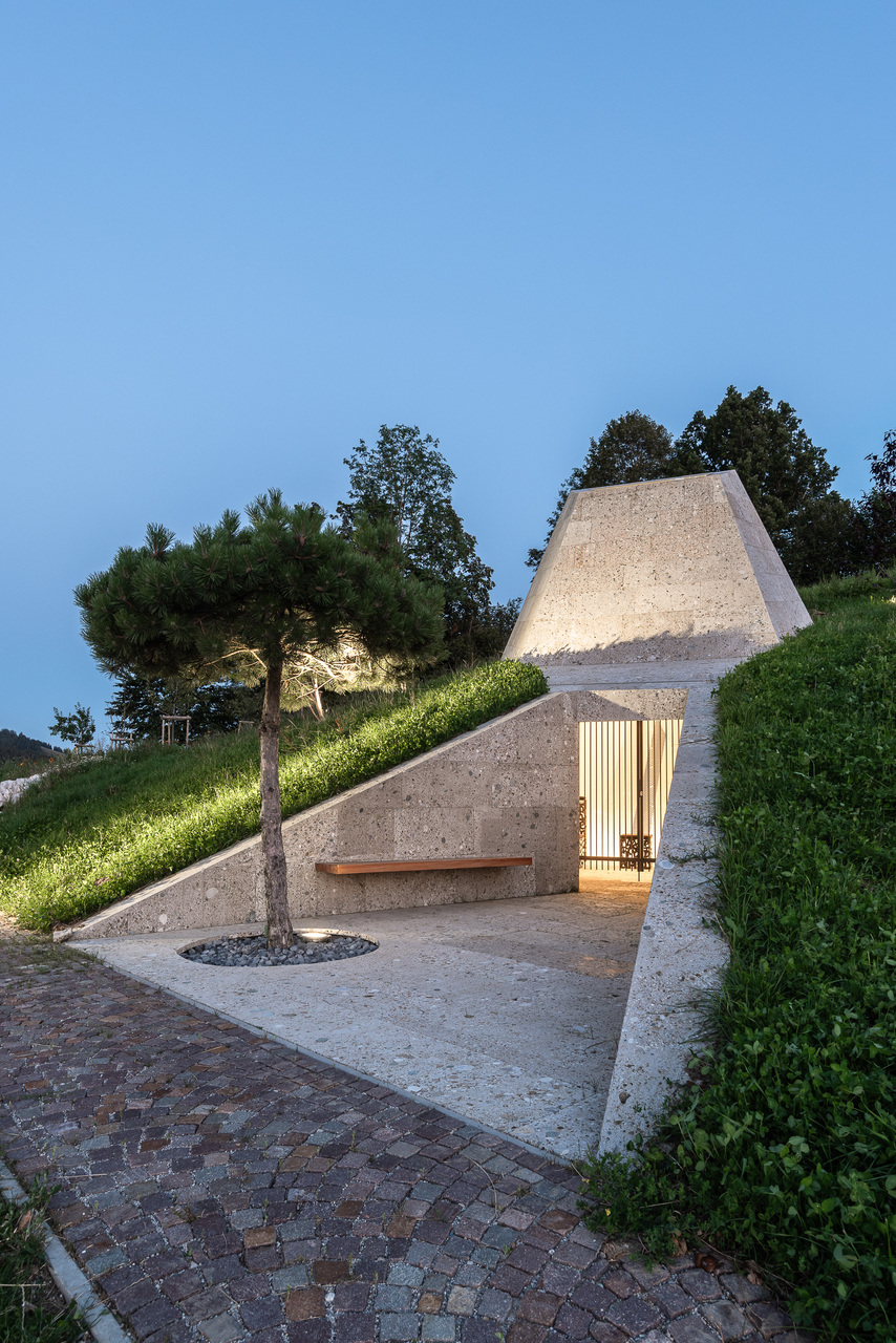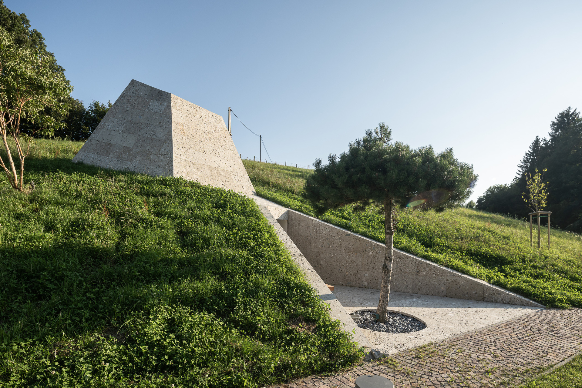 Zentrales Gestaltungselement ist die Lichtführung: Natürliches Licht tritt über ein Oberlicht sowie ein seitlich positioniertes Fenster in den Raum ein und lenkt die Aufmerksamkeit auf den Altarbereich. Die Architektur der Andreaskapelle rückt die räumlich-atmosphärische Wirkung, die Inszenierung des Lichts und den Bezug zur Umgebung in den Fokus. Auf ikonografische oder dekorative Elemente wurde bewusst verzichtet. (Text: Architekt:innen, bearbeitet)